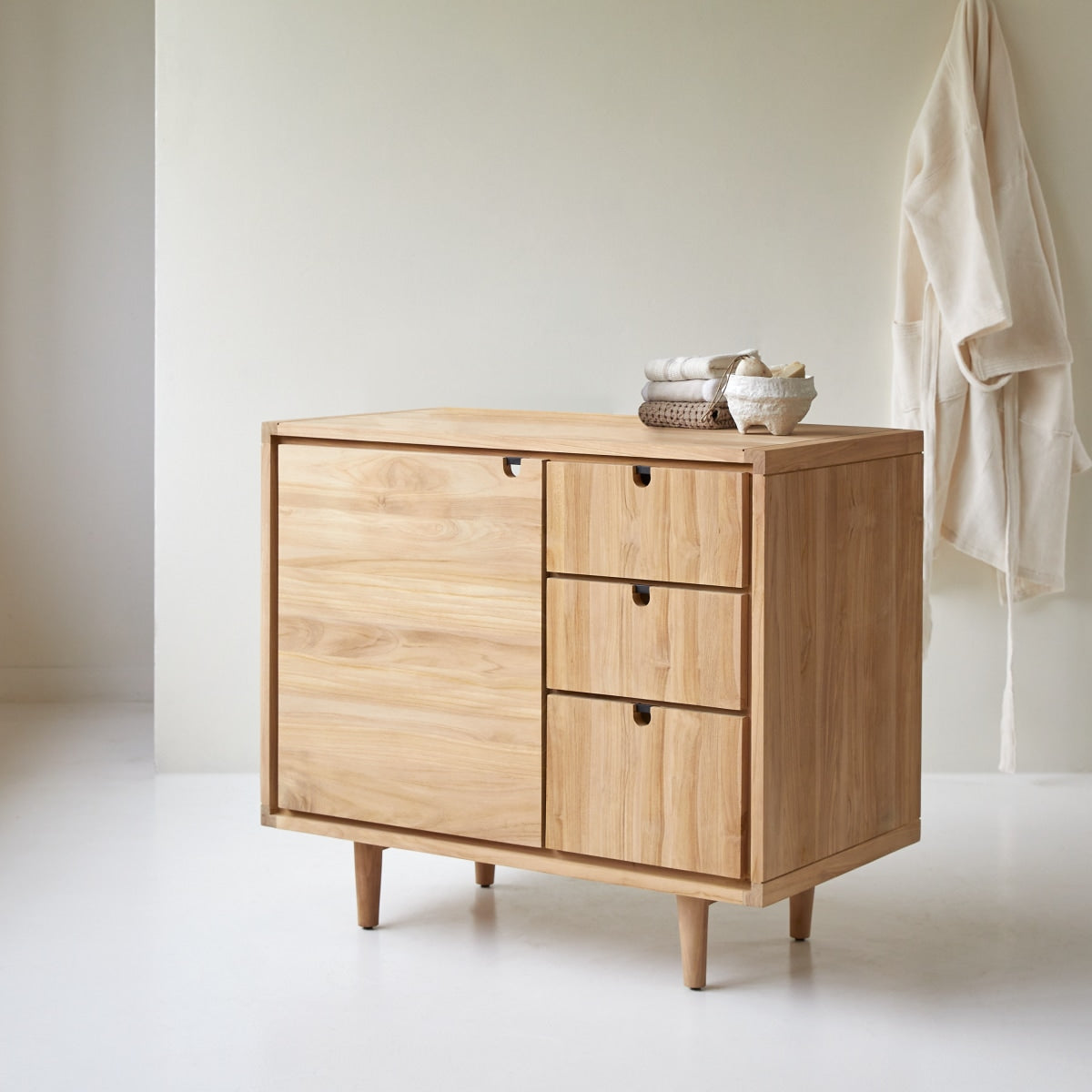 Het massief teakhouten Jonàk opbergmeubel met hedendaags Scandinavisch ontwerp is buitengewoon functioneel. Dit mooie en tegelijke praktische meubel biedt heel wat opbergruimte voor handdoeken, schoonheidsproducten en accessoires. Afhankelijk van uw behoeften kunt u het gebruiken met een wastafel of luierplank.