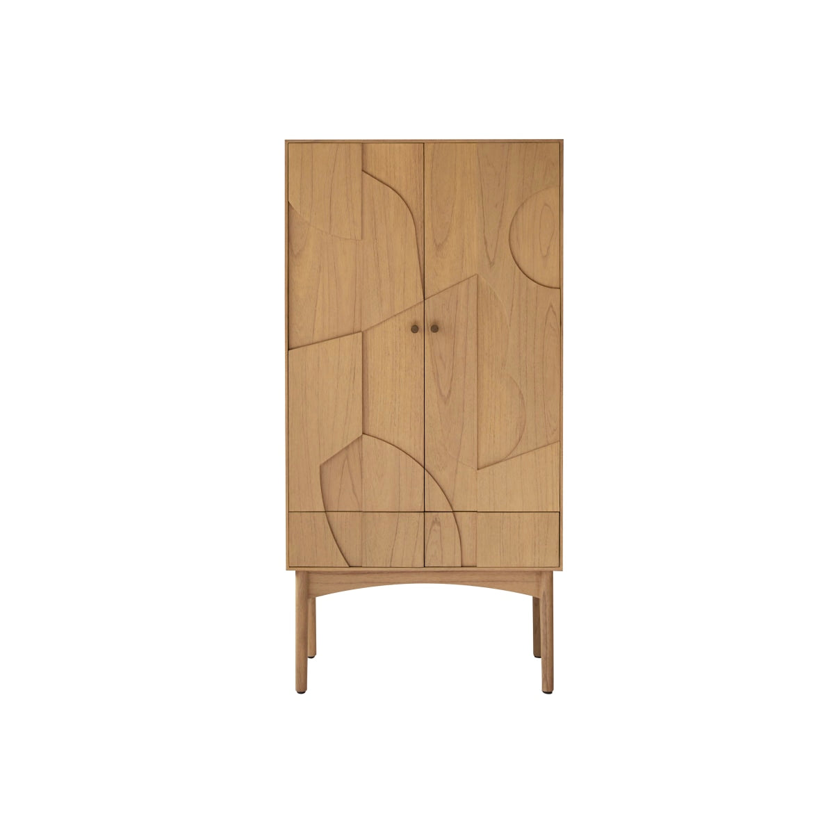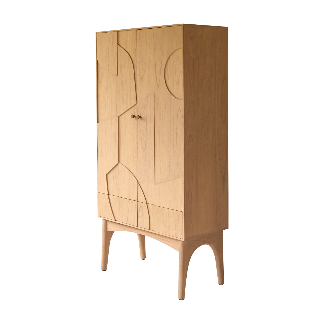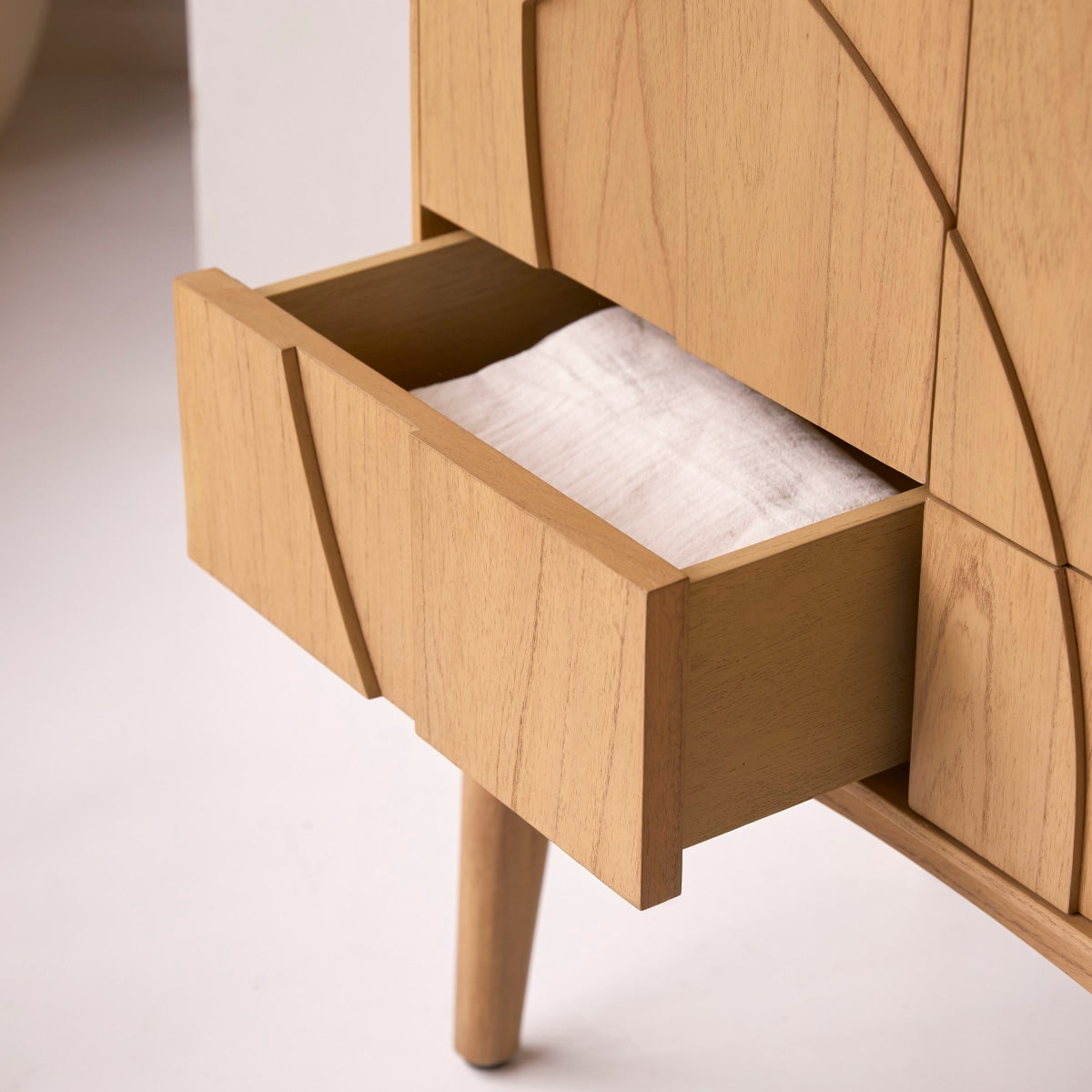 Een front met originele, grafische uitsnijdingen, poten met gebogen lijnen voor een moderne look en veel opbergruimte: het prachtige Otho dressoir in massief mindihout heeft alles waar u zo van houdt! Het onderstel met fijne lijnen laat het geheel lichter lijken, door het lichte hout past hij bij een Scandinavische of naturelle natuurlijke inrichting, enz. Het dressoir is ideaal om er serviesgoed of tafellinnen in op te bergen in de eetkamer of de keuken, maar staat ook heel fraai in andere kamers van het huis: in de slaapkamer biedt hij plaats aan beddengoed, in een ruime hal is het een garderobe om de onmisbare mutsen, hoeden, schoenen en tassen op te bergen,
