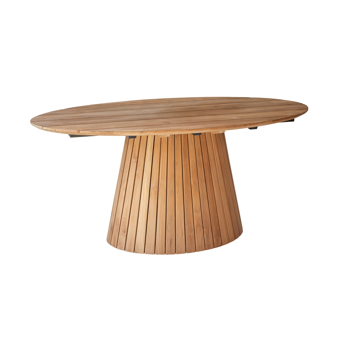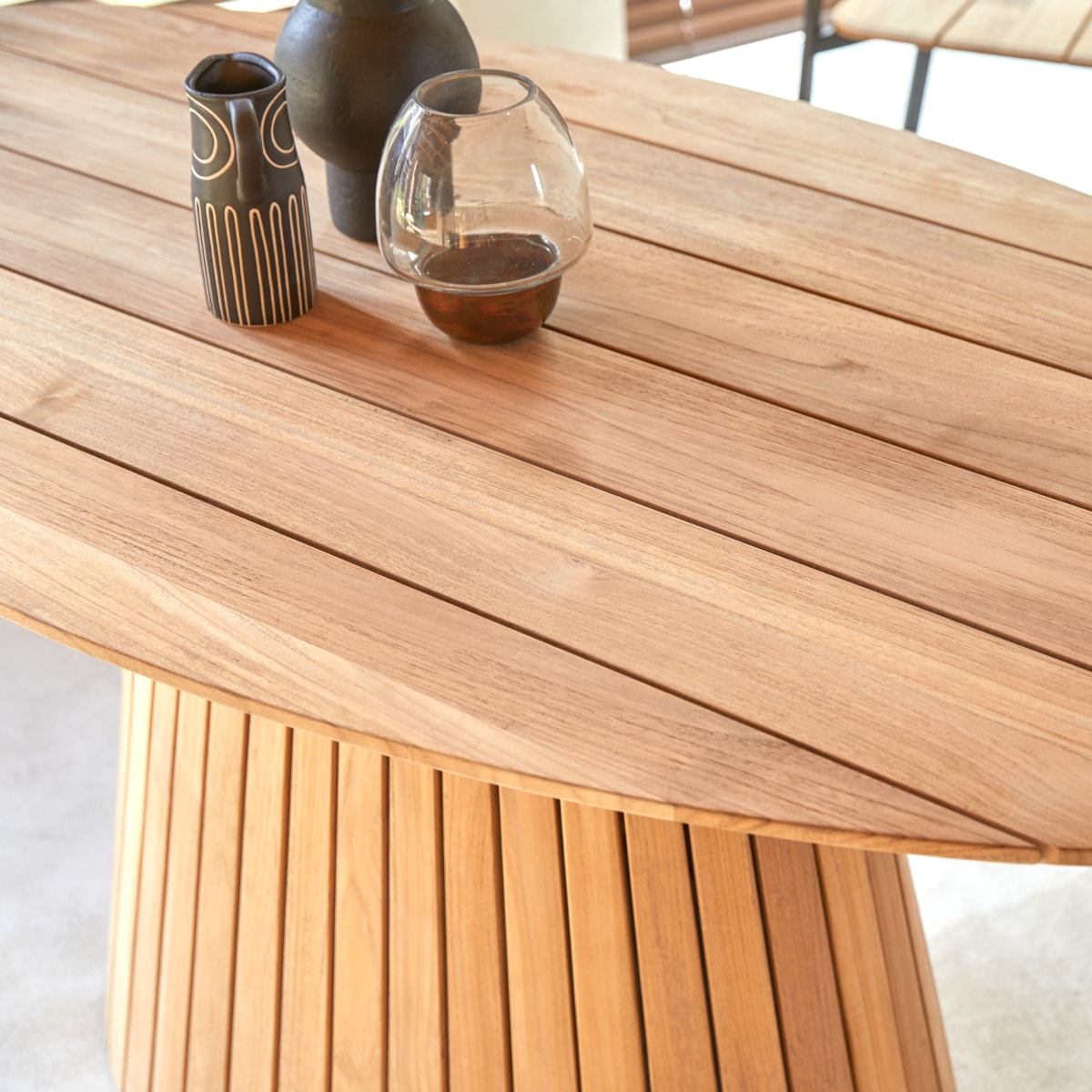 De uitnodigende ovale Paloma-tafel van massief teakhout heeft een uniek ontwerp en ruime afmetingen: een tafel die niet onopgemerkt blijft in hedendaagse interieurs! We houden van de imposante centrale voet die plaats biedt aan 6 personen en het mooie blad van latten met een metalen onderkant. Een massief teakhouten tafel met het FSC®-label, wat betekent dat het hout dat voor de tafel is gebruikt, afkomstig is uit duurzaam beheerde bossen.