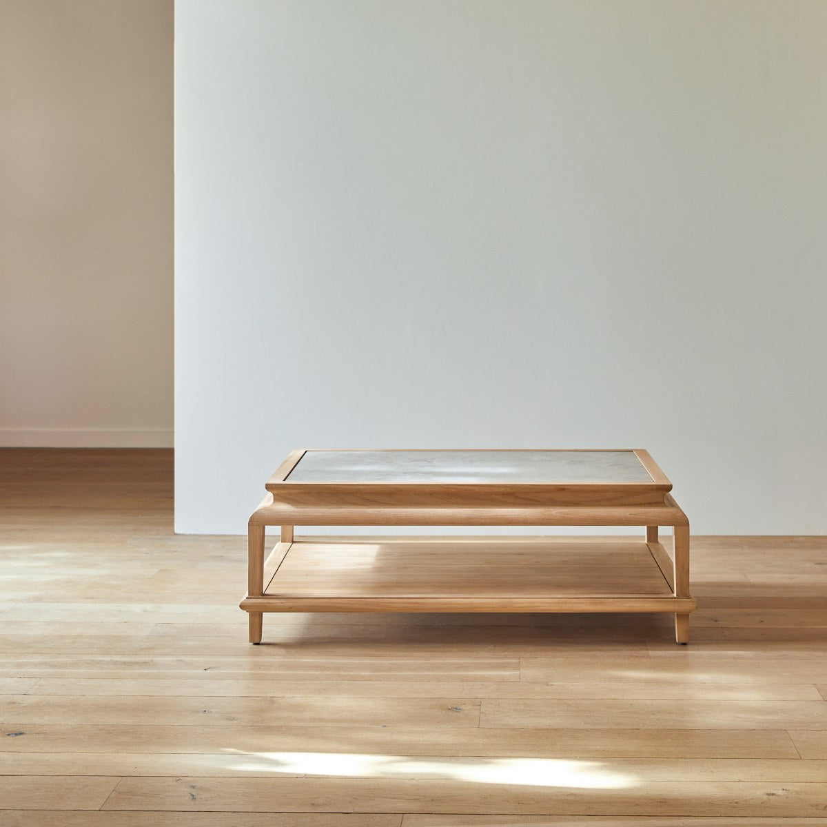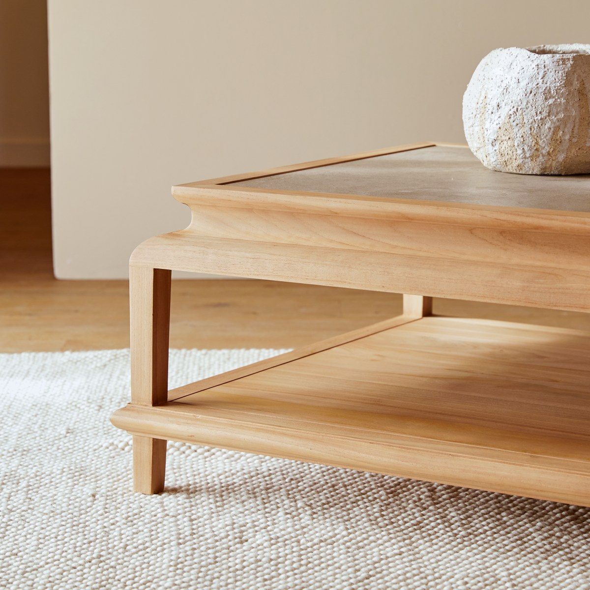 De Achille salontafel van massief FSC®-teakhout en steen belichaamt tijdloos design en ambachtelijke knowhow. Dit meubelstuk is gemaakt van onbewerkt teakhout met FSC®-certificering en afgewerkt met een blad van lichtgrijze keramiek. Het geniet geavanceerde technieken uit de meubelmakerij die doen denken aan de consoletafels van vroeger en zorgt zo voor een vleugje duurzaamheid en elegantie in elk interieur.