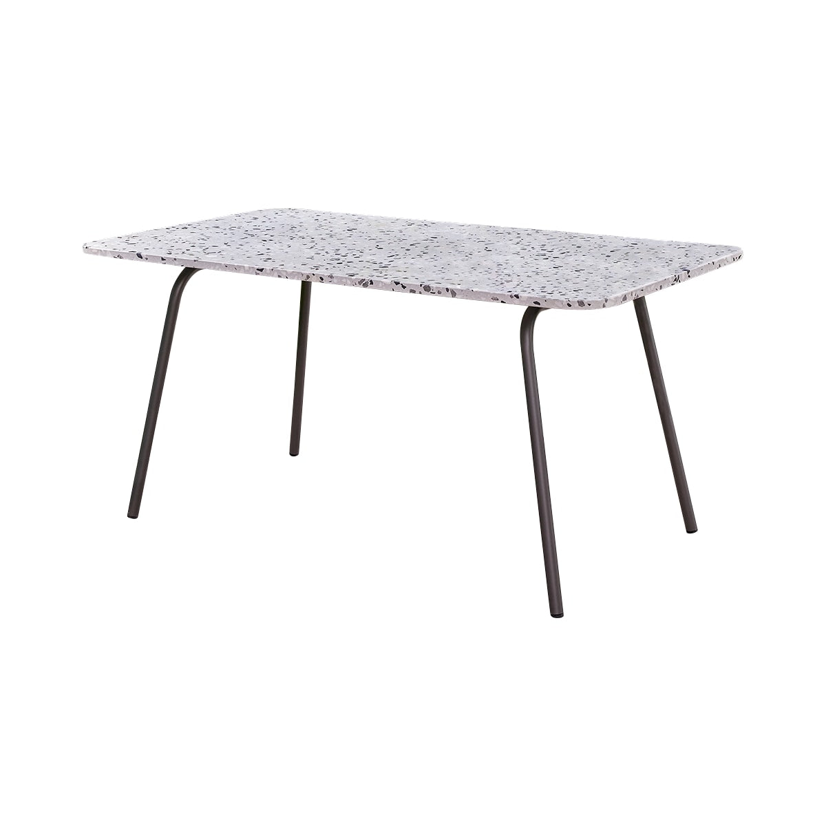 De grijze rechthoekige tuintafel Elio heeft een helder, premium terrazzo blad, zachte afgeronde hoeken en een eigentijds ontwerp. Gemakkelijk schoon te maken (een vochtige spons en klaar!), en goed te combineren met de donkergrijze metalen Arty-stoelen en donkergrijze metalen Arty-leunstoelen voor maaltijden in de tuin met familie of vrienden. De tafel is ideaal voor 6 gasten en wordt gegarandeerd de perfecte metgezel voor mooie momenten op zonnige dagen!