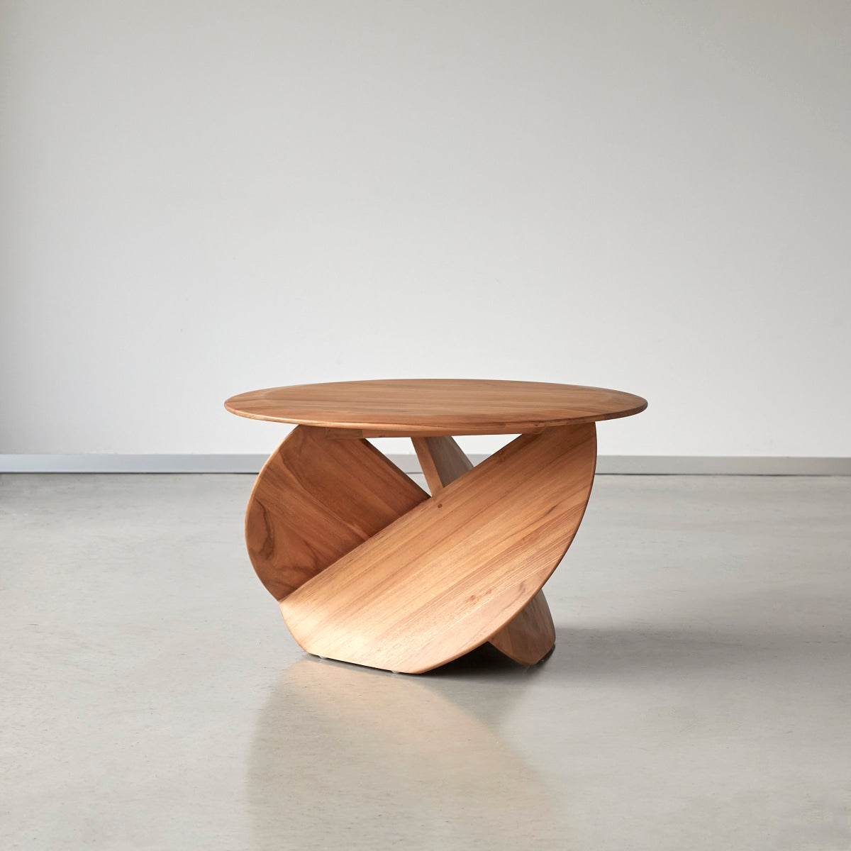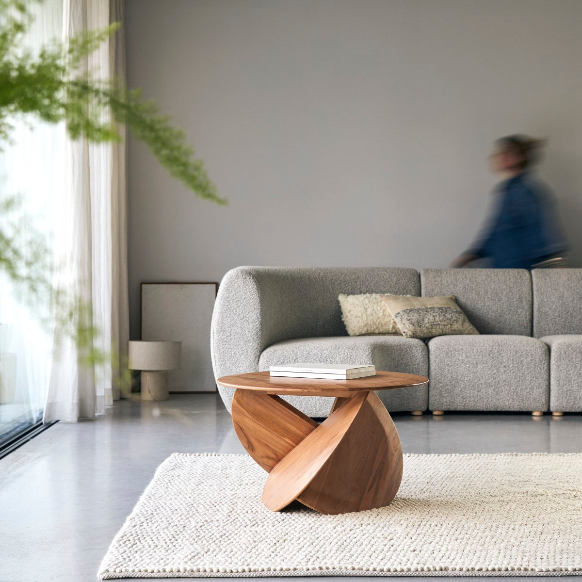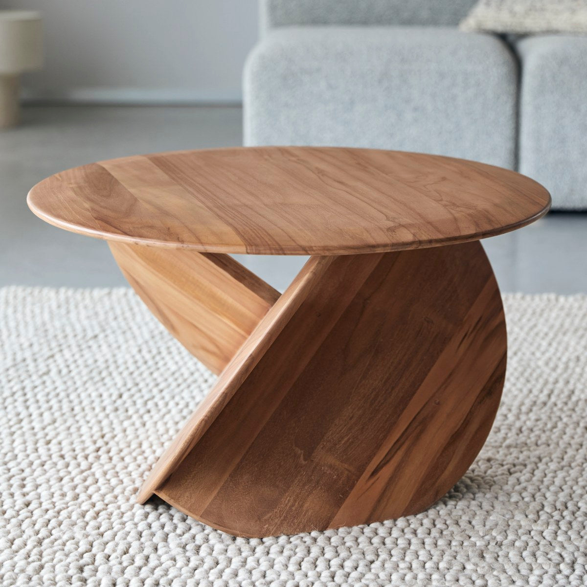 De ronde Gonzague salontafel in massief teak met een blad van 70 cm en stijlvol onderstel oogt tegelijk eenvoudig en modern. Dit model, met gelakte afwerking voor onderhoudsgemak, is perfect voor kleine ruimtes.