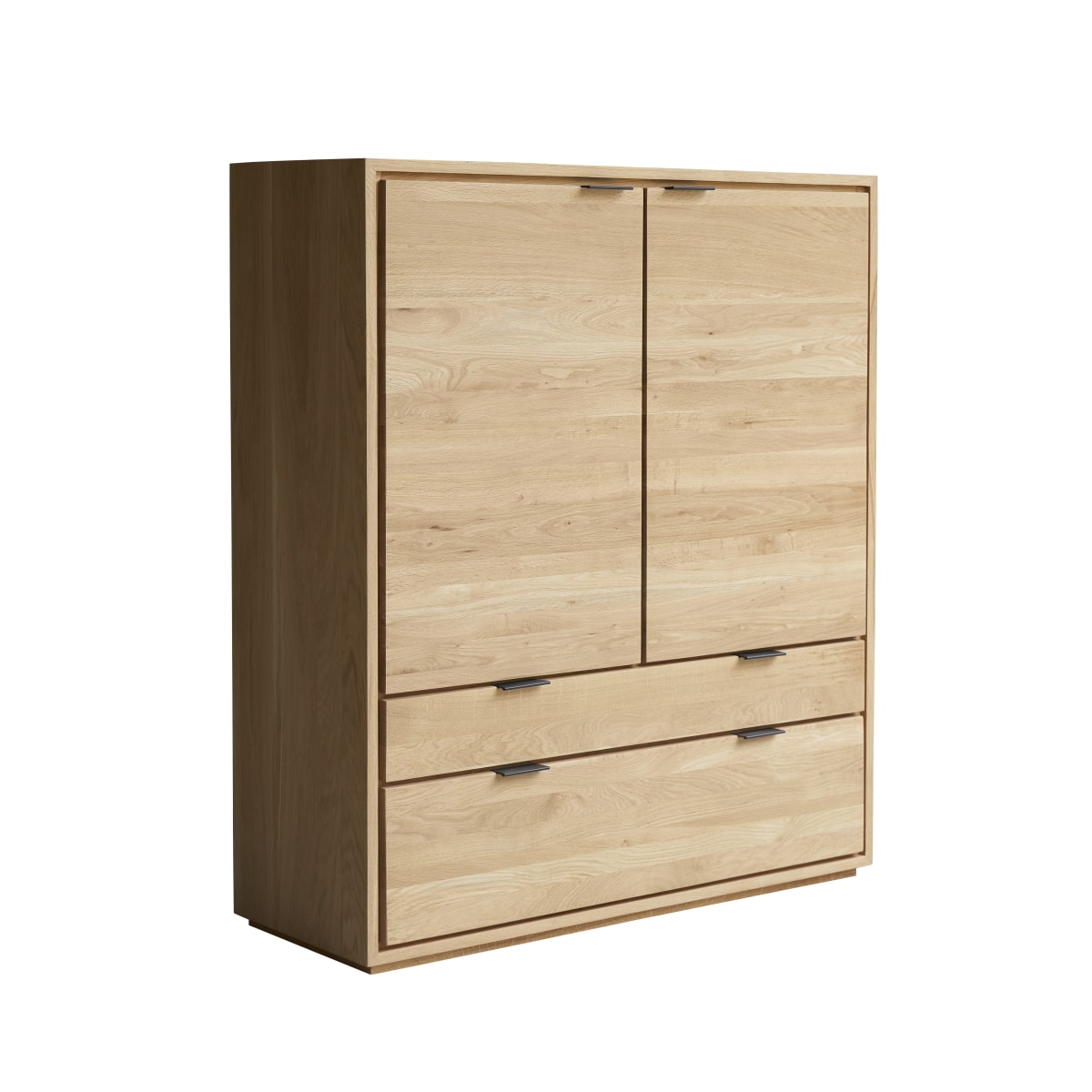 De authentieke stijl van FSC® gecertificeerd massief eikenhout en de geoliede behandeling die beschermt en tegelijkertijd de schoonheid van het hout laat doorschijnen, maken dit tot een essentieel, op de natuur geïnspireerd stuk interieurdesign. Deze kast met zijn grote inhoud heeft een blokvorm die lichter lijkt door een slank frame, waardoor het opbergmeubel fraai oogt, zowel in de slaapkamer als in de eetkamer!In de ene kamer bergt u er uw kleding in op (handige lades voor sokken, ondergoed en nachtkleding) en in de andere kamer uw servies en tafellinnen.