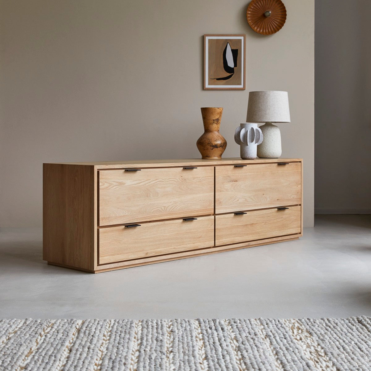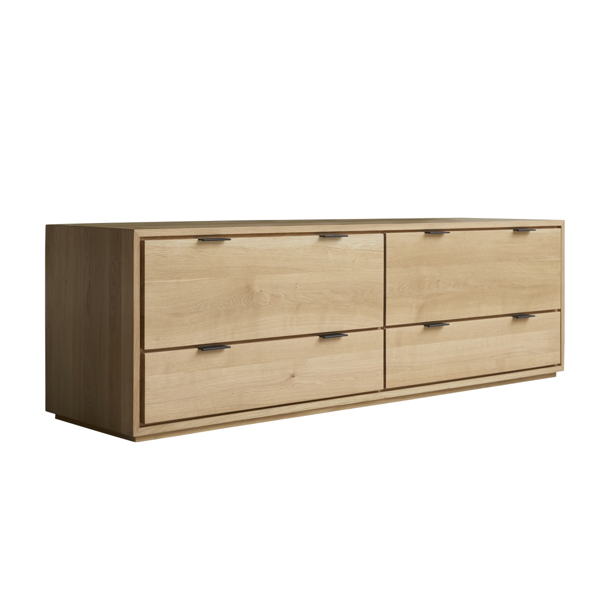 Dankzij het "blok"-ontwerp dat wordt verlicht door een slank frame, kunt u het meubel omtoveren in een lage en zeer moderne buffetkast. Hoe het ook gebruikt wordt, het wordt het middelpunt van de decoratie van uw kamer! Door zijn soberheid past het bij elke interieurstijl: Het zal daarom net zo perfect combineren met andere meubels uit de Senson Oak collectie als met uw bestaande meubels. De grote, diepe laden en de praktische vouwdeuren zijn bijzonder opvallend.