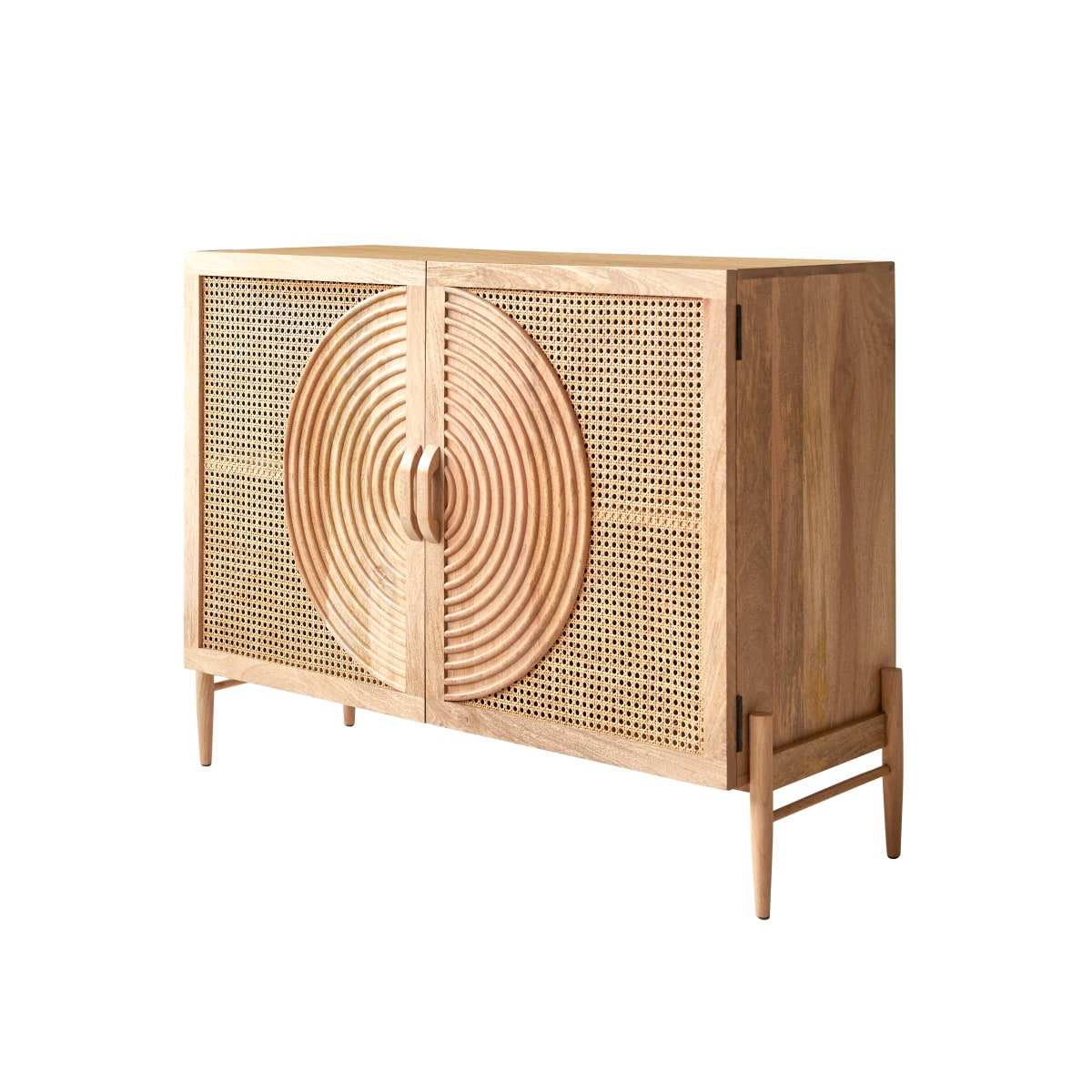 Als een uitnodiging om te reizen combineert de buffetkast Sina van massief mangohout en rotan een originele look met exotische elegantie! Het is duidelijk niet het meubelstuk dat u bij iedereen in huis zult aantreffen: apart zal het uw interieur levendiger maken... in combinatie met onze andere meubels uit de Sina collectie, zoals het tv-meubel of de ladenkast, toont het zelfverzekerd zijn neo-etnische karakter. We houden van de combinatie van de twee authentieke materialen en het verrassende ontwerp dat volledig tot zijn recht komt als beide deuren gesloten zijn. We zijn ook dol op de blonde kleur, die vele combinaties mogelijk maakt.