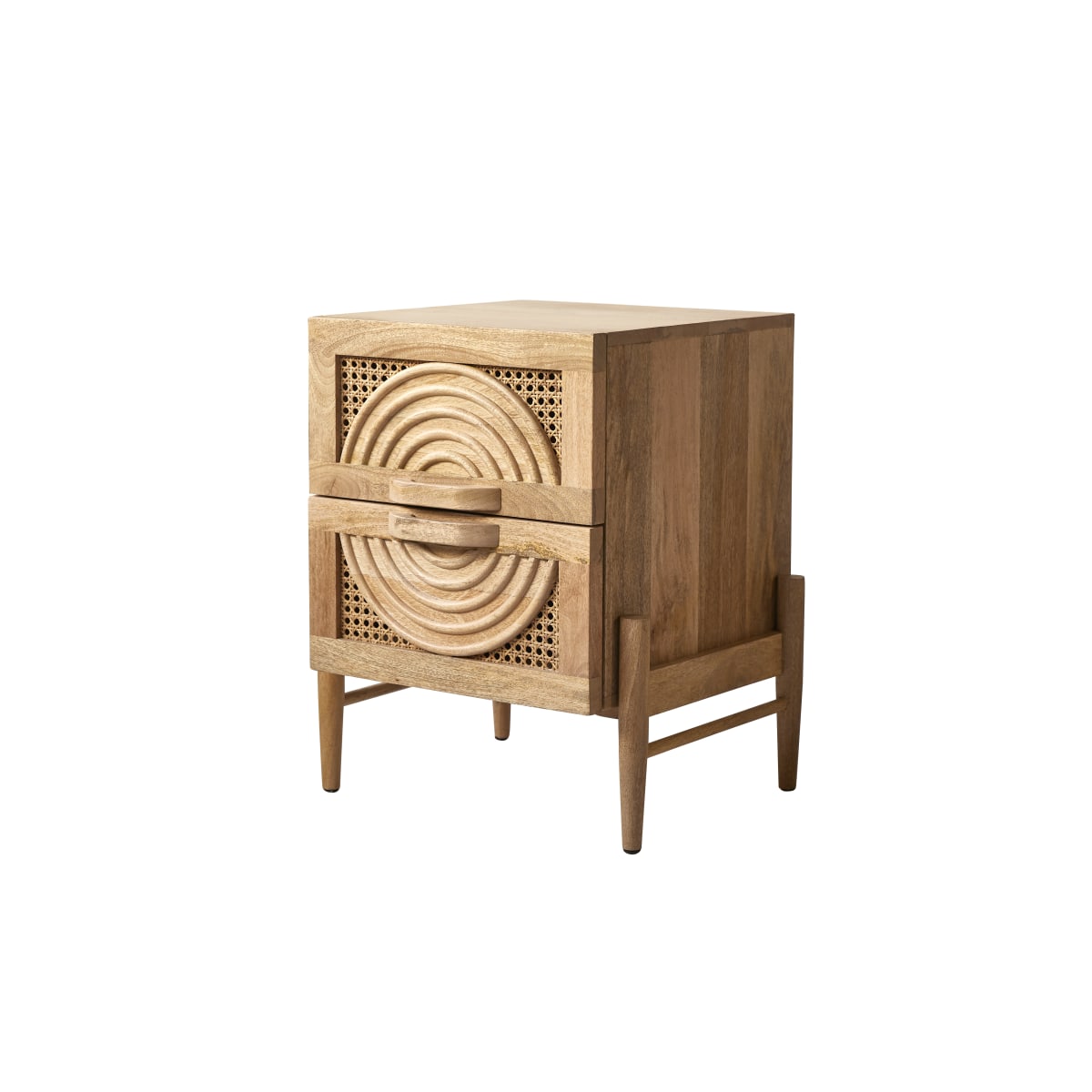 Het nachtkastje Sina van massief mango en rotan combineert originele stijl met neo-etnische inspiratie. De voorkant bestaat eigenlijk uit twee praktische lades voor het opbergen van brillen, tijdschriften, afstandsbedieningen en al die dingen die u graag bij de hand houdt... en heeft een prachtige look in hout en vlechtwerk: de twee dichte lades vormen dus de versiering. Dit nachtkastje past perfect bij onze rotan hoofdeinden en is de perfecte aanvulling voor een slaapkamer met bohemien accenten. Het kan ook het originele accent vormen in een meer klassieke slaapkamer: de blonde kleur van het hout maakt veel combinaties mogelijk, maar als u van een exotisch karakter houdt, aarzel dan niet om het te combineren met andere meubels uit onze Sina-collectie, zoals de commode of het tv-meubel.