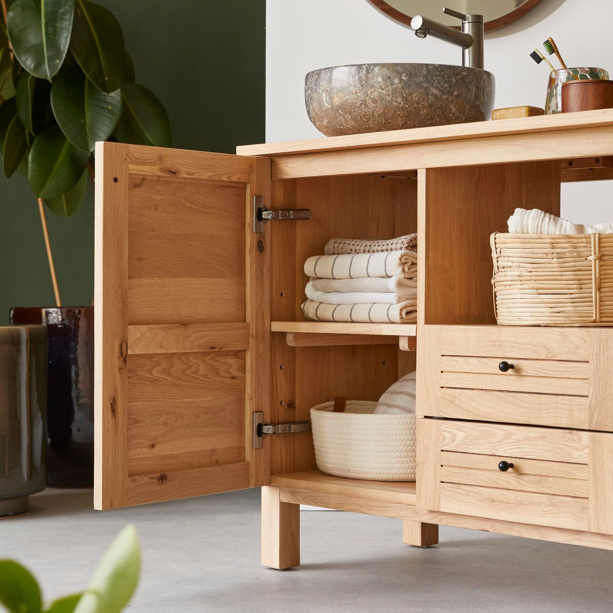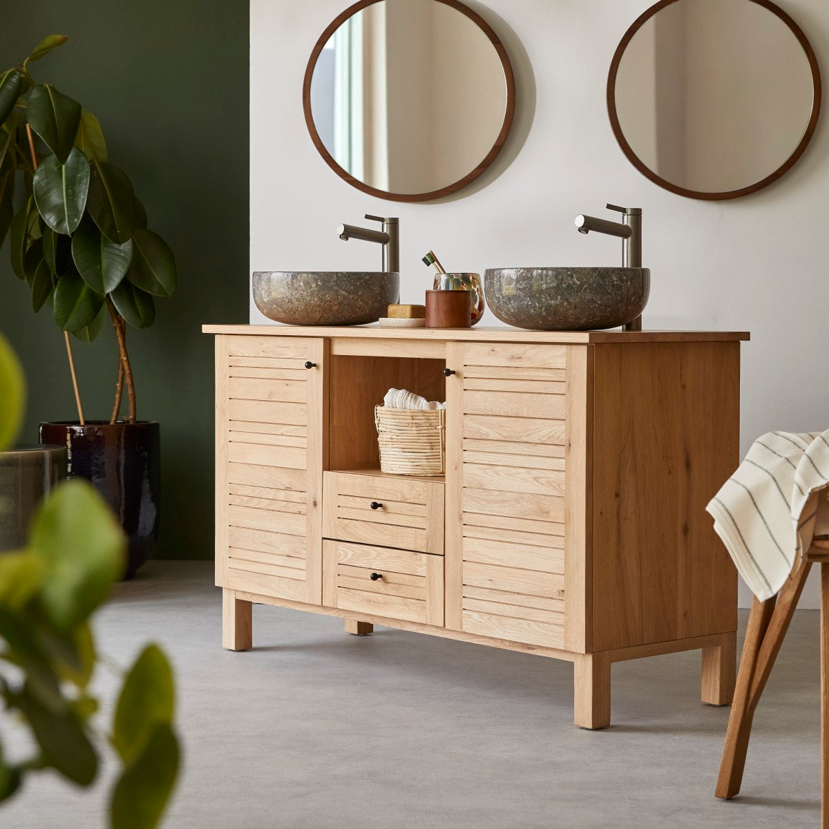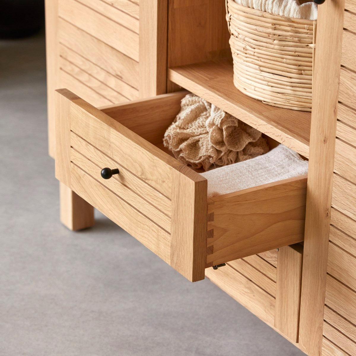 Het 125 Soho massief eikenhouten badkamermeubel: een tijdloze elegantie gecombineerd met een royale opslagcapaciteit! Het is een heel praktisch meubel om alles in de badkamer op te bergen: badtextiel, accessoires en alle schoonheidsproducten die u graag bij de hand hebt.