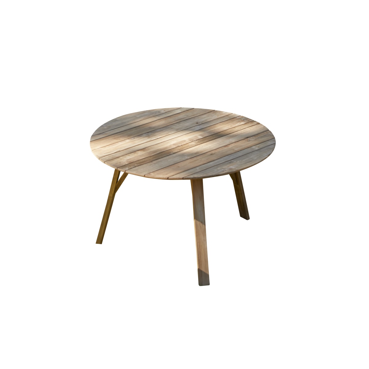 De ronde Katrine tuintafel van gerecycled massief teak combineert natuurlijke elegantie met een ecologisch verantwoorde aanpak via upcycling. Het blad gemaakt van latten in verschillende breedtes geeft hem charme en karakter. Het is FSC®-gecertificeerd en staat garant voor verantwoord bosbeheer. Dit veelzijdige model voelt zich net zo thuis in de tuin, keuken of woonkamer, afhankelijk van uw behoeften.