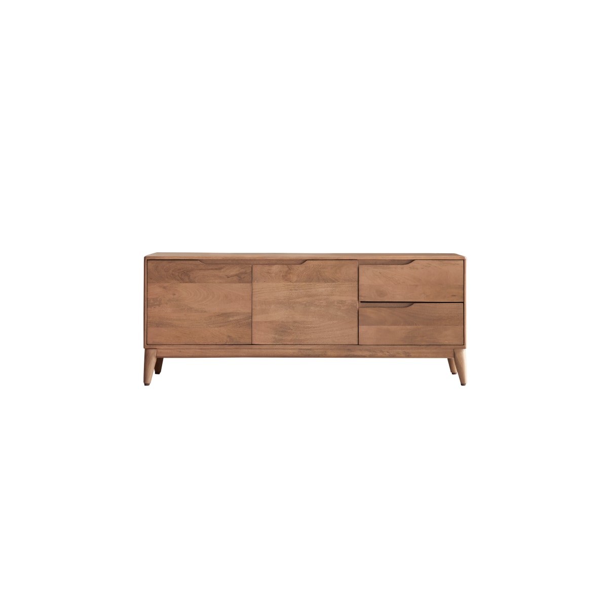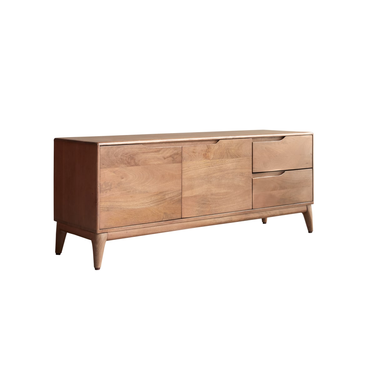 Het massief mangohouten Gabrielle tv-meubel van 140 cm is het ideale opbergmeubel voor de woonkamer. Het is beschermd door een laklaag voor veilig dagelijks gebruik.