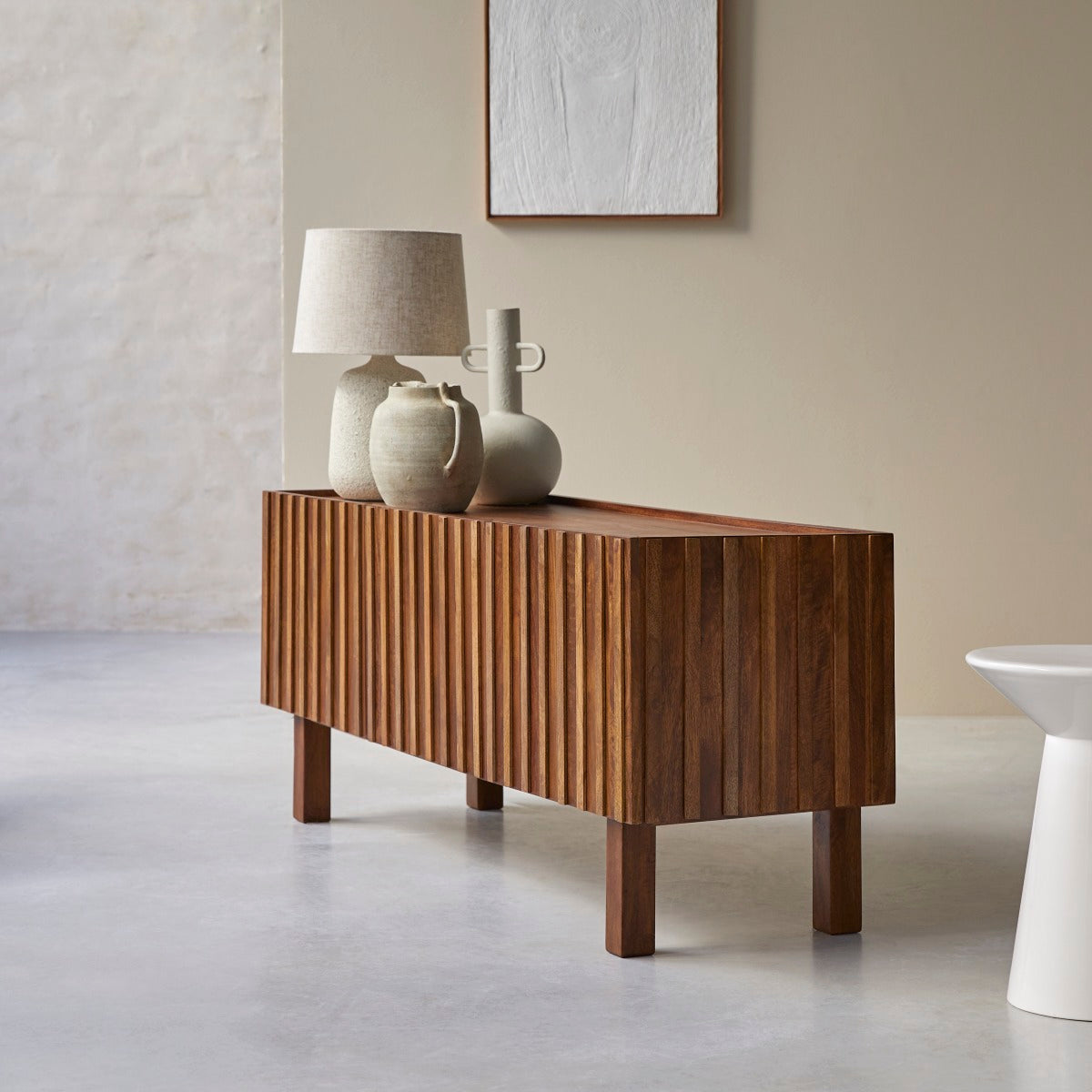 Het Milo TV-meubel van massief mangohout is geïnspireerd op verre horizonten en nodigt uit tot dromen. We houden van de bijzondere charme en het gelamineerde ontwerp dat de voorkant siert. Dit elegante meubel vol karakter kan worden gebruikt voor het organiseren van al uw multimedia-apparatuur en bijbehorende accessoires zoals afstandsbedieningen, connectors, tijdschriften...