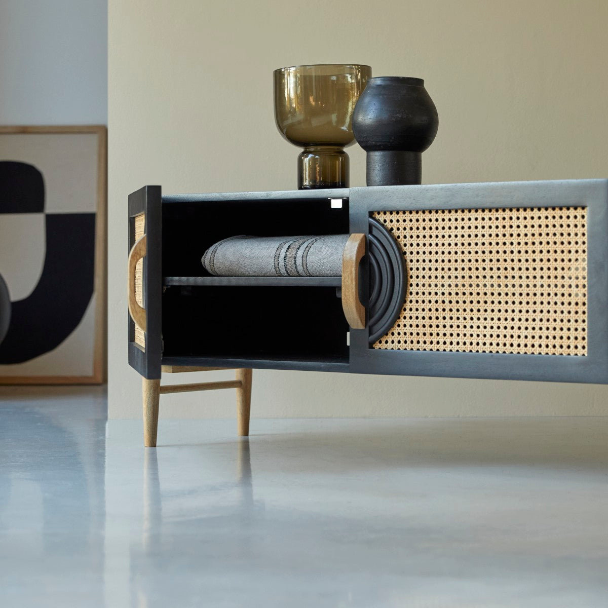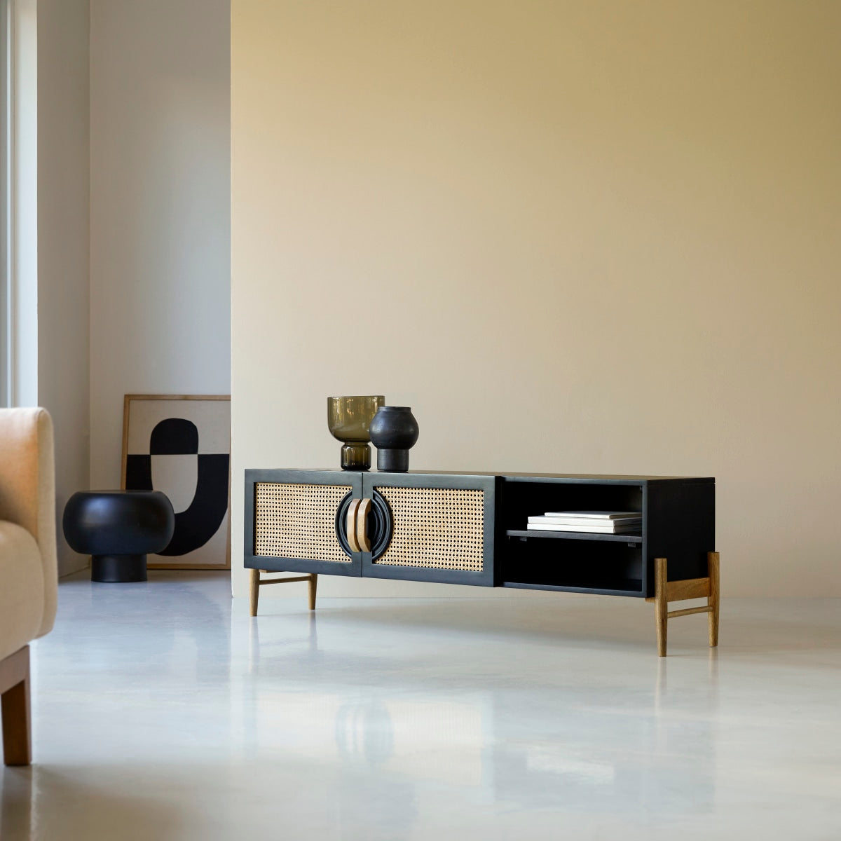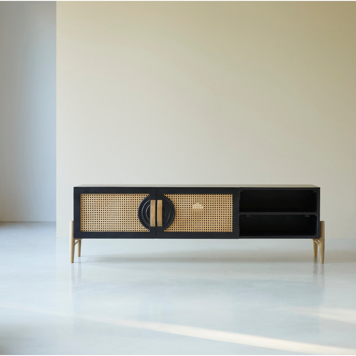 Het Sina tv-meubel van massief zwart mangohout en rotan combineert neo-etnische elegantie met een geometrisch design. Het biedt een contrast van materialen en tinten, met deuren die accessoires verbergen en vakken voor multimedia-apparatuur.