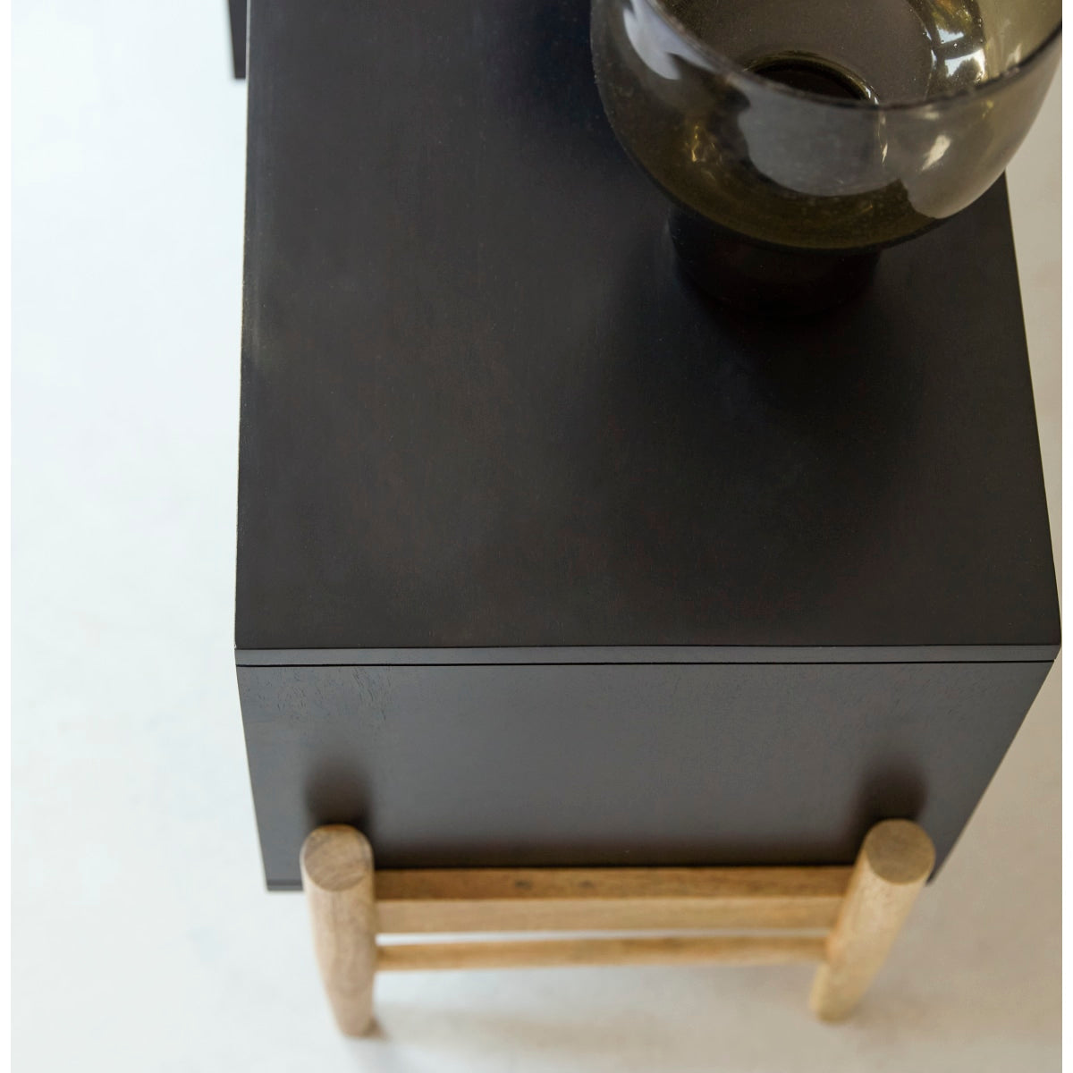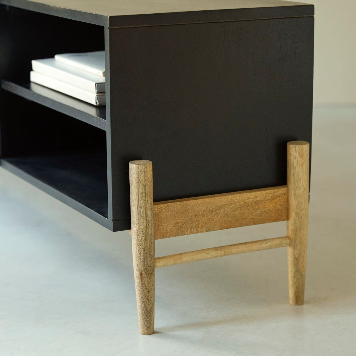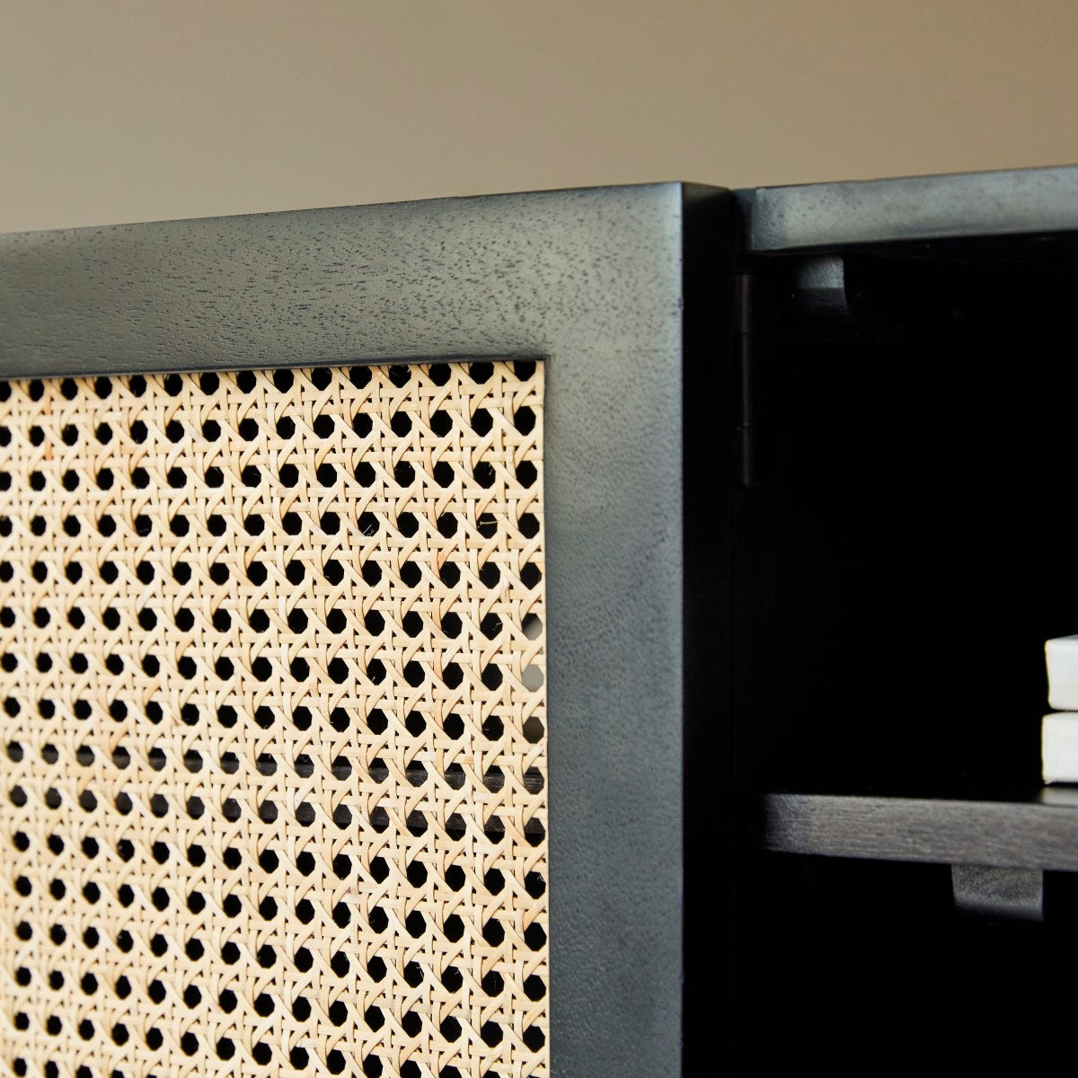 Het Sina tv-meubel van massief zwart mangohout en rotan combineert neo-etnische elegantie met een geometrisch design. Het biedt een contrast van materialen en tinten, met deuren die accessoires verbergen en vakken voor multimedia-apparatuur.