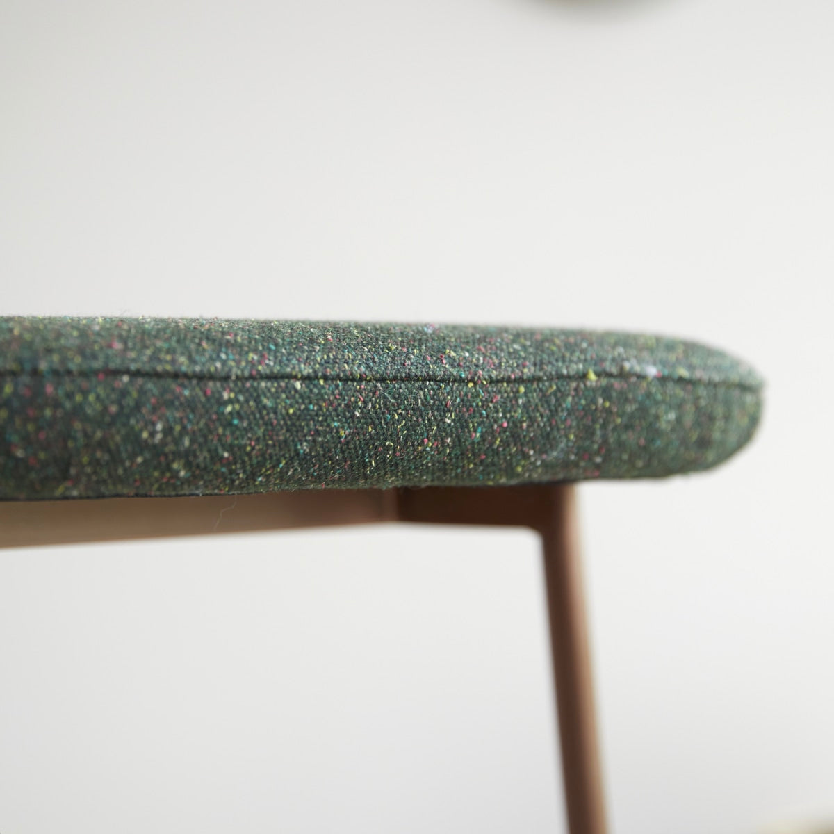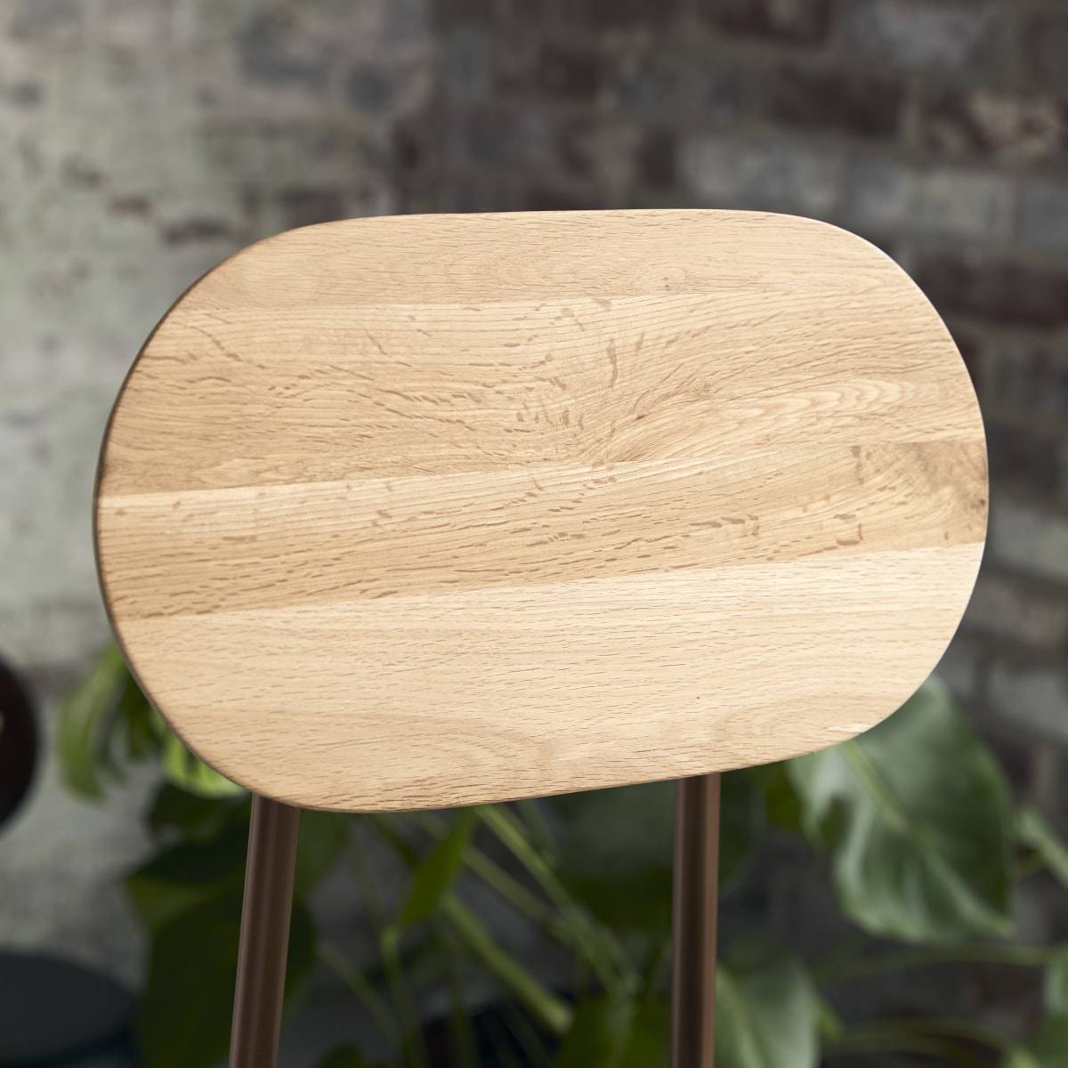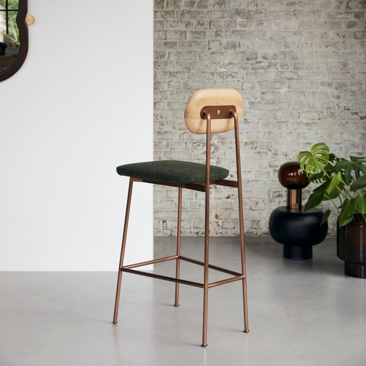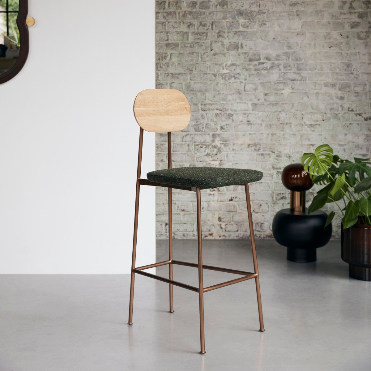De Yutapi-barstoel van eikenhout en kakigroen tweed is geïnspireerd op de schoolstoelen uit onze kindertijd. In de hoge versie kan hij aan de bar of het keukeneiland staan, maar hij doet ook dienst als moderne stoel in de woonkamer of in de slaapkamer.
