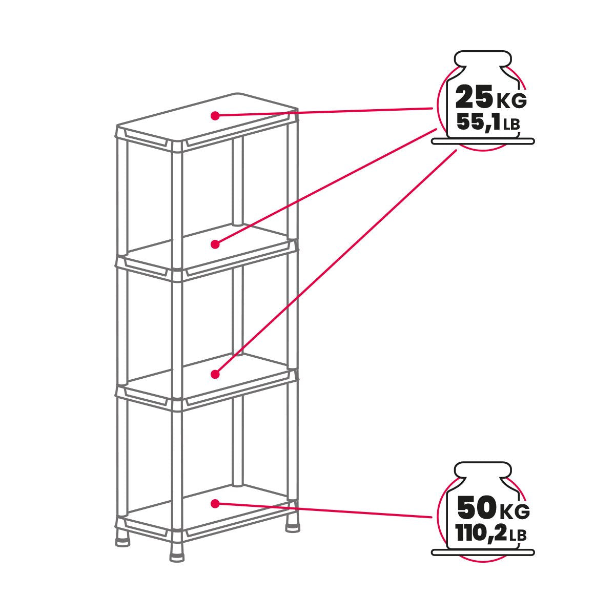 - Draaggewicht per plank: 25 kg