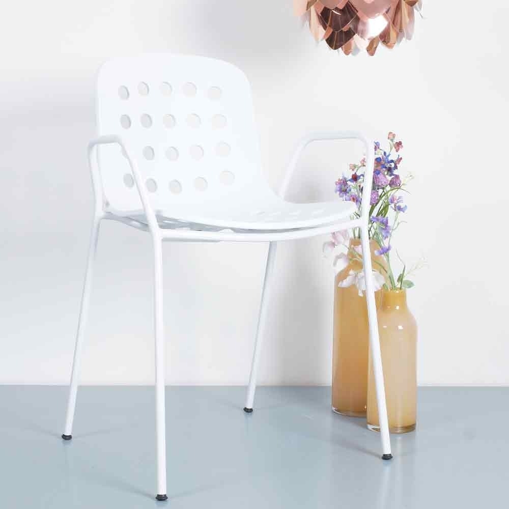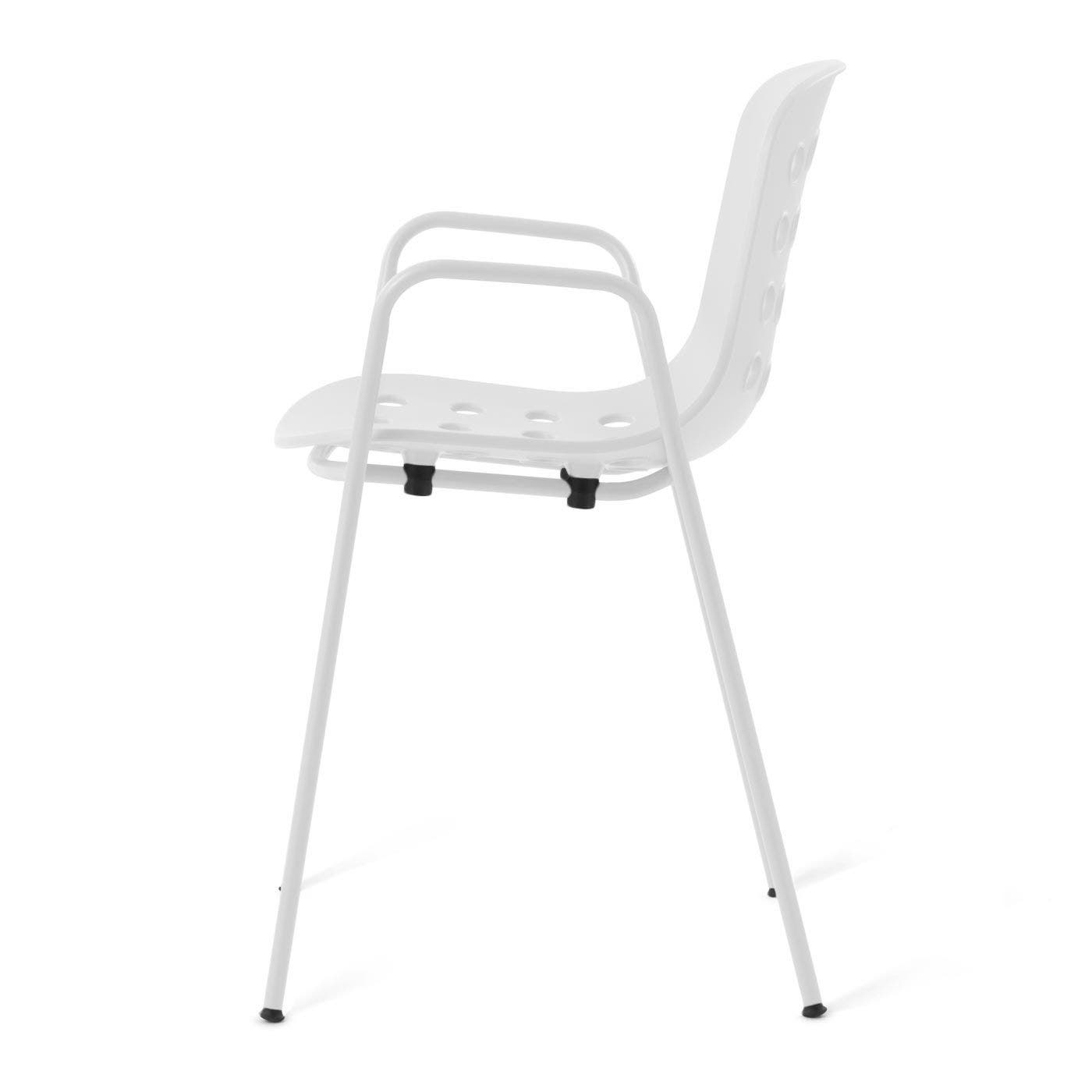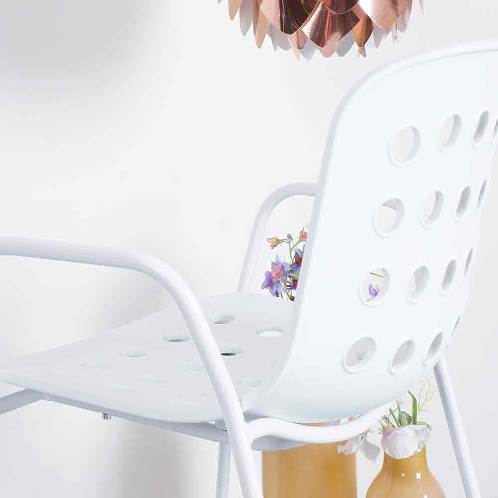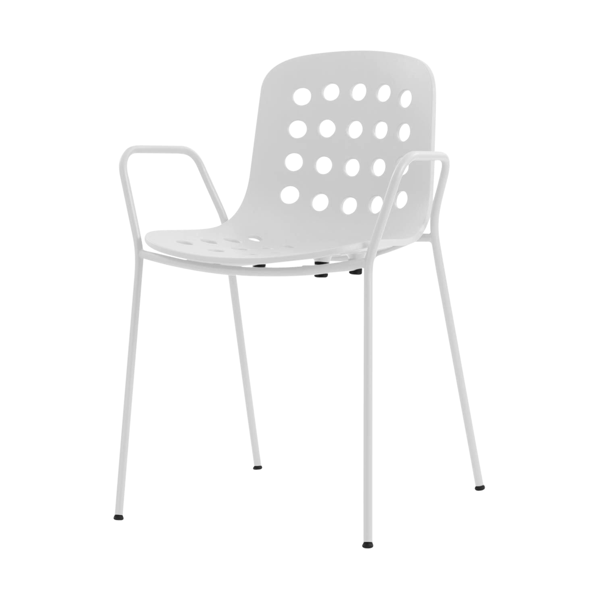 Het elegante Italiaanse design en de ronde gaten in de zitting van deze designstoel maken hem sportief en vederlicht. De holi holes armstoel heeft zitting van kunststof en een metalen onderstel met armleuningen. Ontwerper Simone Viola maakte van de holi stoel een ideaal midden tussen een binnen- en buitenstoel. De door-en-door gekleurde kunststof zitting en het gepoedercoate onderstel van deze armstoel hebben dezelfde kleur en vormen zo één geheel. holi holes is leverbaar in het wit en het zwart.