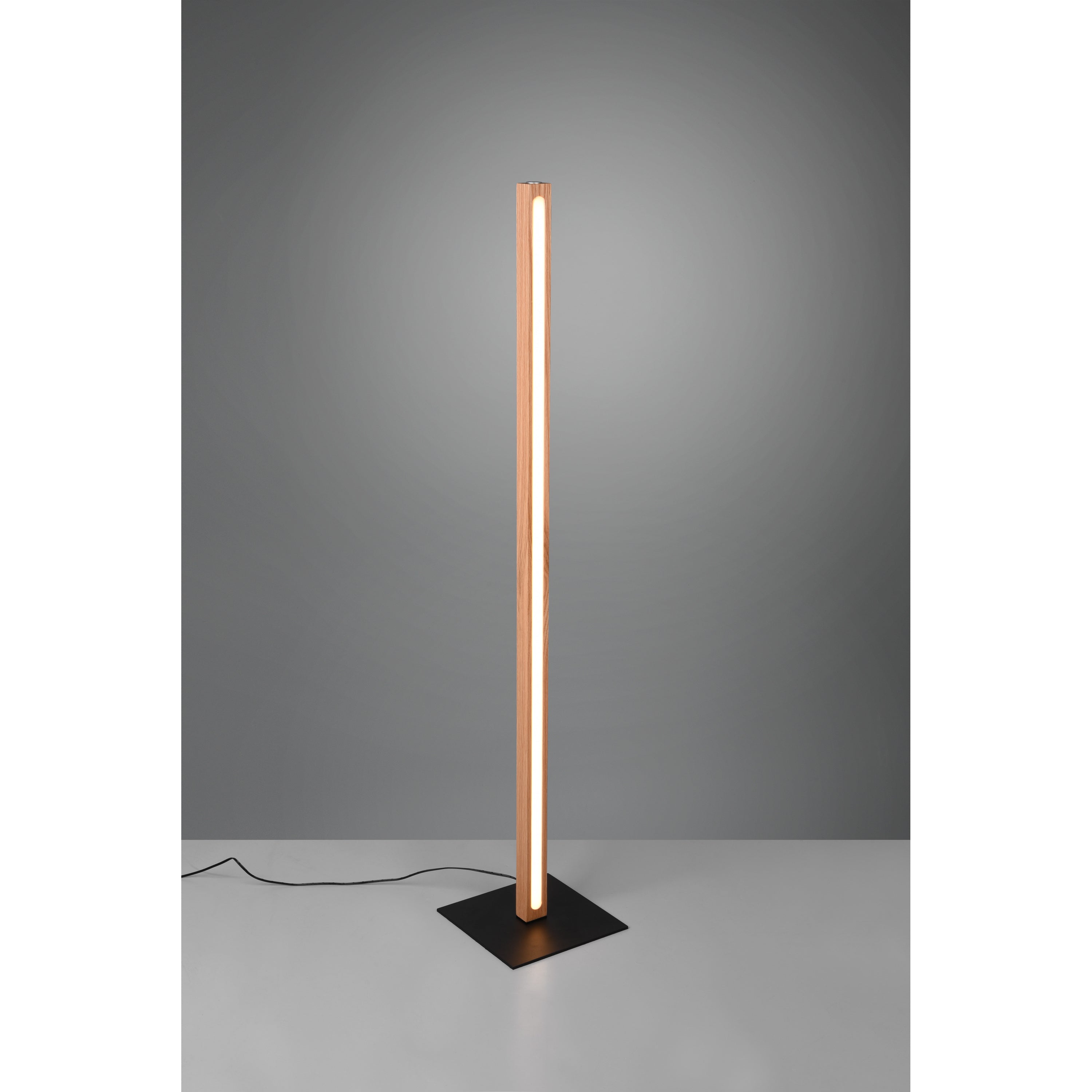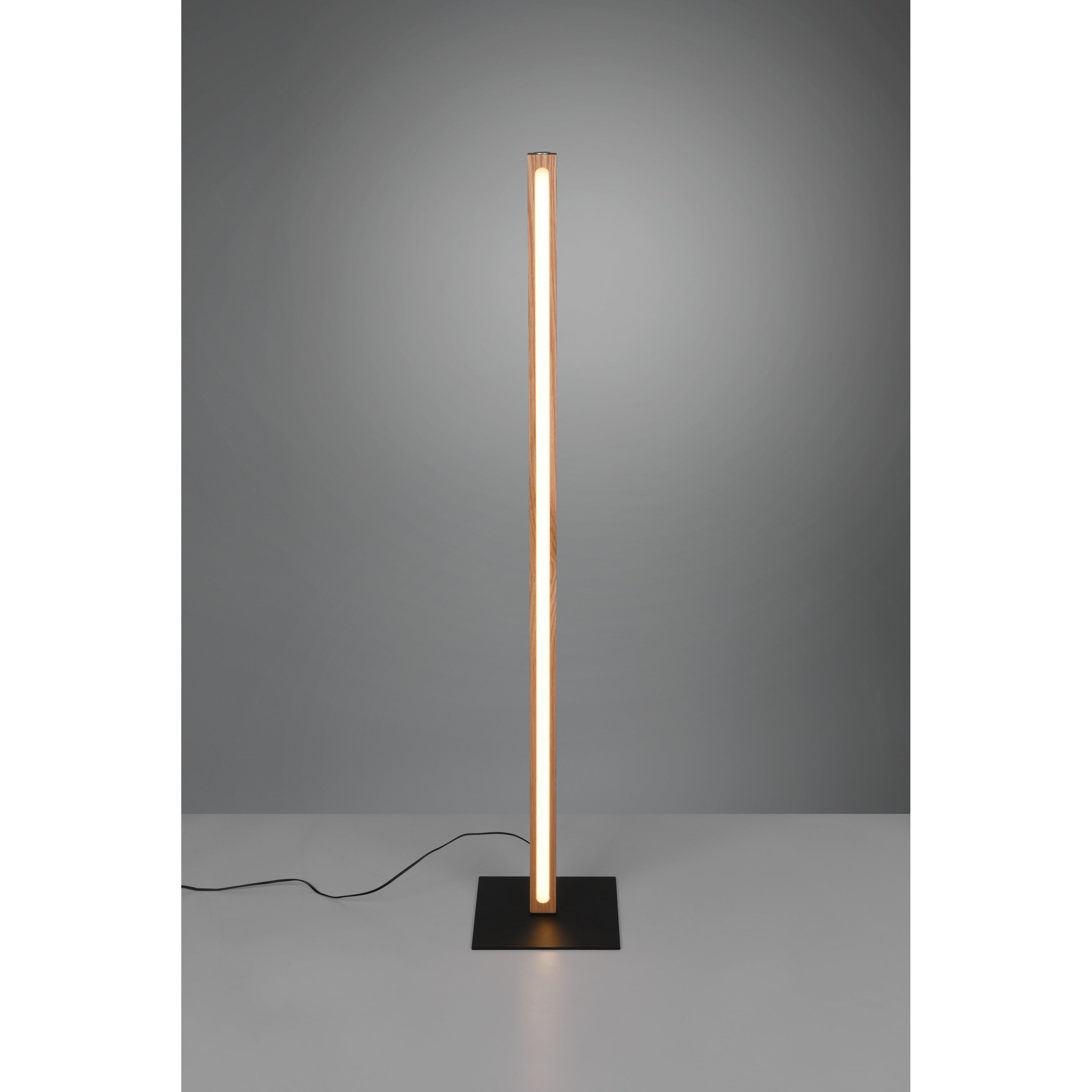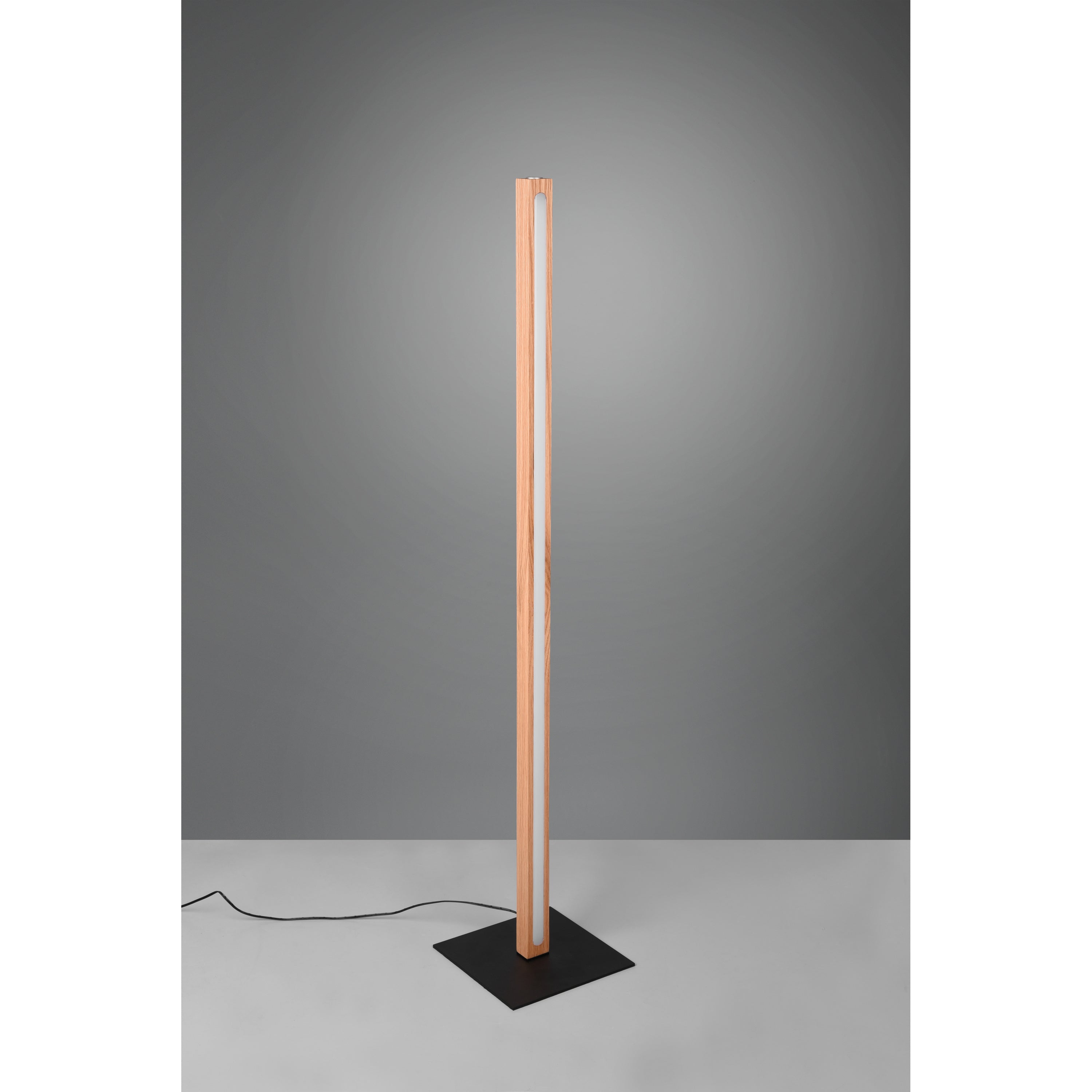 De moderne staande leeslamp heeft de kleur hout en is gemaakt van hout.