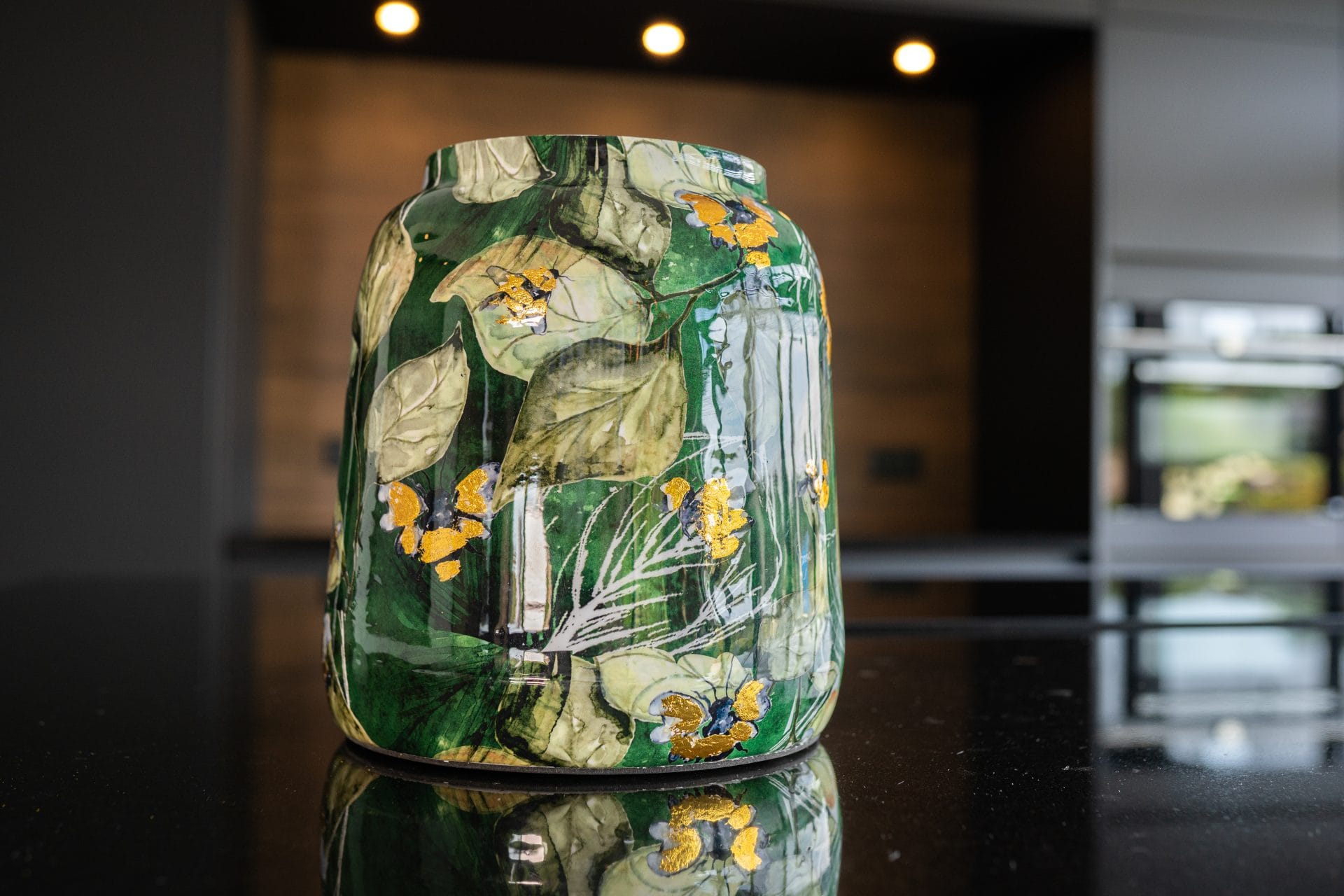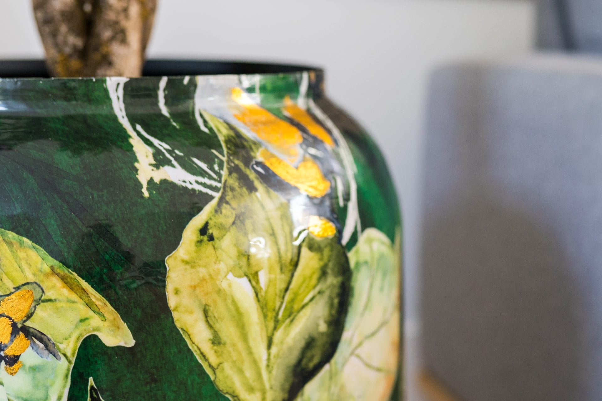Vier de natuur bij je thuis met de magische woonitems van Designed by Lammie. Het design Bee Green gaat over groen in de breedste zin van het woord. De kracht van groen, weelderig, jong en vers. Het geheimzinnige en magische van de natuur, onvoorspelbaar en spannend. Maar ook de breekbaarheid van de natuur, teder en gevoelig. Lammie heeft al deze elementen meegevoerd in het design Bee Green. Dit authentieke design brengt je terug naar je natuur. Het is als een boswandeling in je eigen huis. Idyllisch en eenvoudig, natuurlijk met Lammie s fameuze touch of gold . Ontdek ook de andere sprekende designs in de collectie Designed by Lammie. Verkrijgbaar in zes prints zijn metalen potten en kruiken van klein naar extra groot, een dienblad en fruitschaal van prachtig mangohout, en vrolijke decoratieve hangers. Om haar exclusiviteit te garanderen is deze collectie Limited Edition.