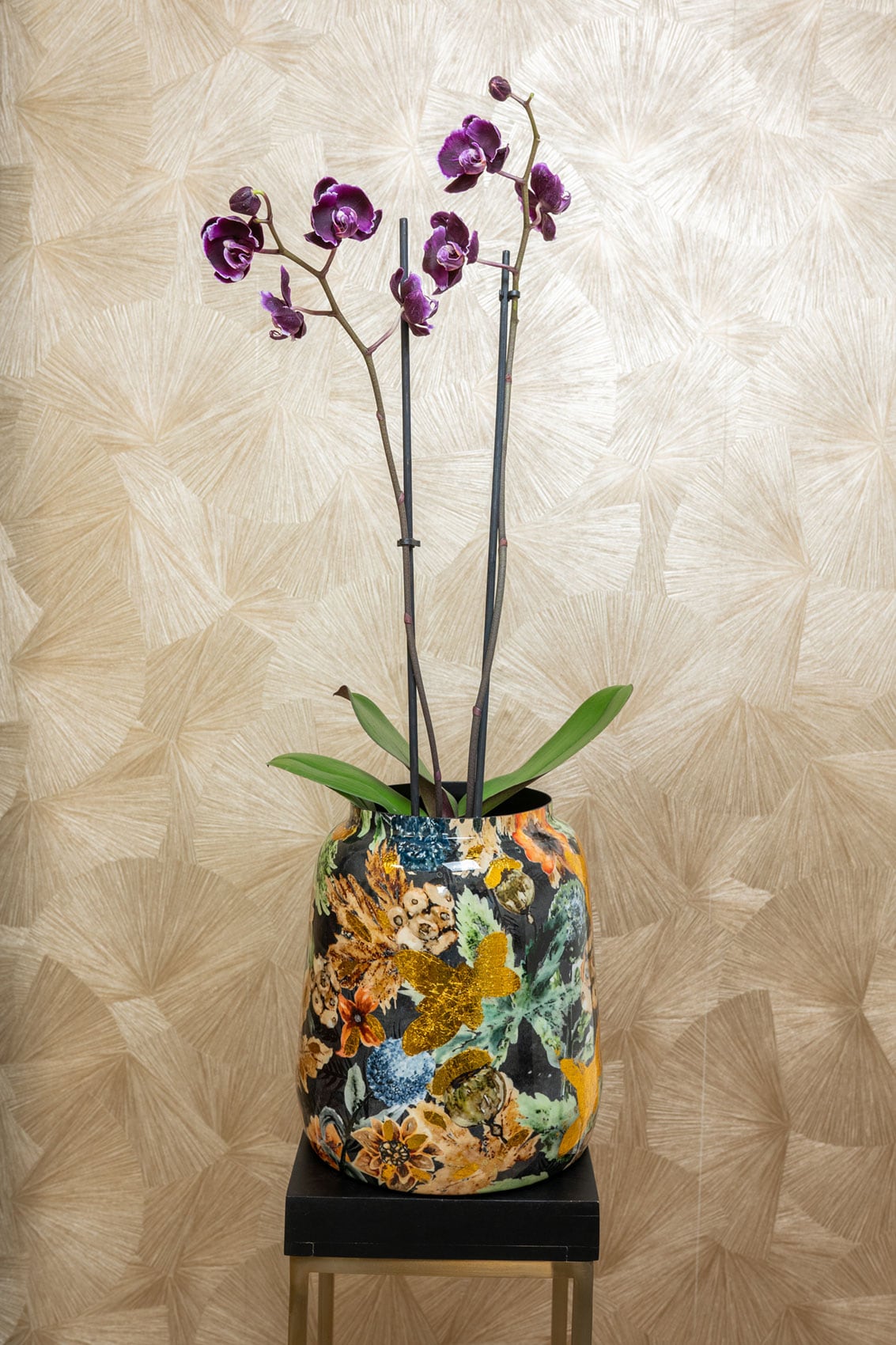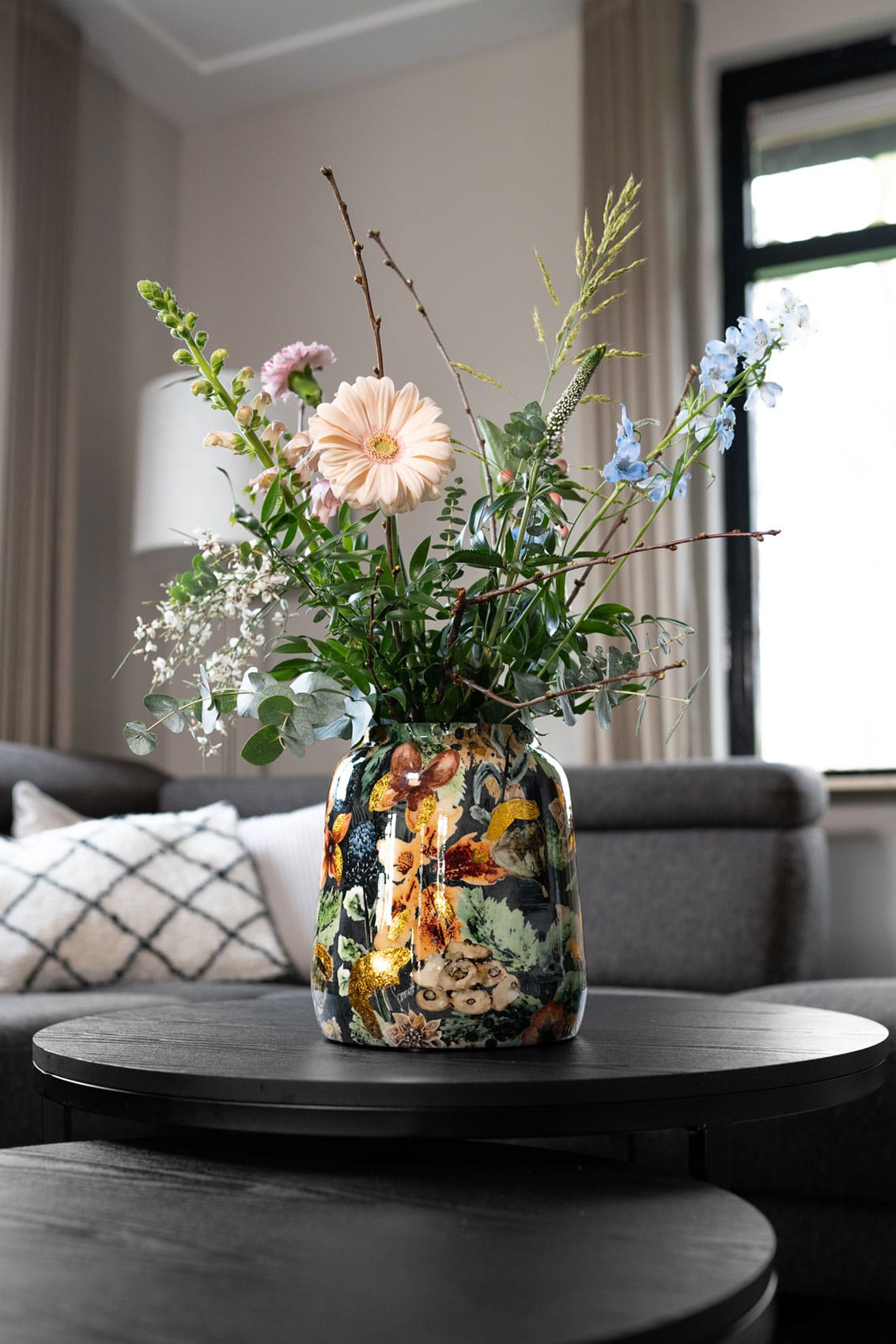 Ontdek de Berry Blue collectie van Designed by Lammie. Een werkelijk prachtig woonitem van het Nederlandse merk TS Collection. Deze rijke weelderige print is een ode aan de liefde. Want wist je dat de nederige bes is een symbool voor de liefde? Venus, Godin van de Liefde, wordt dikwijls afgebeeld met deze bessen. Met dit in gedachten maakt Lammie een unieke artistieke print met illustraties van bessen, bloemen en blad. De kleuren op deze print zijn avontuurlijk en passioneel. Donkere blauwtinten, warme aardekleuren, opgewekt groen en natuurlijk Lammie's fameuze Touch of Gold. Het design is herfstachtig met een zacht contrast. Dit zorgt ervoor dat de potten, vazen, schalen en dienbladen uit deze serie opvallen maar ook blenden in het interieur.