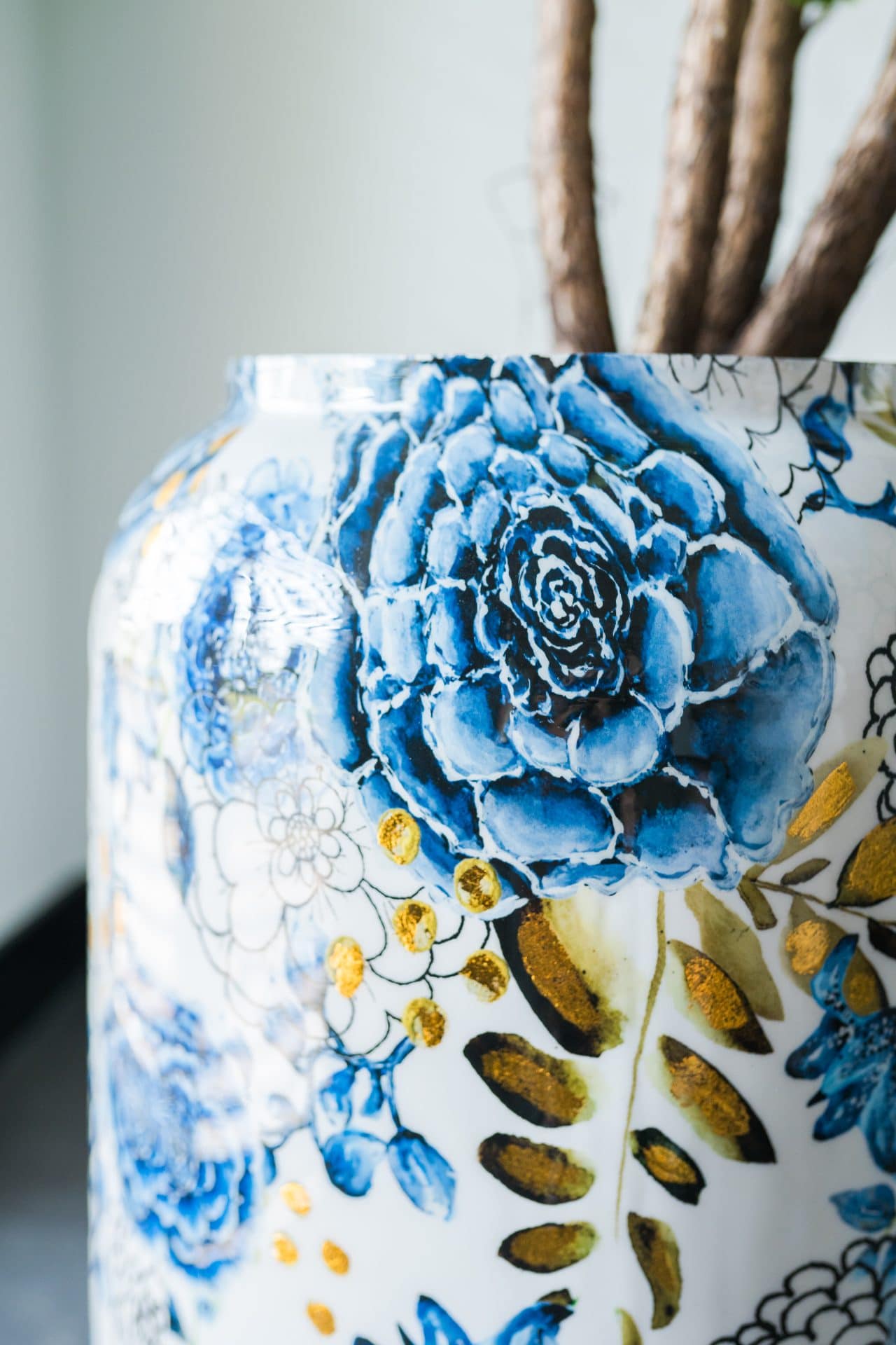 Blauw, wit en een touch of gold kenmerken de print Dutch Blue uit de collectie van kunstenares Lammie. Speciaal voor TS Collection creëerde zij zes sprekende prints met ieder een eigen verhaal. Dutch Blue belicht de rust en nuchterheid van de Nederlandse natuur en cultuur. Uitgestrekte weilanden met veldbloemen, halmen en water. Nederland oogt ordelijk en beheerst. Maar achter deze ogenschijnlijke kalmte schuilt ijver en hartstocht. Vier je passie voor de natuur met dit weloverwogen design Dutch Blue. Er is keuze uit een dienblad en fruitschaal van mangohout verguld met Dutch Blue print van emaille, metalen potterie in extra grote maten en smaakvolle decoratieve hangers. Spring in de wereld van Lammie en ontdek alle zes designs. Kwaliteit en exclusiviteit zijn de pijlers van de collectie Designed by Lammie, een range die bol staat van kleur en karakter. Deze bijzondere collectie is uitgebracht als Limited Edition.