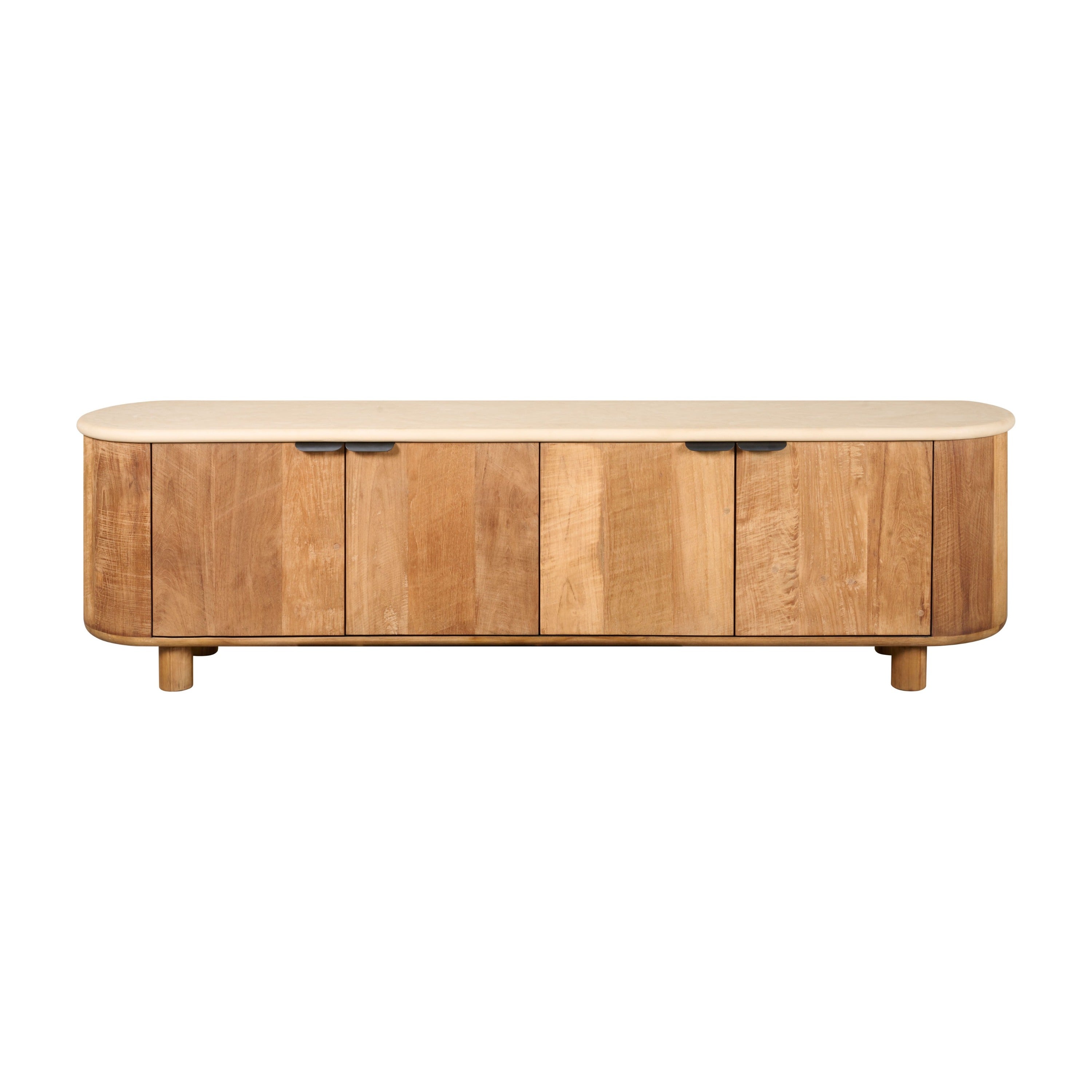 Upgrade je woonkamer met TV-meubel Doble, een echt statement piece. Dit meubel is ontworpen met opvallende, organische en ronde vormen - inclusief de poten. De body van naturel teakhout brengt een warme, natuurlijke sfeer in huis. De top heeft een elegante ovale vorm en is afgewerkt met mortex, een waterdichte pleister die de look heeft van beige travertin. Doble combineert functionaliteit met een speelse, moderne twist, perfect voor een trendy interieur. Extra informatie:- afmeting 200x55x40 cm (bxhxd)