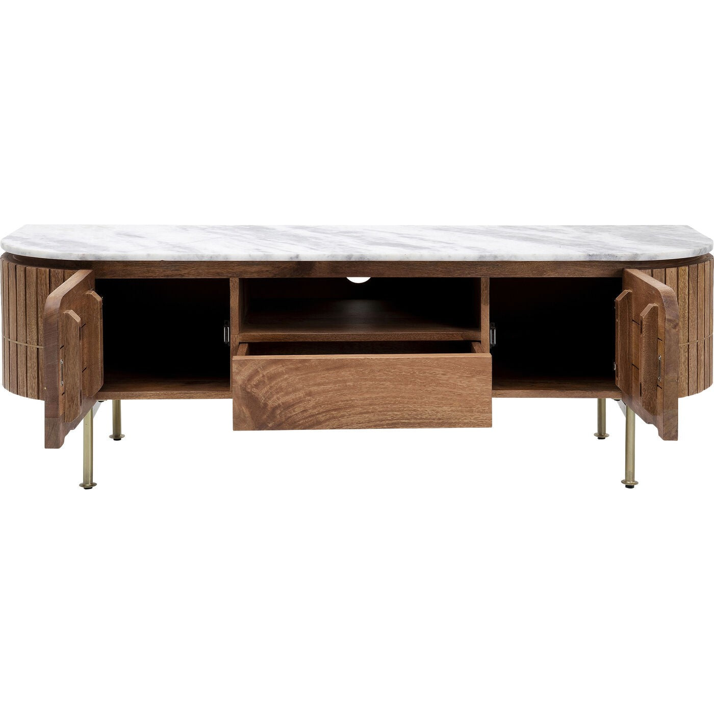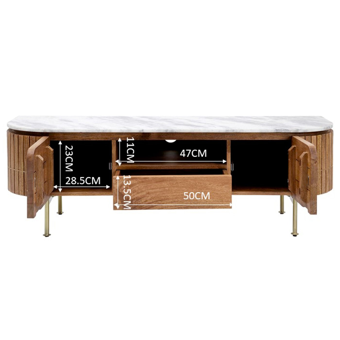 - Combinatie van mangohout, staal, marmer en MDF, met goudkleurige stalen poten.