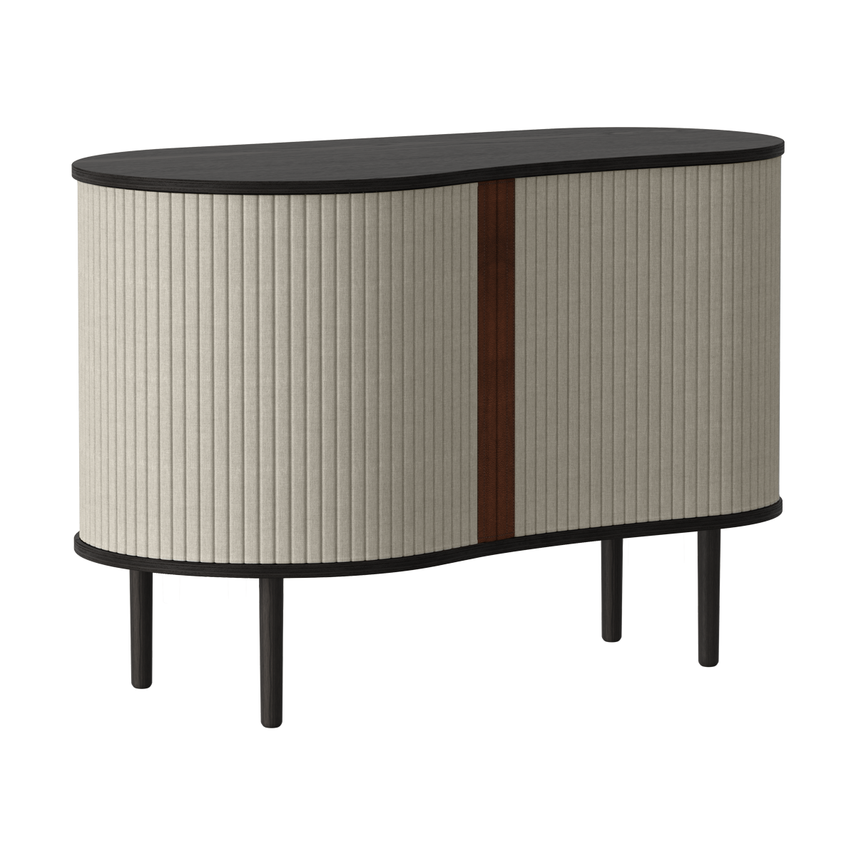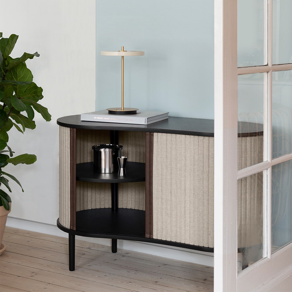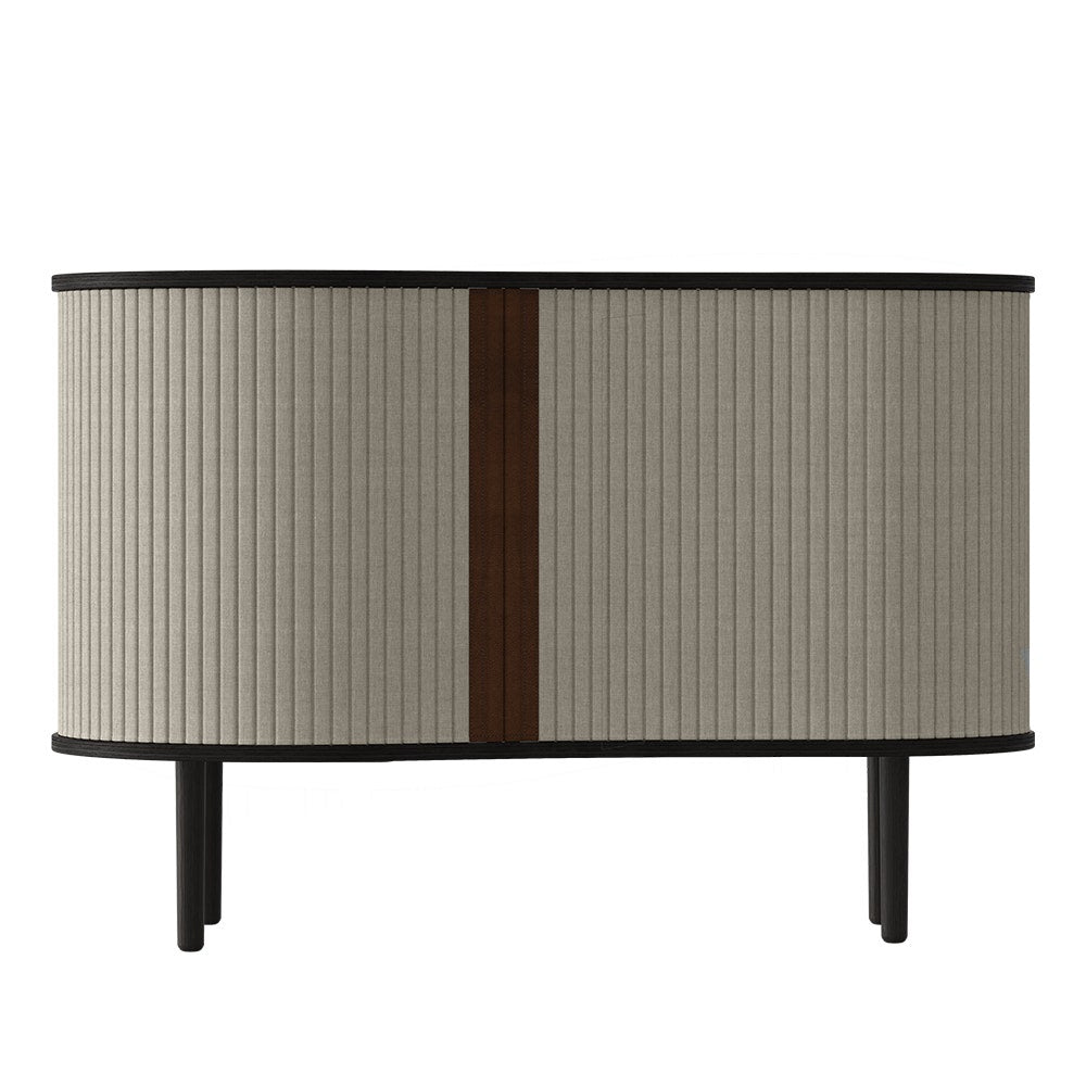Deze opbergkast heeft een frame gemaakt van eikenhout en twee schuifdeuren met een stoffen bekleding De bekleding komt uit de Horizons collectie van Umage en is 100% gerecycled De Audacious cabinet kun je vrij neerzetten omdat je de deurtjes helemaal rondom kunt schuiven Hierdoor kun je op ieder moment een nieuw display voor al jouw favoriete spullen creeren Door de organische vormen van deze eikenhouten kast is het een echte blikvanger en door de mooie ronde hoeken past deze kast in iedere ruimte Dankzij de combinatie van het houten frame en de stoffen bekleding krijgt de opbergkast een warme uitstraling De middelste plank in het kastje heeft een kleine ronde opening, zodat ook hoge glazen of vaasjes in het kastje passen Deze design opbergkast is niet alleen prachtig om te zien, maar ook erg functioneel