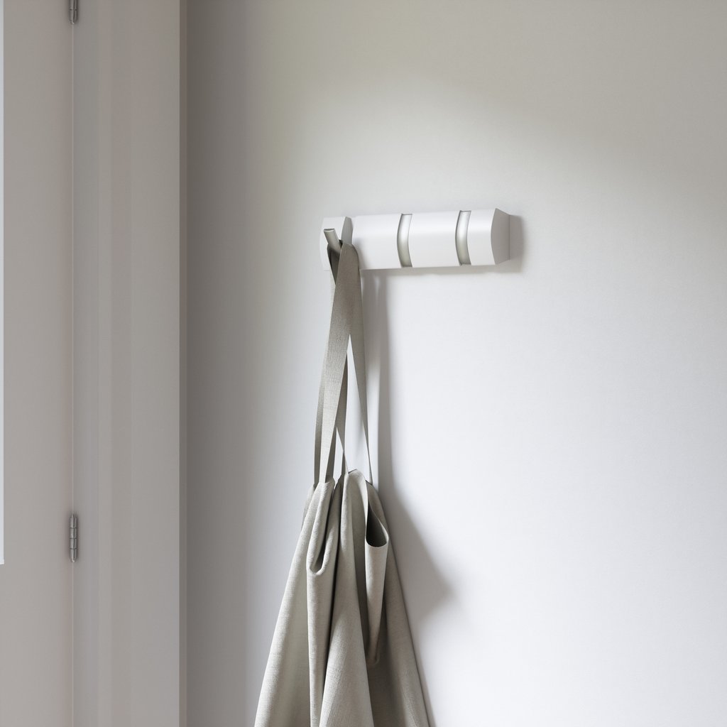 Ruimtebesparend design De Umbra Flip Hook 3 is een wandkapstok die perfect tot zijn recht komt in een kleinere hal. De kapstok neemt namelijk alleen ruimte in wanneer dat nodig is. Hoeft er geen jas aan de kapstok? Klap de haakjes dan in, de Flip Hook 3 is dan een decoratieve versiering in de gang. Klap de haakjes open om de jassen op te hangen. De Flip Hook Kapstok van Umbra is van zeer hoge kwaliteit, waardoor het mogelijk is om twee jassen per haak op te hangen.