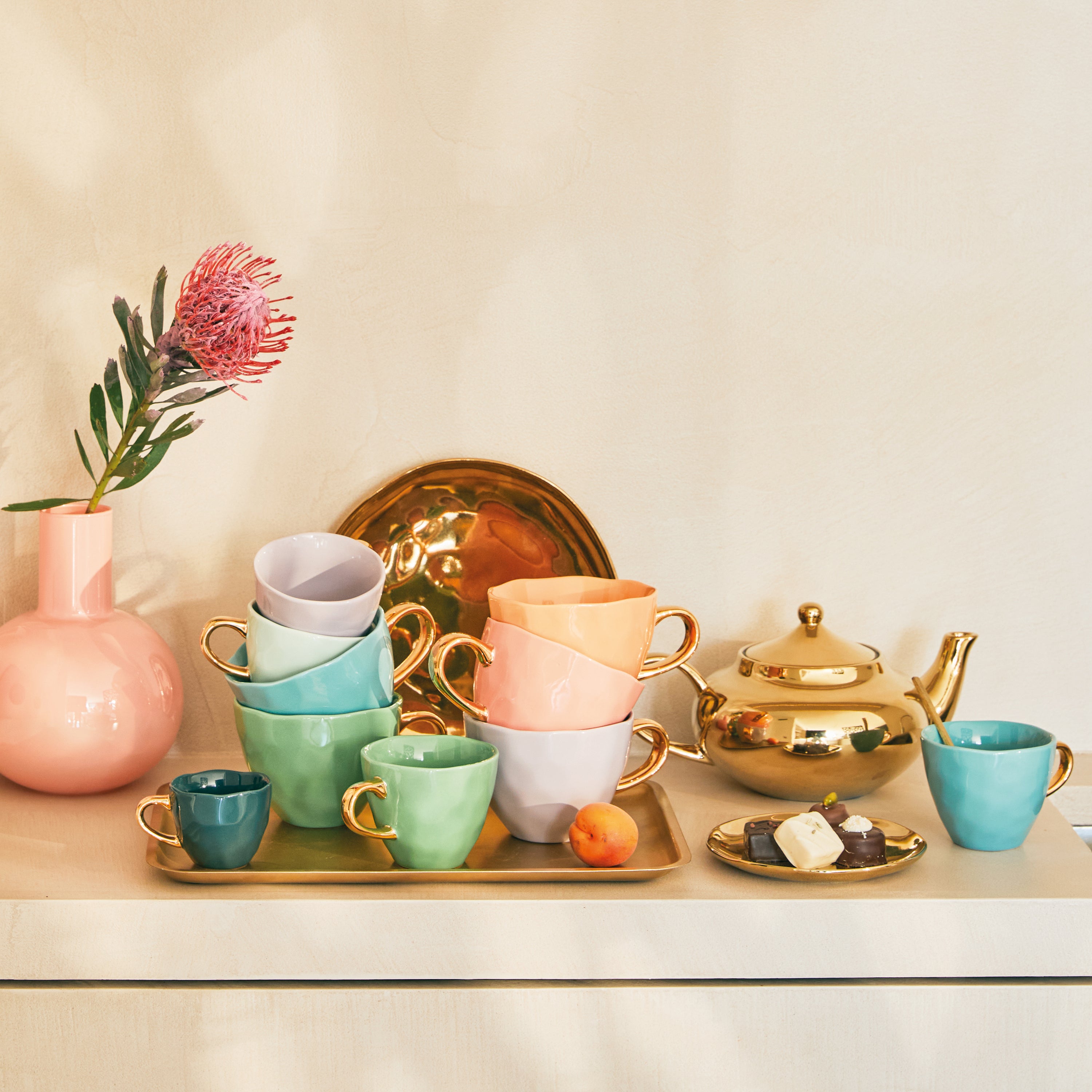- Tip: was het kopje met de hand om het handgeschilderde goud te beschermen