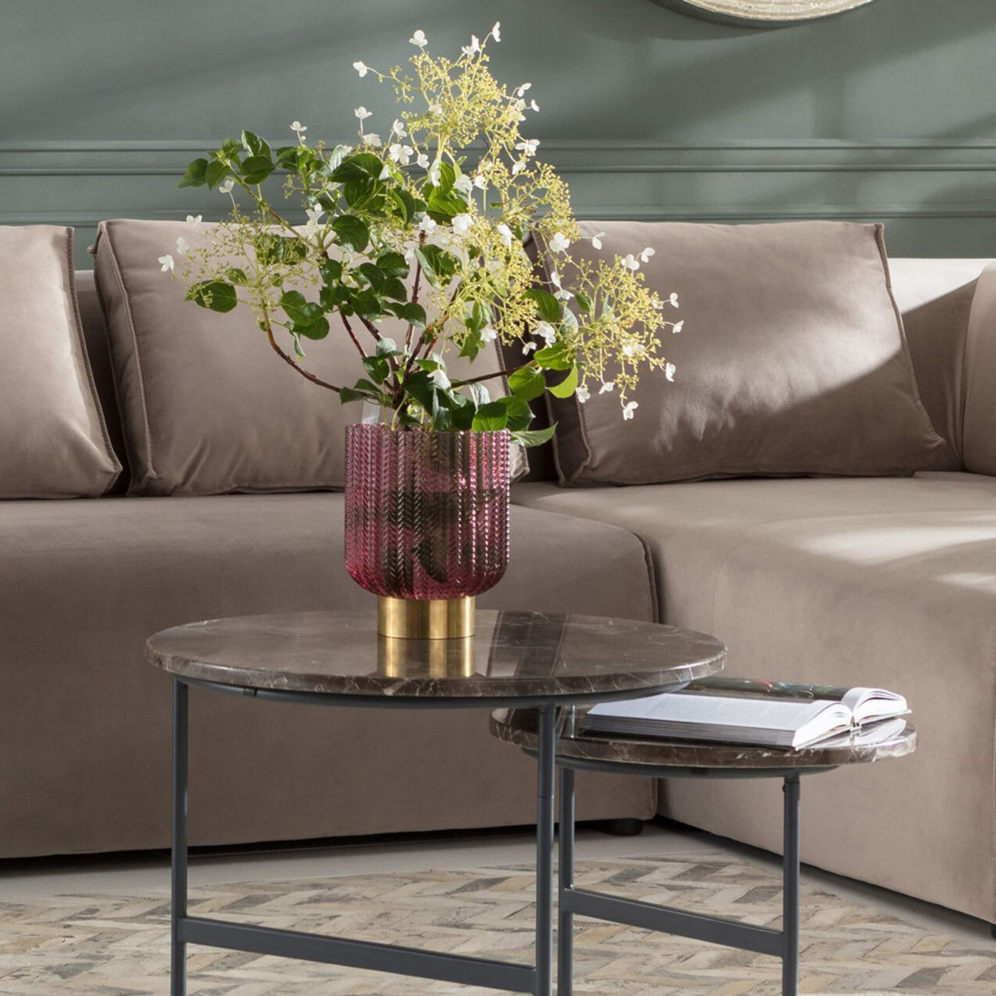 Onze Barfly vazen combineren de zachtheid van getint glas met een zorgvuldig bewerkte reliëfstructuur. Een gouden ring geeft het geheel een elegante touch.