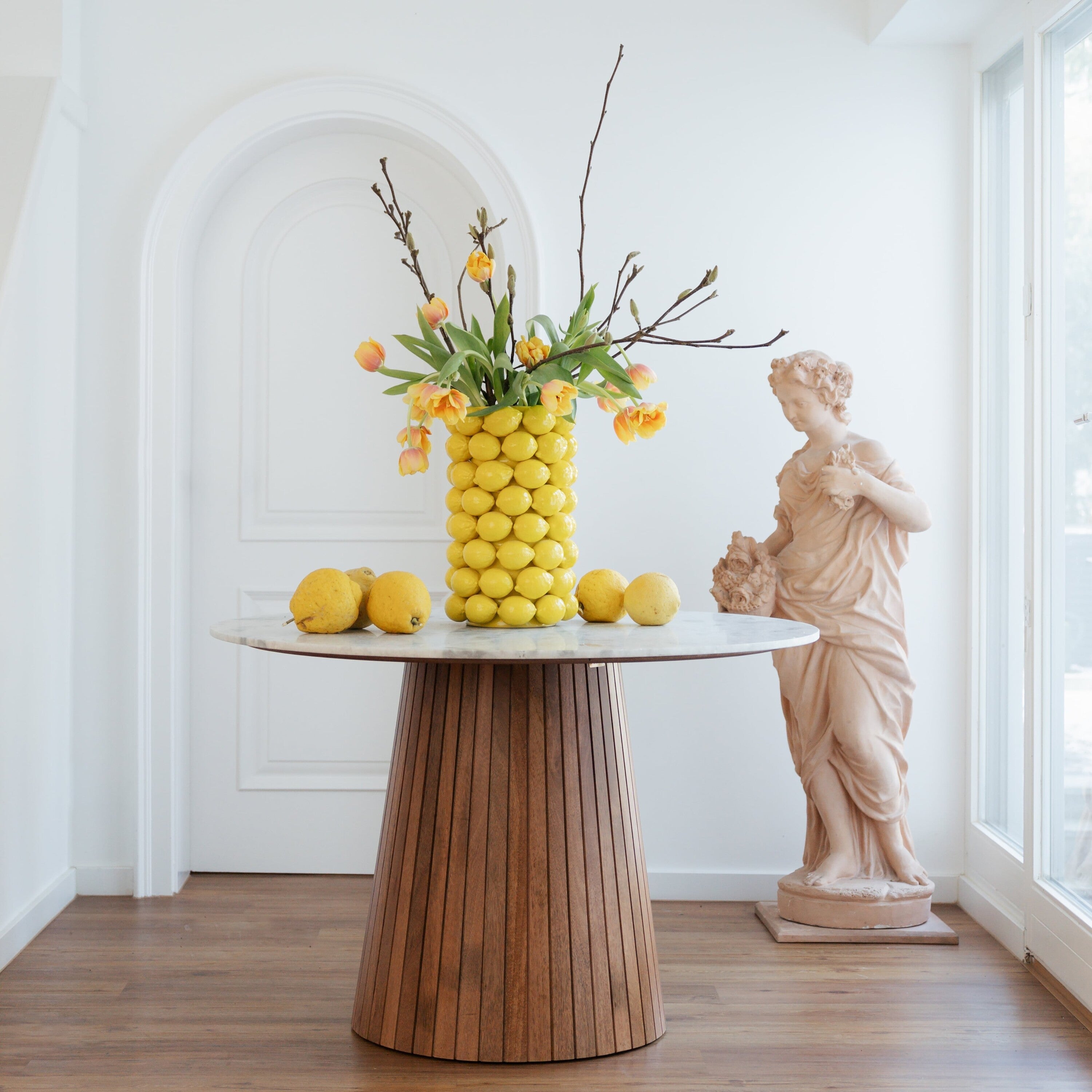 - Het moderne ontwerp van de Vaas Lemon Juice wordt benadrukt door zijn handgemaakte afwerking.