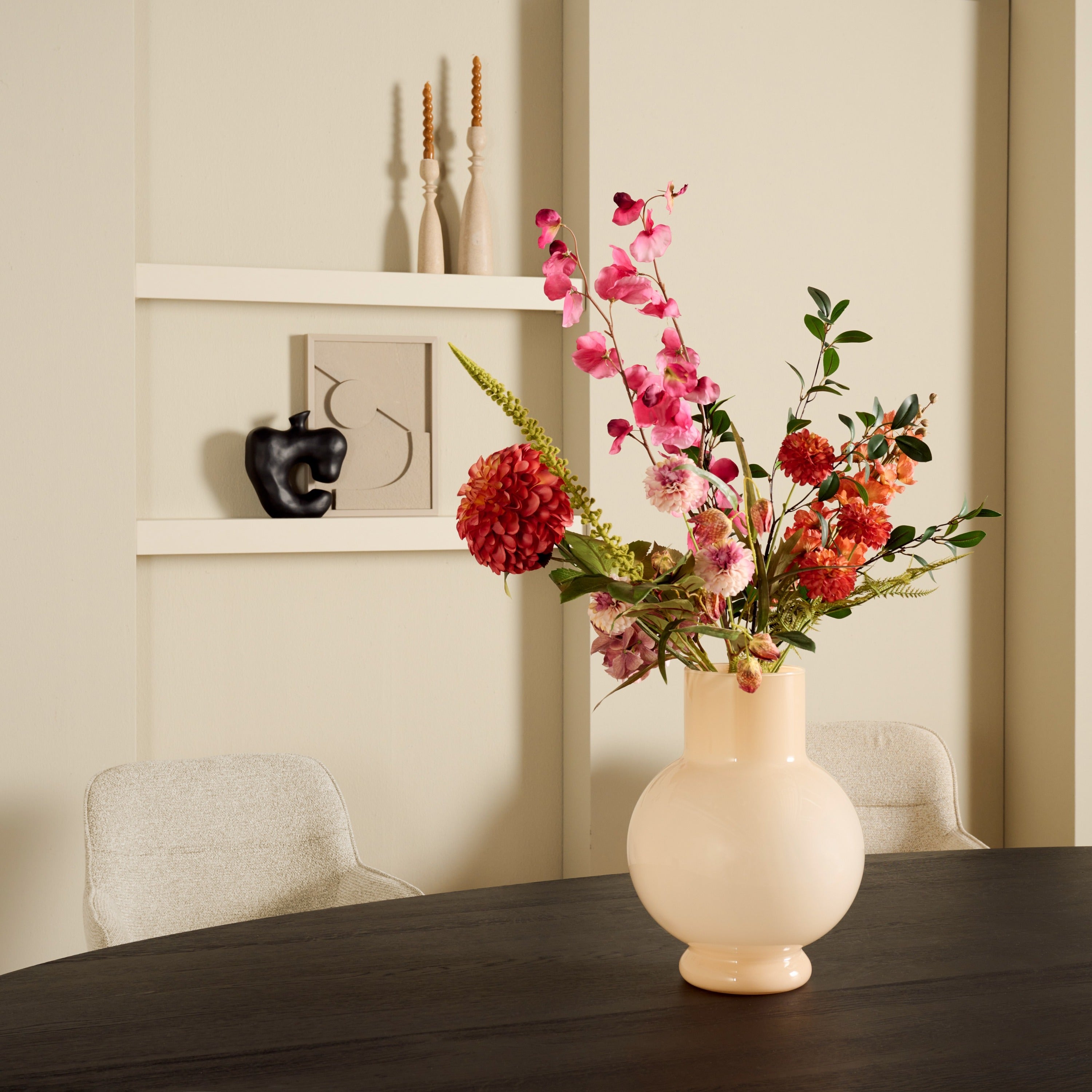 Vaas Deborah is een stijlvol pronkstuk dat zorgt voor sfeer en elegantie. Deze ronde vaas is gemaakt van stevig gekleurd glas, wat zorgt voor een luxe en solide uitstraling. De bolle, ronde buik geeft de vaas een zachte, uitnodigende vorm. Zelfs zonder bloemen is het een mooie blikvanger. Vaas Deborah combineert een modern en tijdloos silhouet, ideaal voor elk boeket of een paar mooie takken. Extra informatie:- afmeting 31x39x31 cm (bxhxd)
