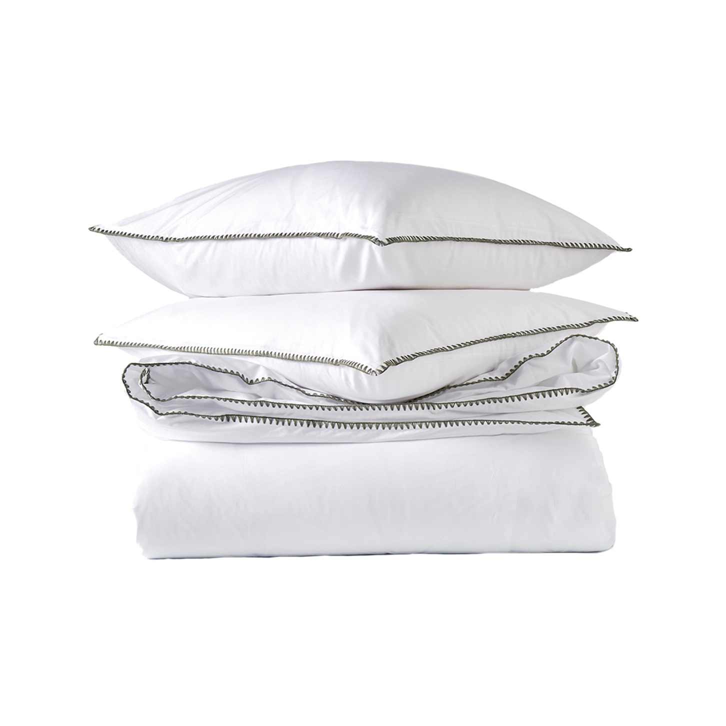 Deze 'Stitches' dekbedovertrekset is gemaakt van koel en fris percal katoen met oog voor detail. Ambachtelijke omlijningen in de kleur olijfgroen. Door het heldere contrast is deze overtrekset dé finishing touch voor de slaapkamer. Sluiting: drukknopen van parelmoer.
