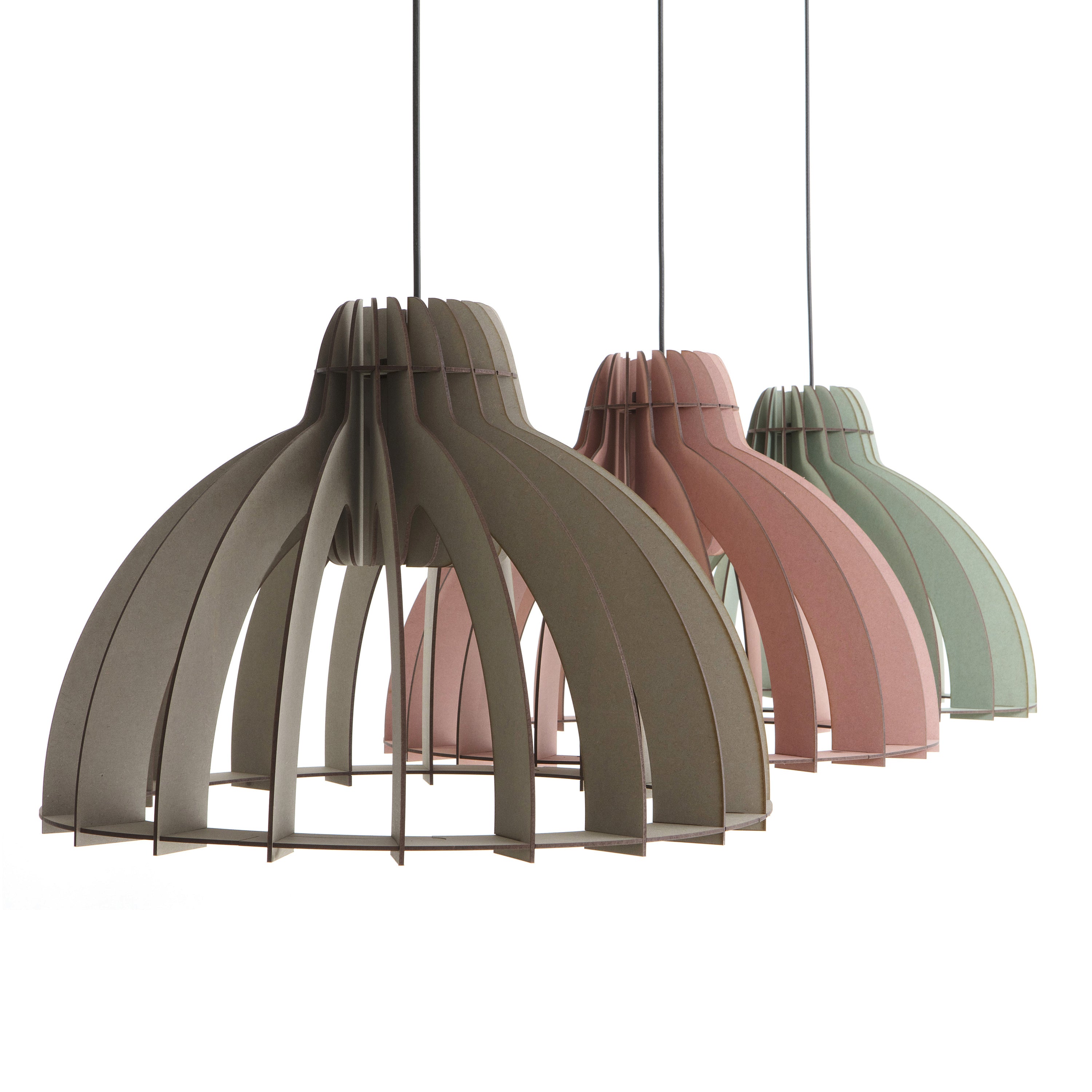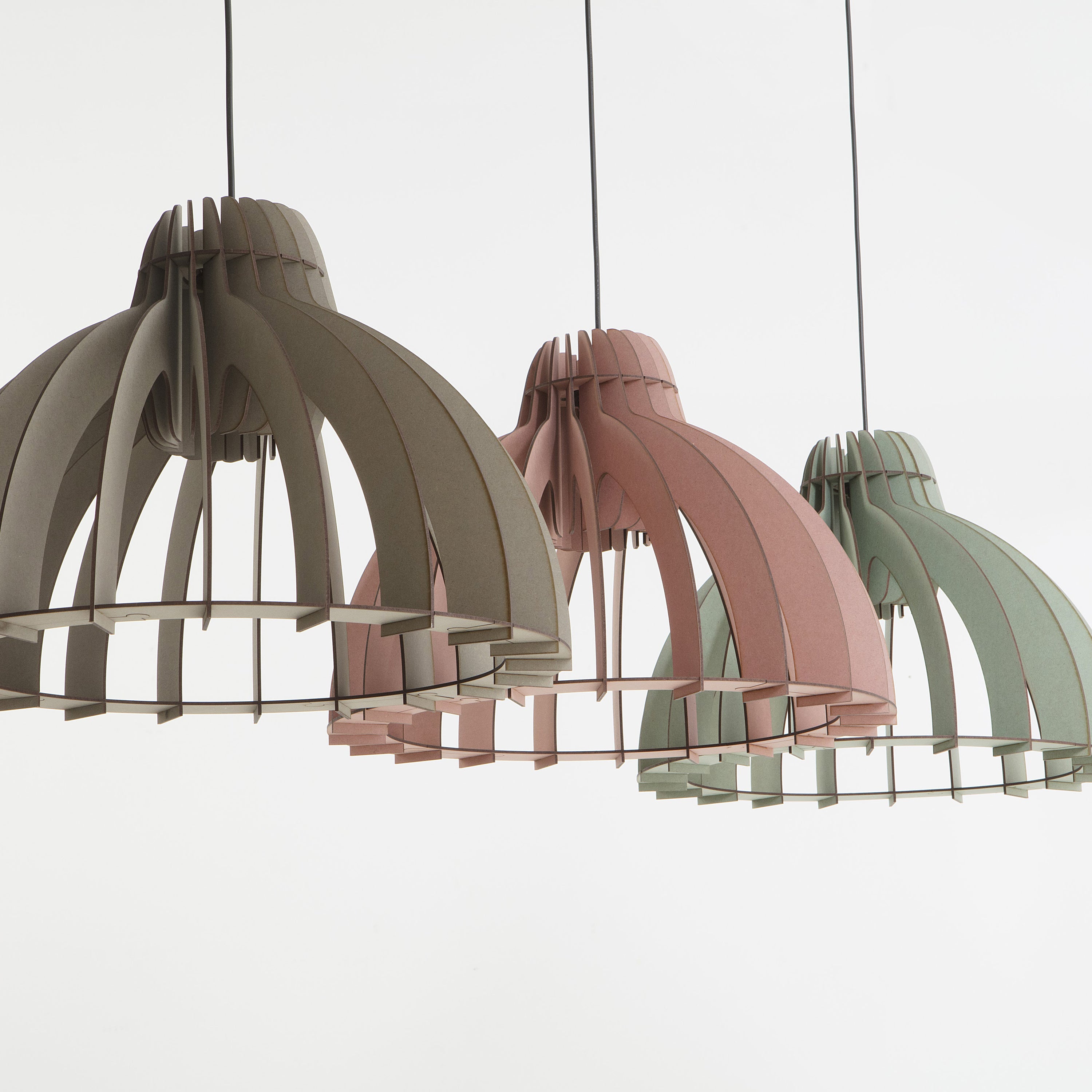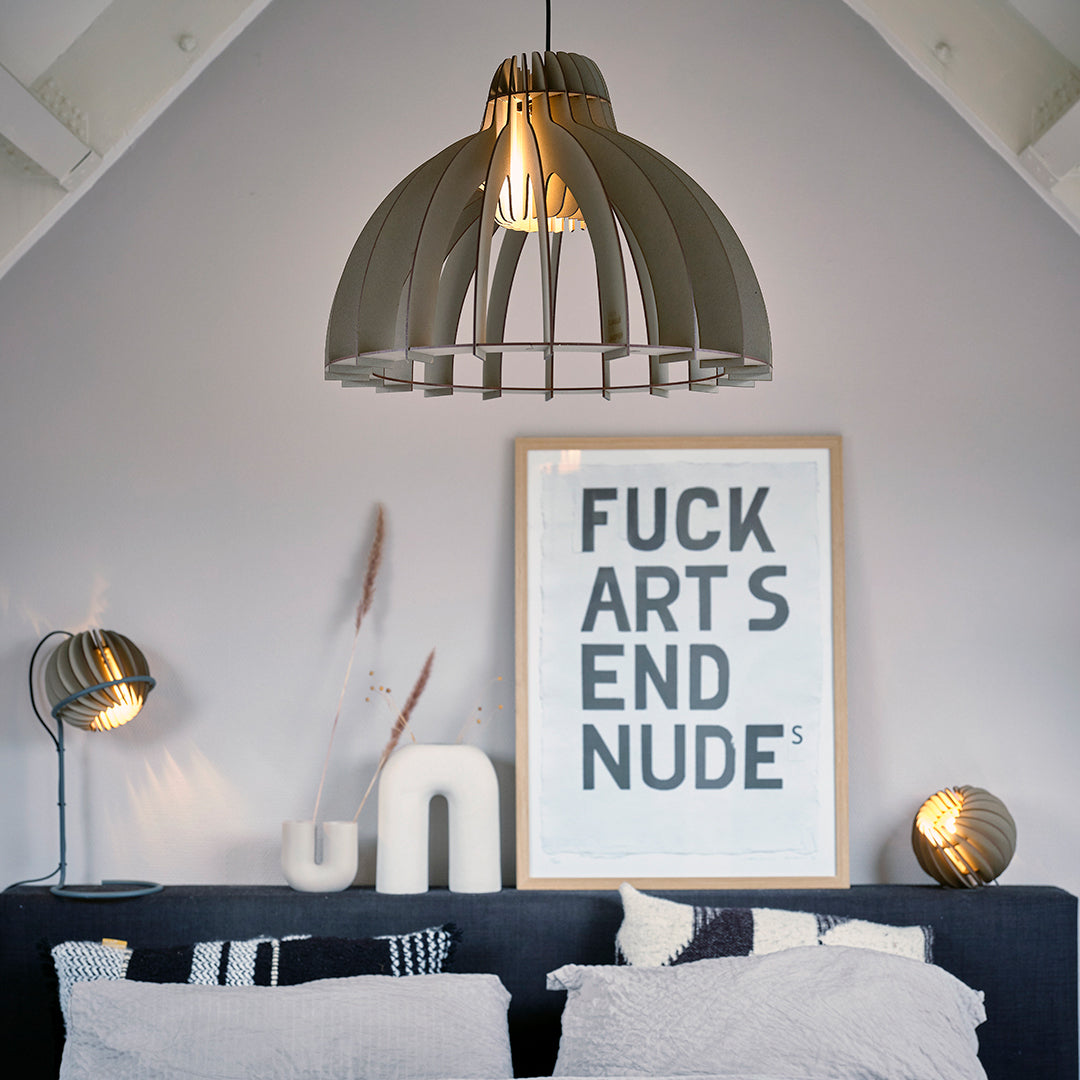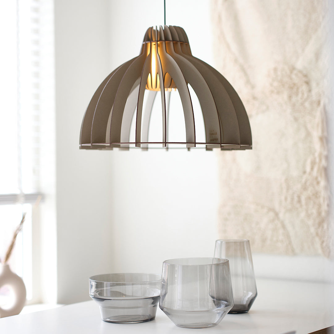 Met een laser gesneden De lamp is gemaakt van onbehandeld, lasergesneden MDF. Hierdoor heeft de lamp donkerbruine randen als gevolg van het lasersnijden. Alle andere onderdelen, zoals de kabel en fitting, zijn zwart en zijn gemaakt van kunststof, staal en koper.