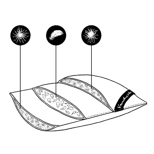 Het Vandyck driekamer hoofdkussen heeft een tijk van 100% katoen en voelt prettig aan. Bovendien is het kussen diervriendelijk geproduceerd en dus met een gerust hart aan te schaffen! Het kussen heeft een vulgewicht van 100 gram (kern) + 2 x 125 gram (onder- en bovenzijde).
