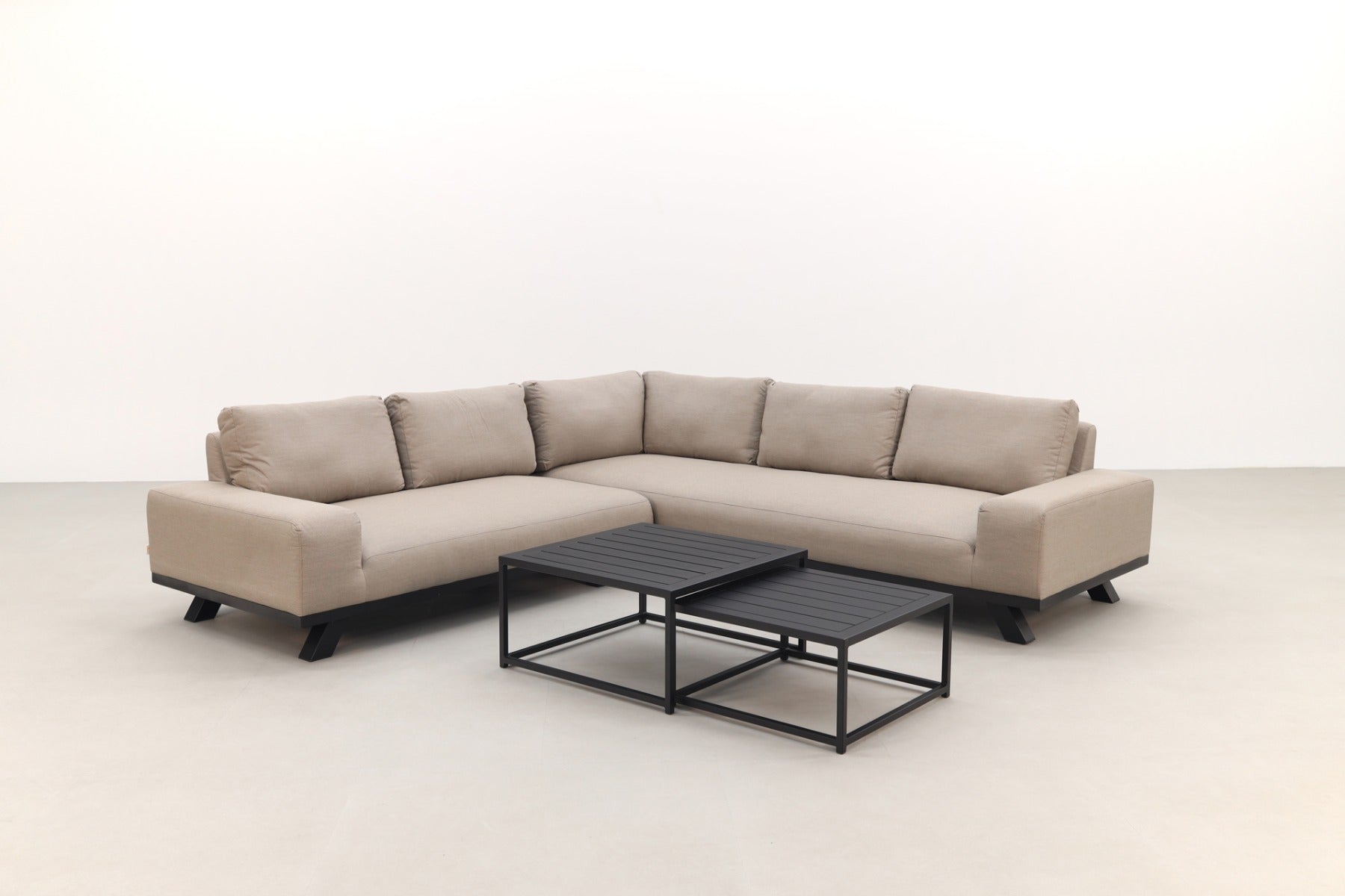 De Barcelona loungeset heeft een stevig aluminium frame welke afgewerkt is met een antraciet kleurige coating. Aluminium heeft als voordeel dat het niet kan verroesten en weinig onderhoud nodig heeft. Daarnaast is het ook nog eens licht van gewicht. Om dit frame is de weerbestendige Sunbrella stof bevestigd. Deze stof is water en vuil afstotend en eenvoudig schoon te maken met water en eventueel een sopje. Het frame van de loungetafel is ook gemaakt van aluminium en heeft een tafelblad van keramiek. Keramiek heeft een hoge krasvastheid en is bestand tegen zowel hoge als lage temperaturen. Hierdoor is het tafelblad perfect geschikt voor buitengebruik.