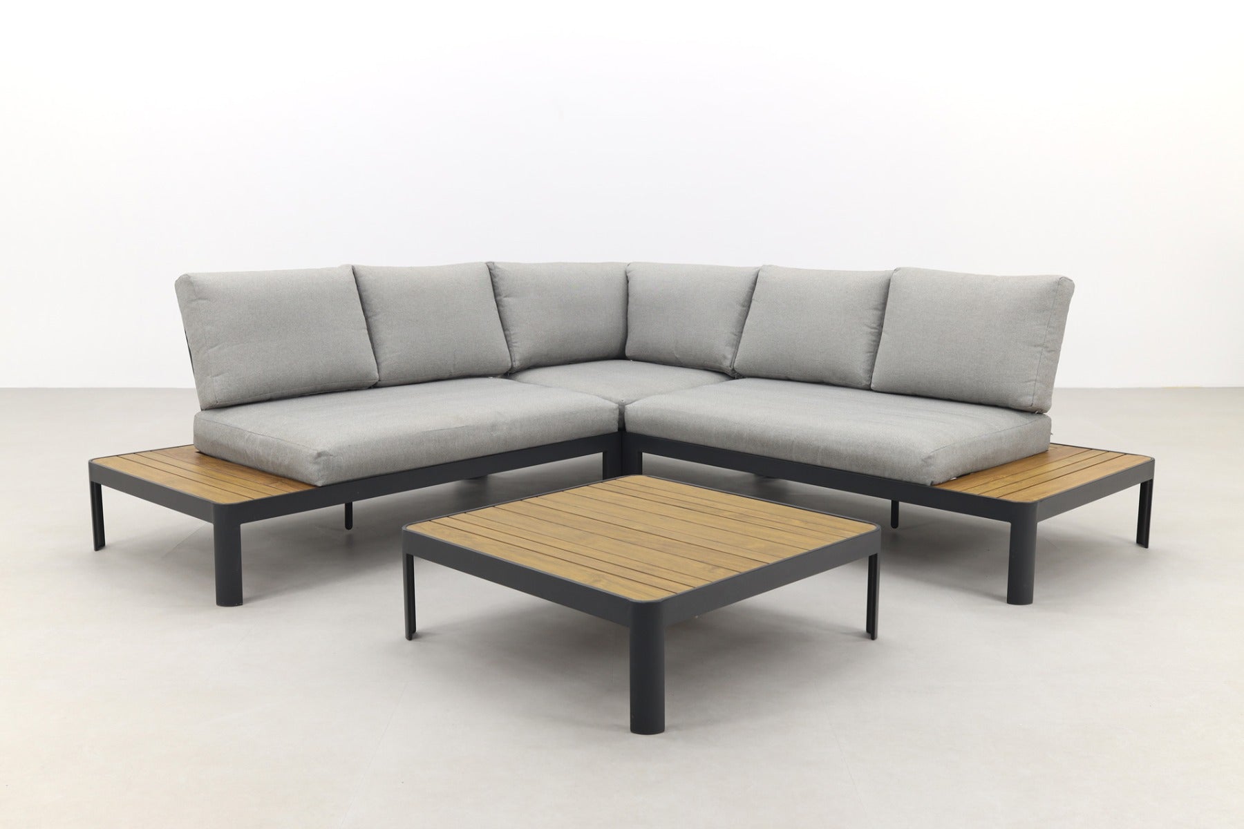 De Bonita loungeset bestaat uit een hoekbank en loungetafel. De loungeset heeft een houtlook print op de tafel en daarmee lekker onderhoudsvriendelijk!