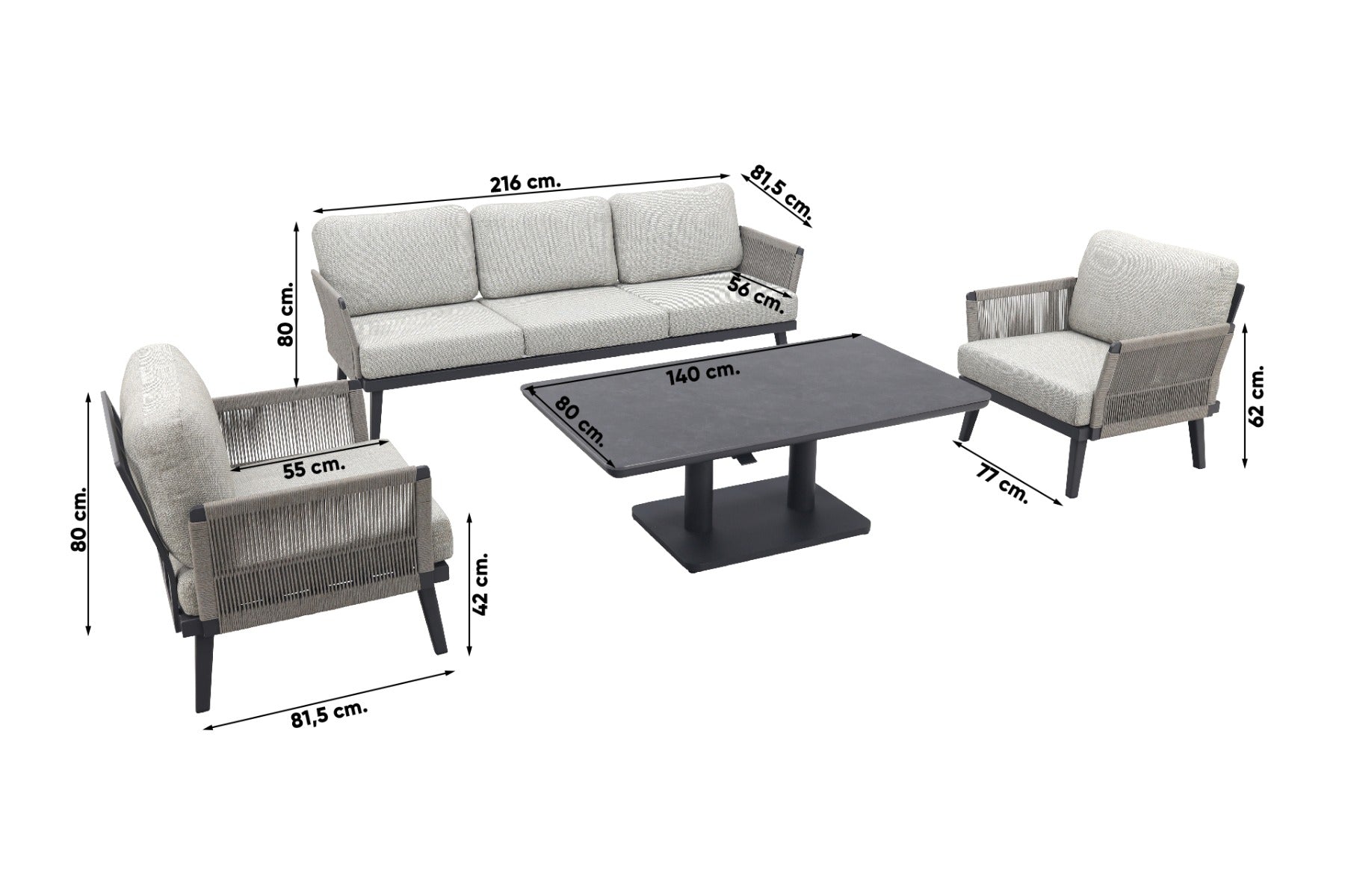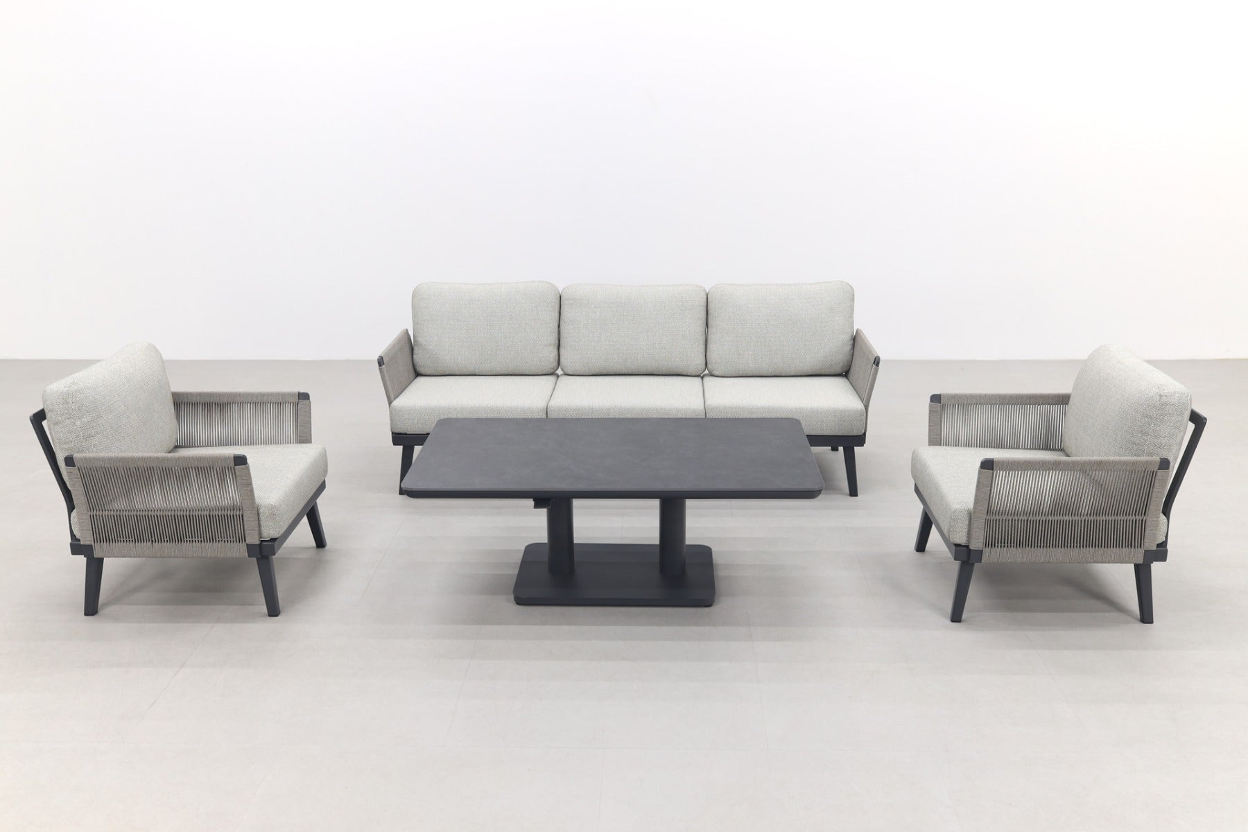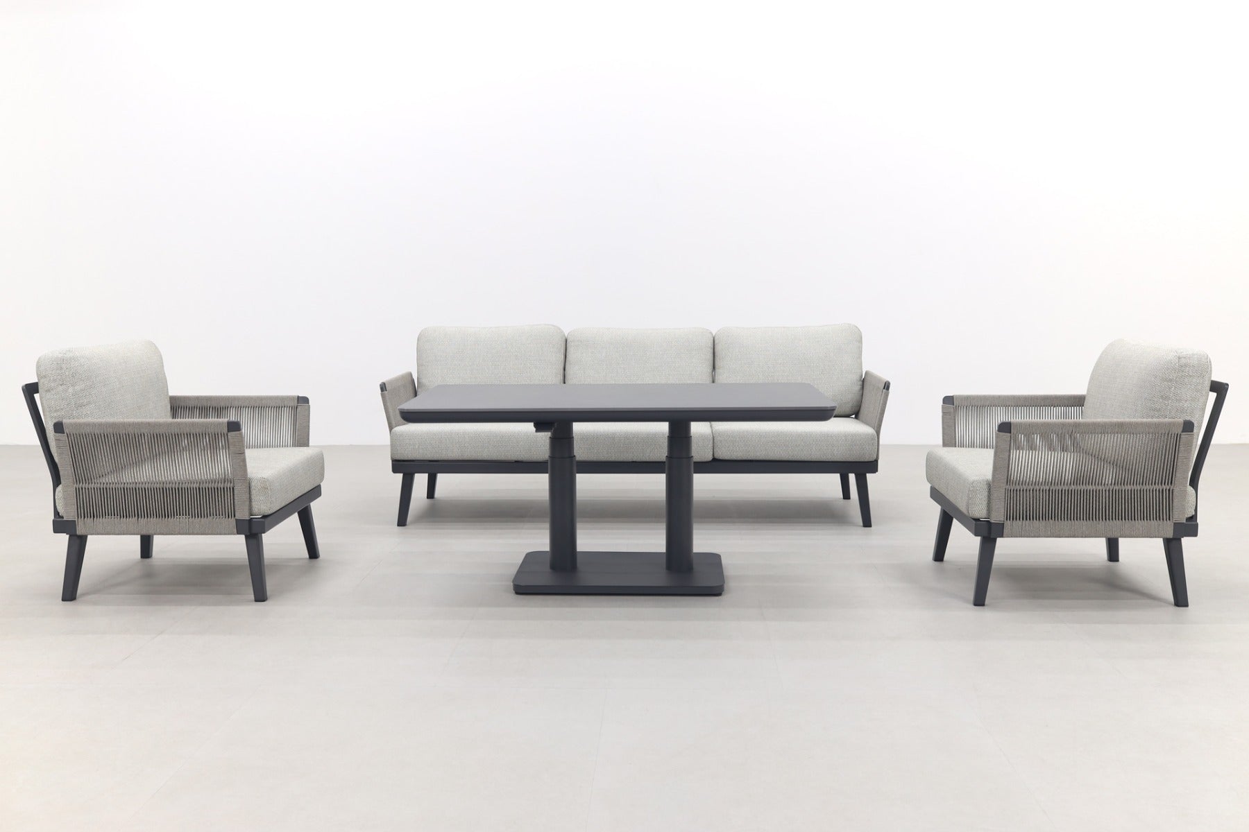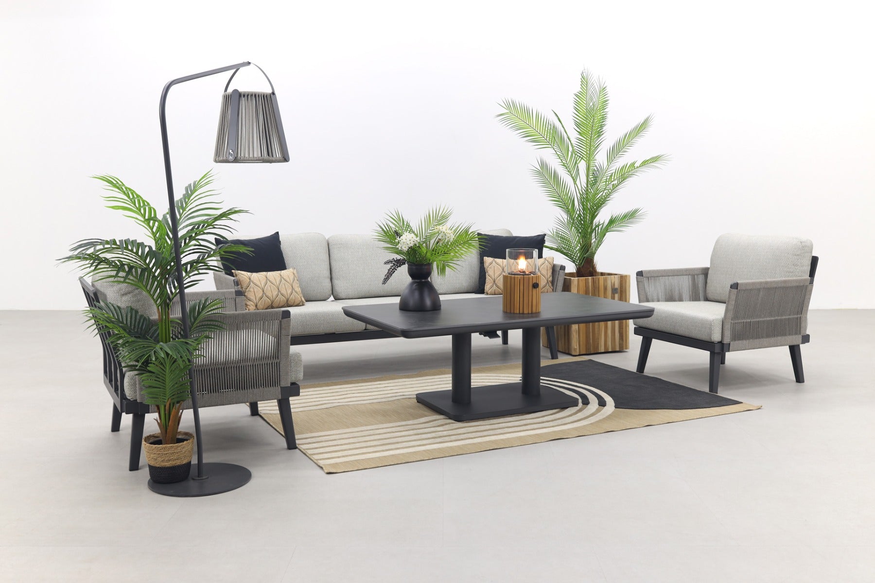 2x Durban loungestoel 1x Durban 3-zits loungebank 1x Medina up&down tafel royal grey