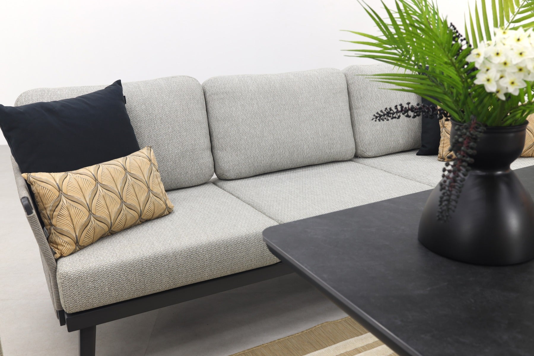 Geniet van ultieme ontspanning met de onze Durban loungeserie. Het frame is gemaakt van aluminium in antracietkleur. Aluminium wordt veel gebruikt in tuinmeubelen door zijn positieve eigenschappen. Zo is aluminium licht van gewicht, roestbestendig en gaat het lang mee. Zo is het niet alleen een prachtige keuze, ook een duurzame. De armleuningen zijn voorzien van een rope motief. Dit geeft een moderne uitstraling aan deze loungemeubels. Deze serie bestaat onder andere uit loungestoelen, loungebank en een hoekbank. Door de licht grijze kussens ben je voorzien van een heerlijk zitcomfort waardoor je graag gaat zitten.