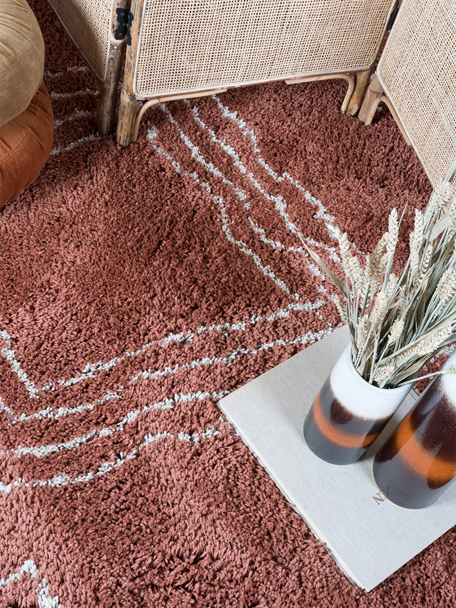 - Het hoogpolige karpet is voorzien van een origineel, speels berberpatroon