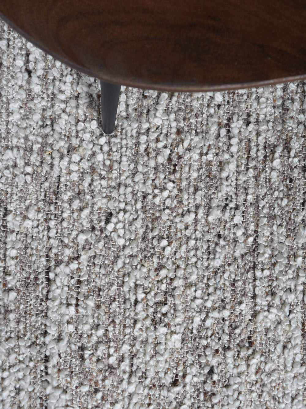 - De structuur bestaat uit fijne lusjes en een geweven design, met verschillende beige en bruine tinten, wat zorgt voor een subtiele textuur en een