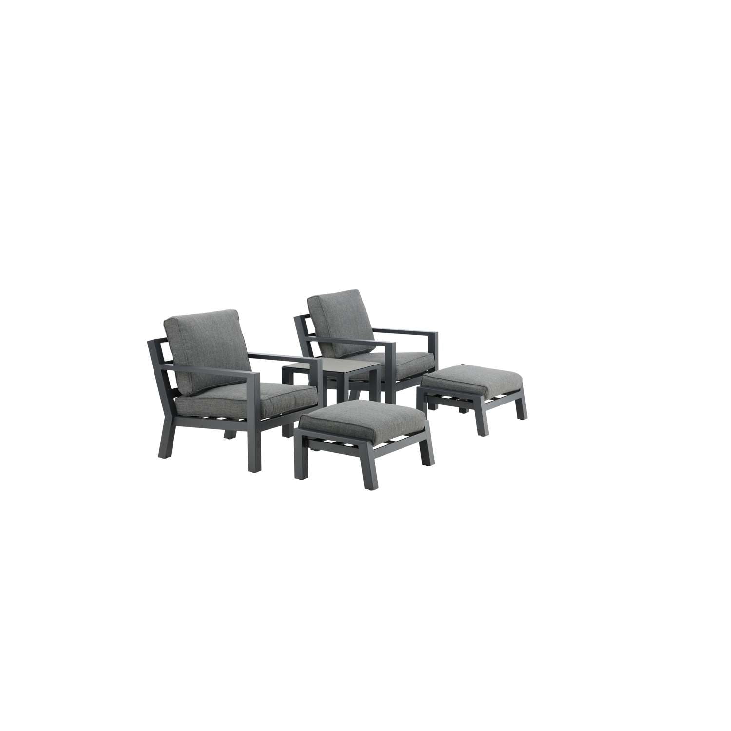 - Bestaande uit twee loungestoelen in een stevig ontwerp van zwart aluminium en een bijbehorende tafel met een blad van stijlvol glas