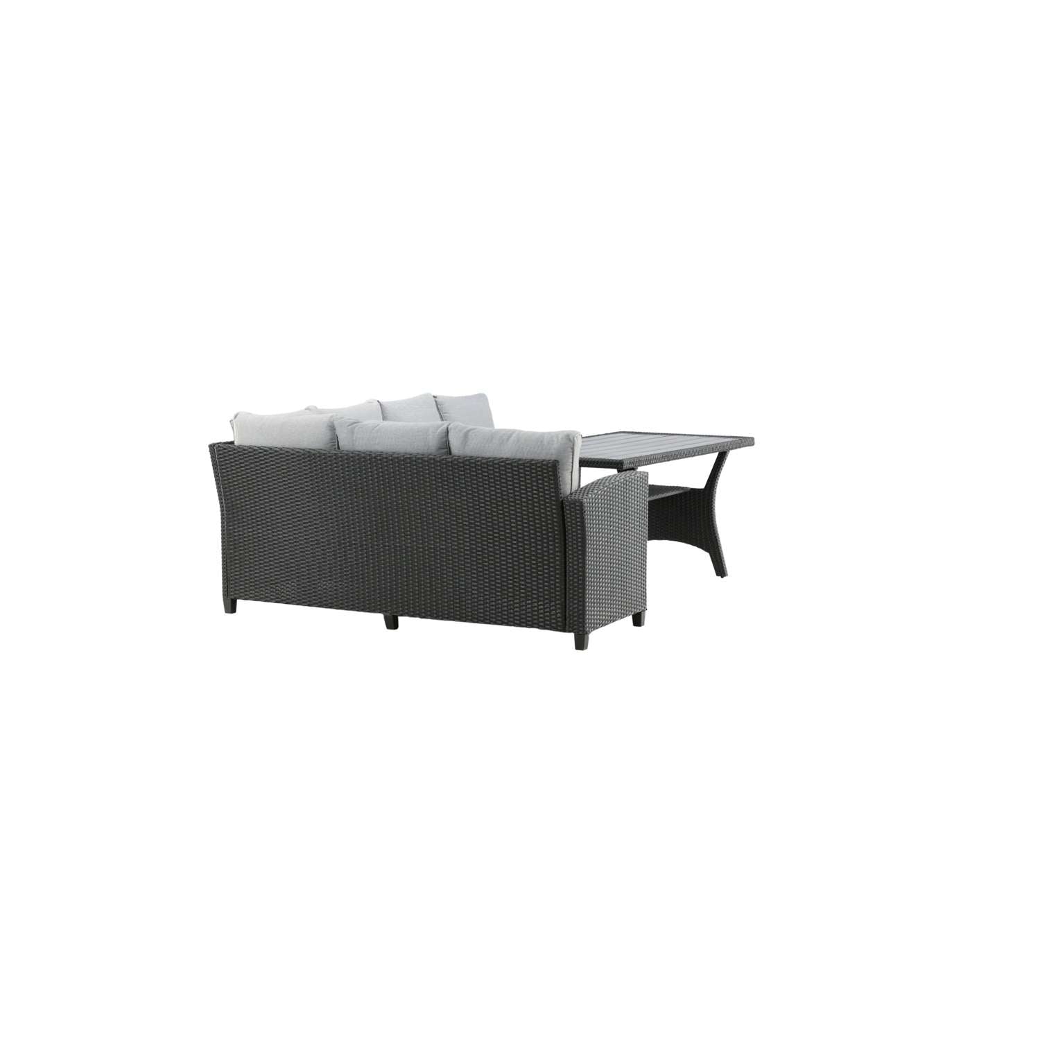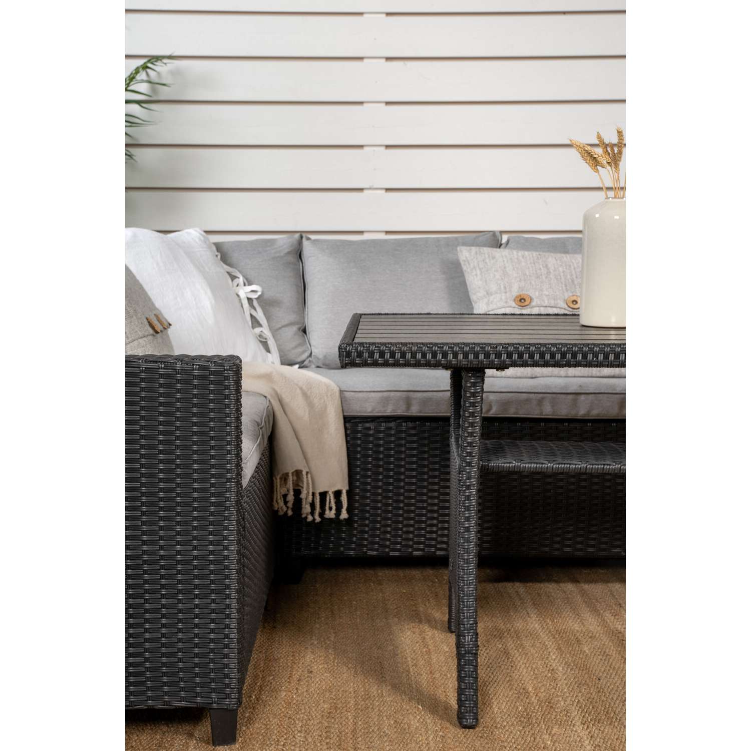 Brentwood loungeset 2 delen grijs,zwart. Hoekbank breedte korte zijde cm: 167. Breedte lange zijde cm: 176. Diepte cm: 67. Hoogte cm: 73. Zithoogte cm: 47. Eetkamertafel hoogte cm: 67. Lengte cm: 145. Breedte cm: 75. Tafel: Hout,Rieten meuble. Bank: Rieten meuble,Polyester.