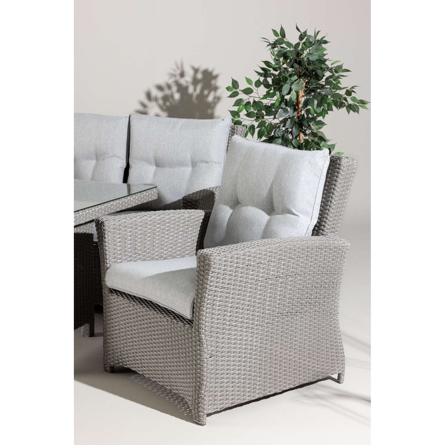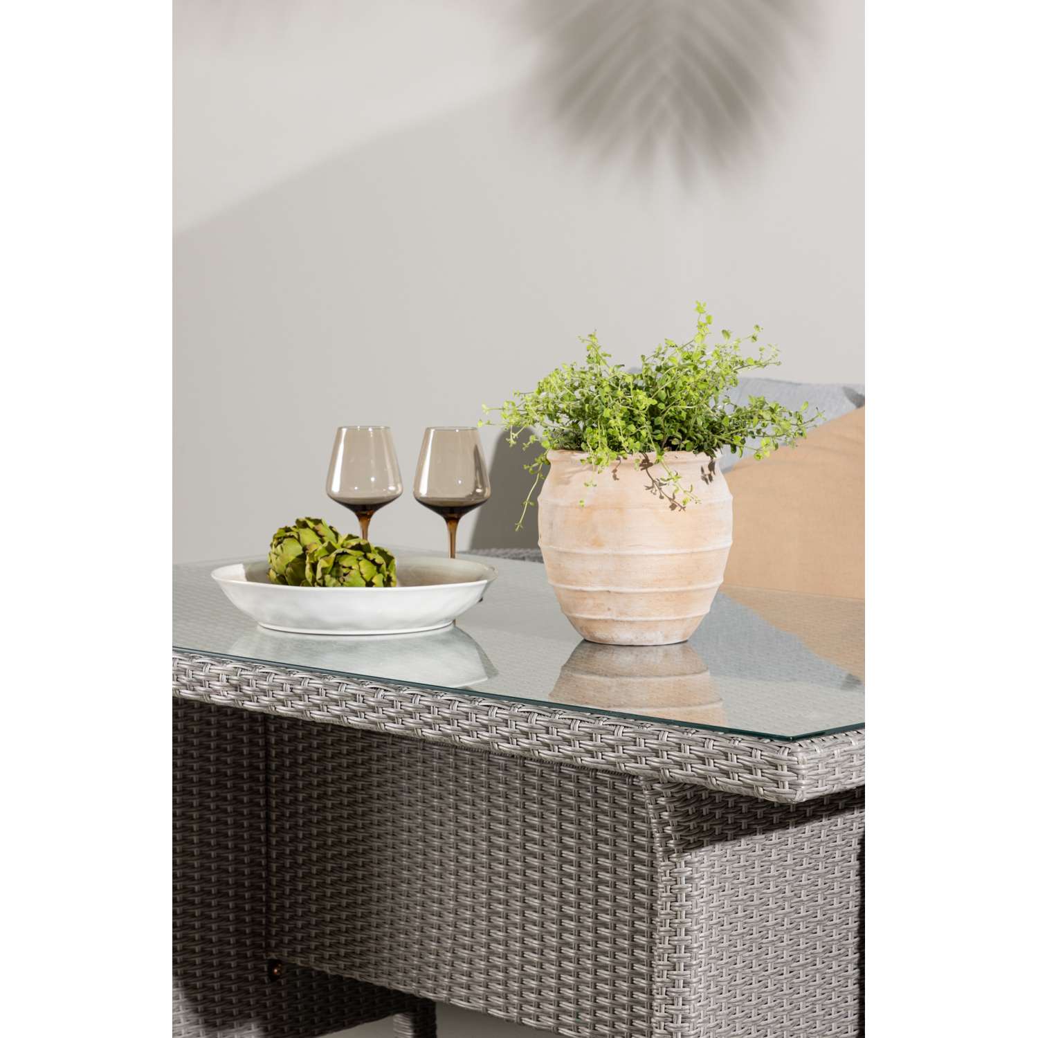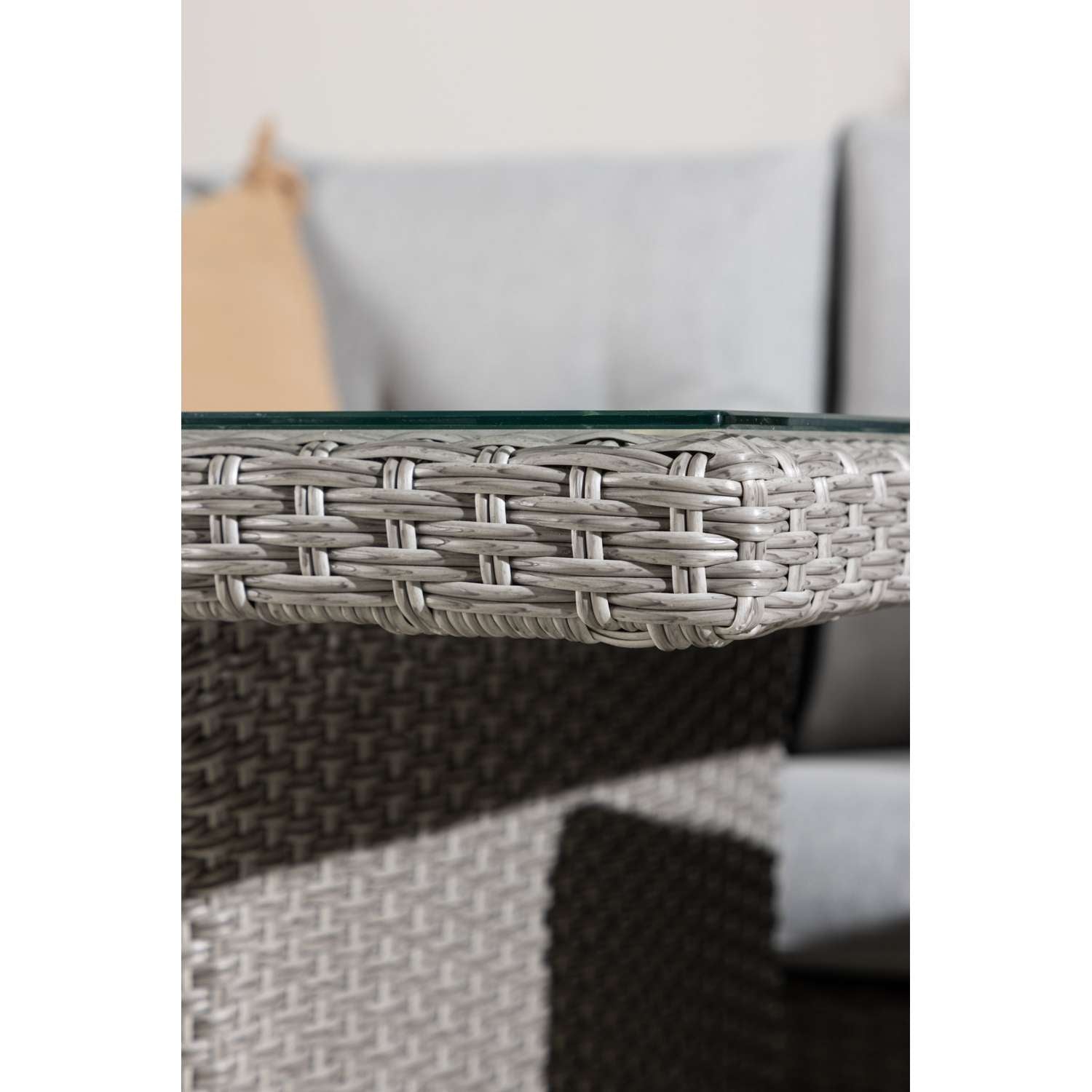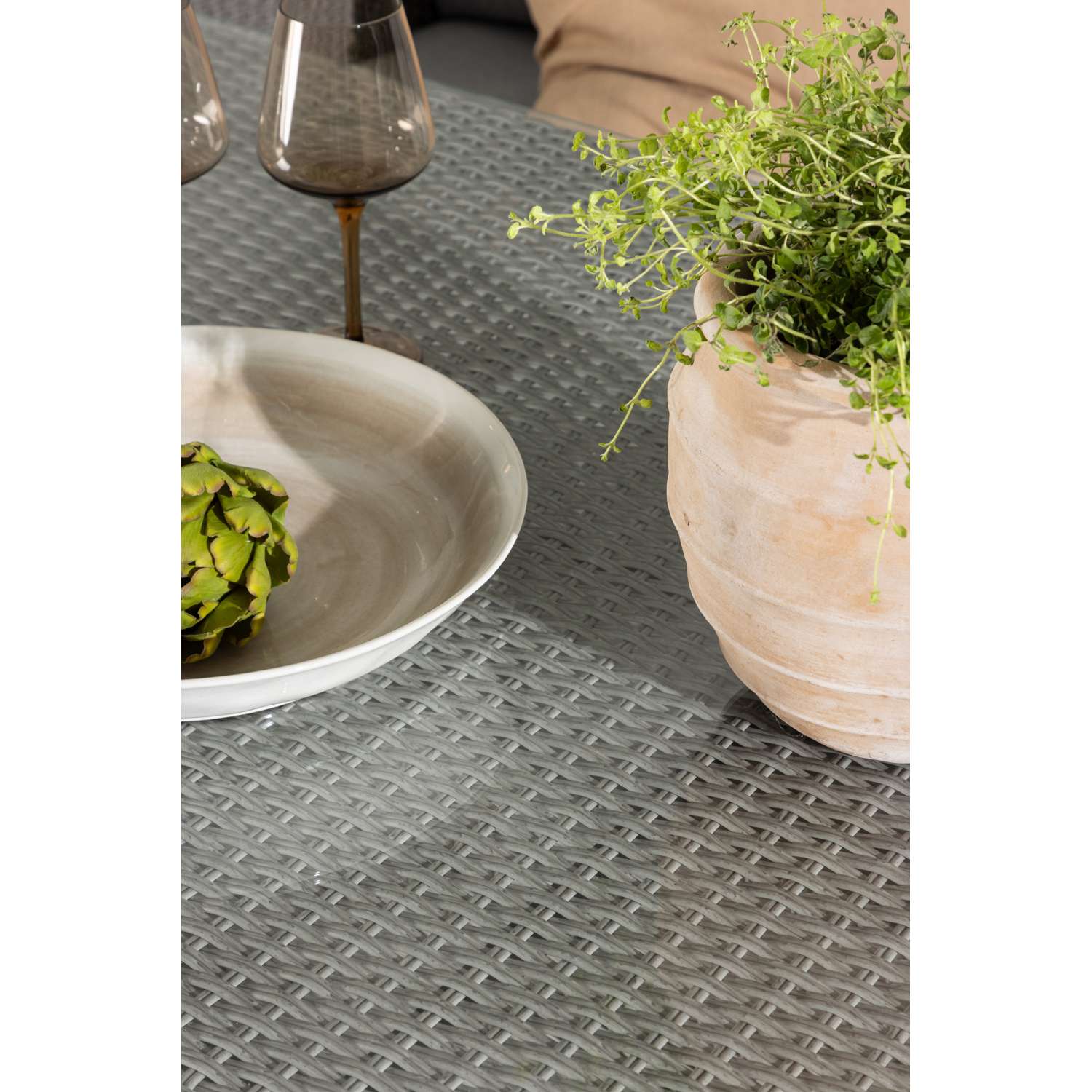- De bank is gemaakt van grijs kunstrotan en de tafel is gemaakt van zwart kunstrotan met een tafelblad van zwart aintwood