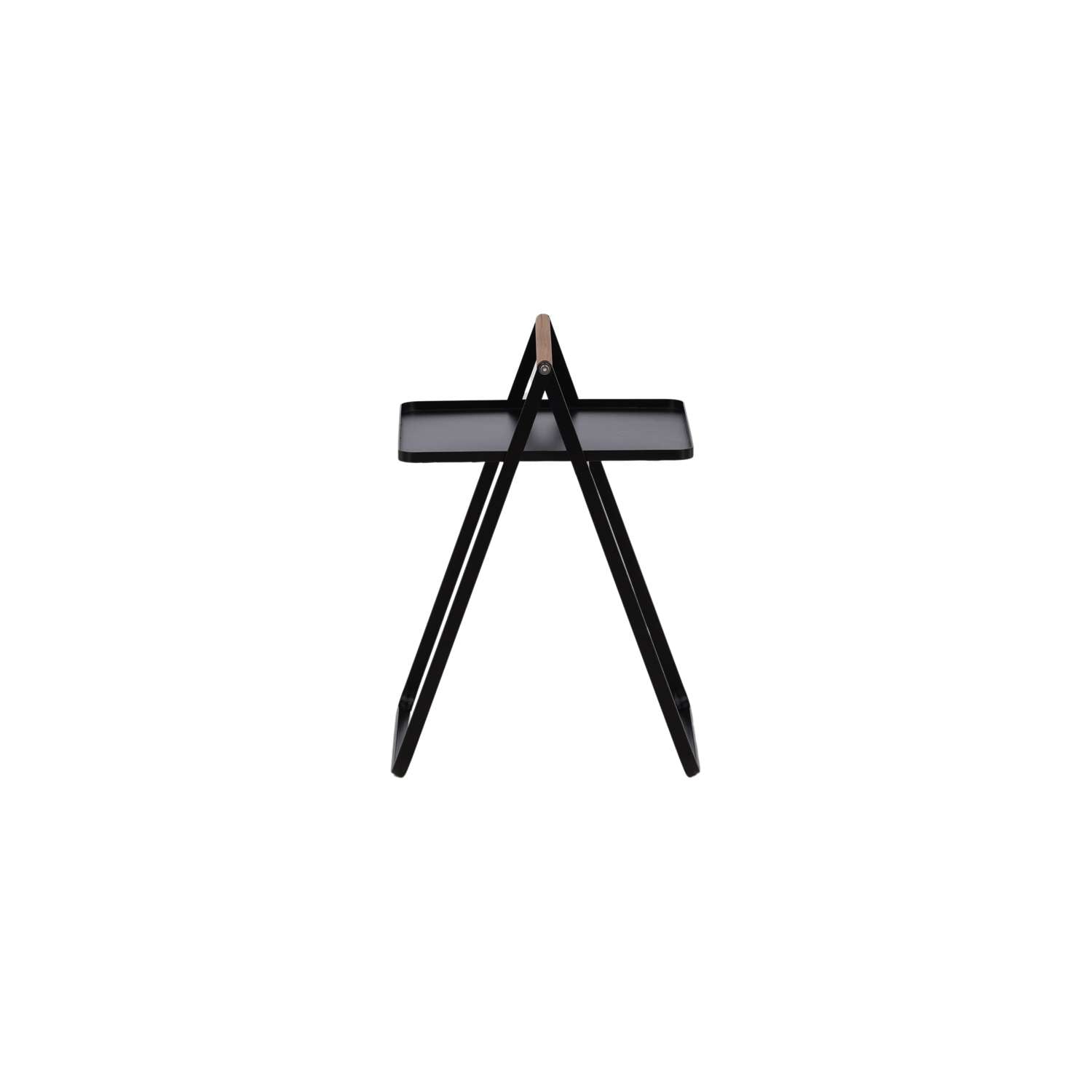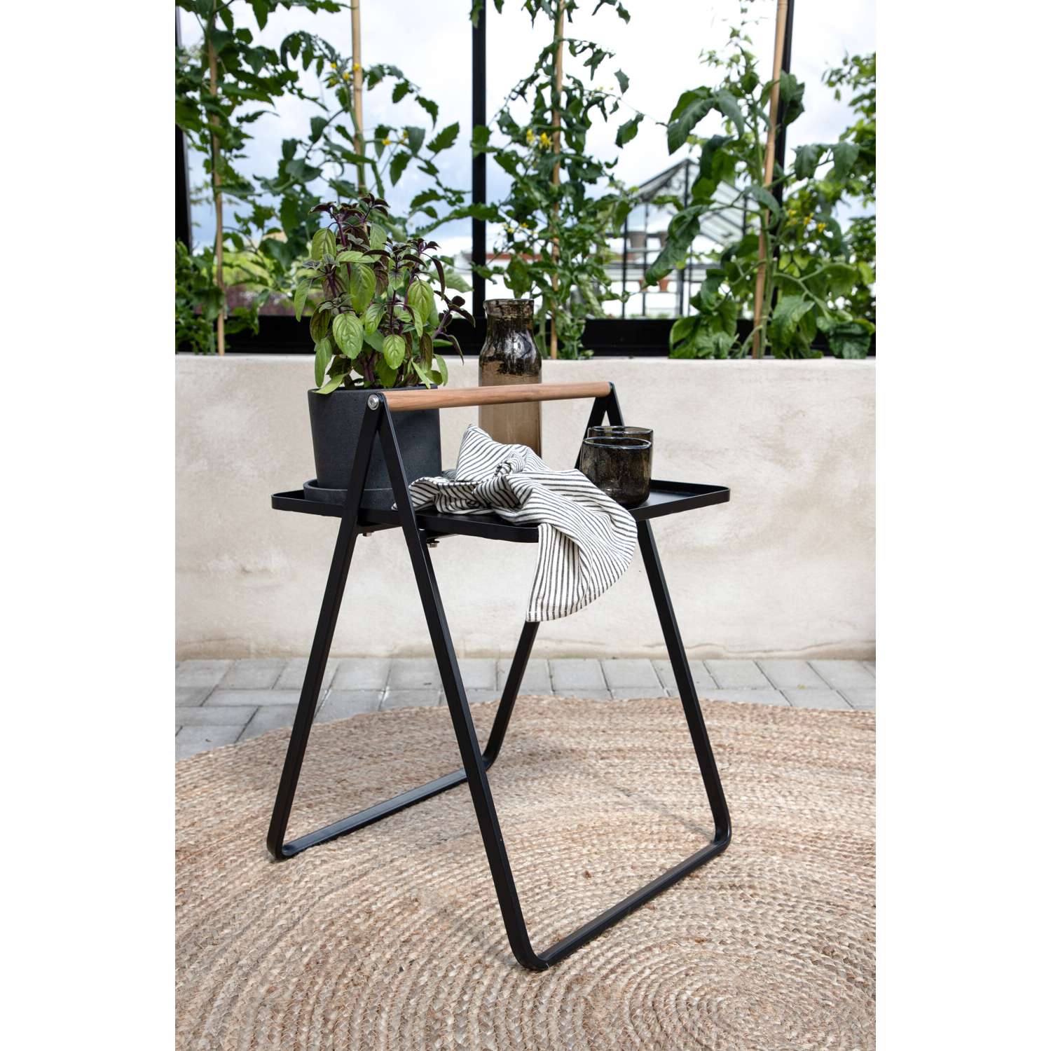 Clarin - de perfecte bijzettafel voor de ontspannen momenten van de zomer! Deze elegante bijzettafel van zwart staal heeft een vierkant tafelblad en slanke poten die naadloos overgaan in een handvat aan de bovenkant, gemaakt van decoratief teakhout