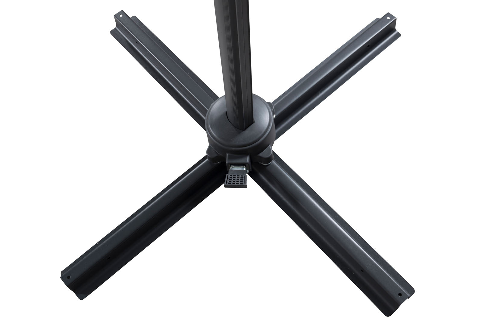 Leeds is onze robuuste parasol in rokerig zwart, die om zijn eigen as kan draaien en een zwarte standaard heeft