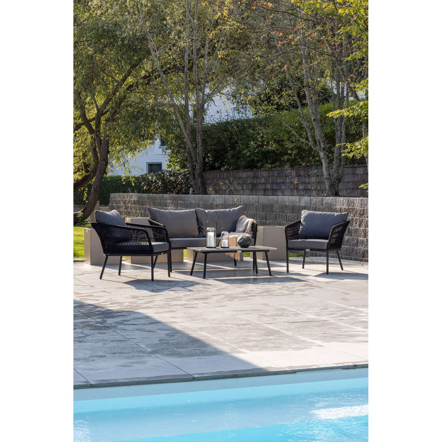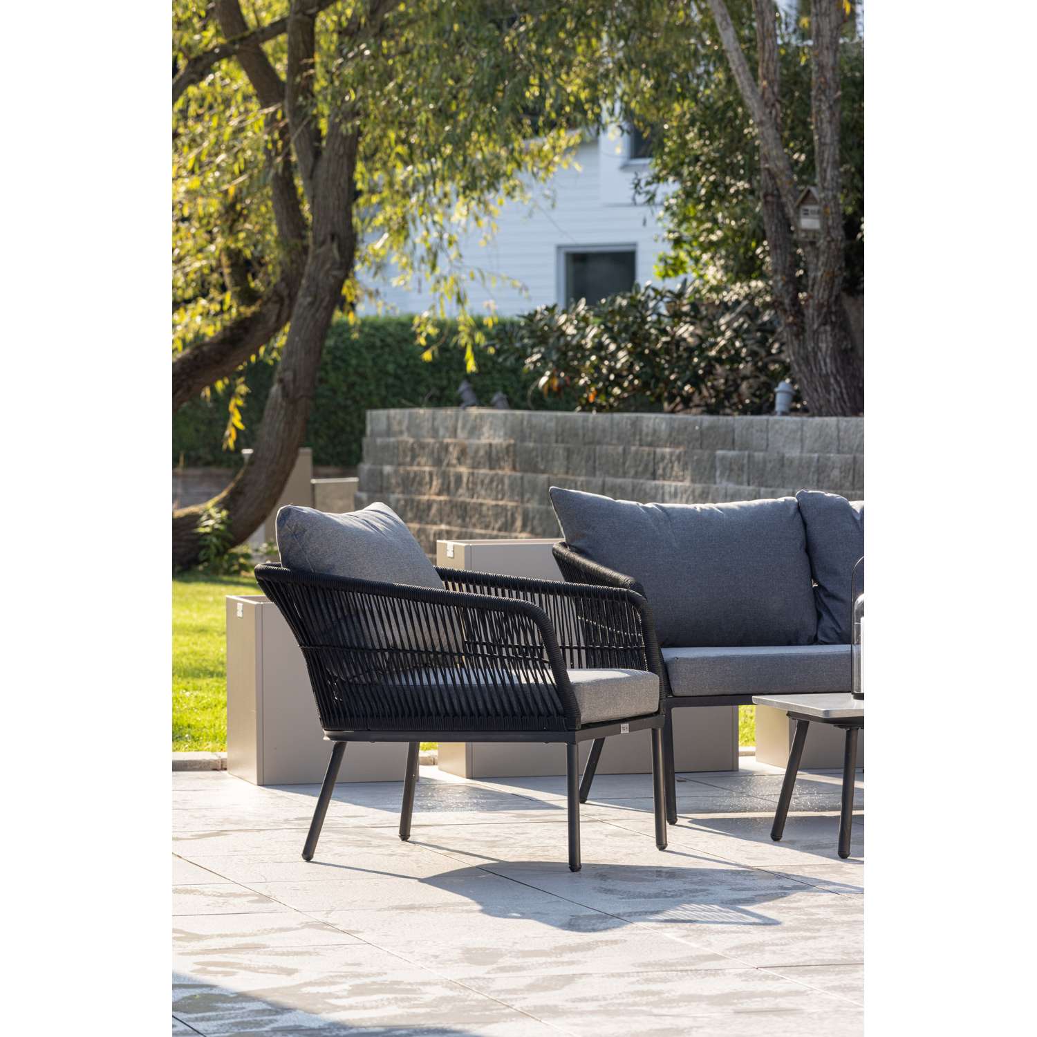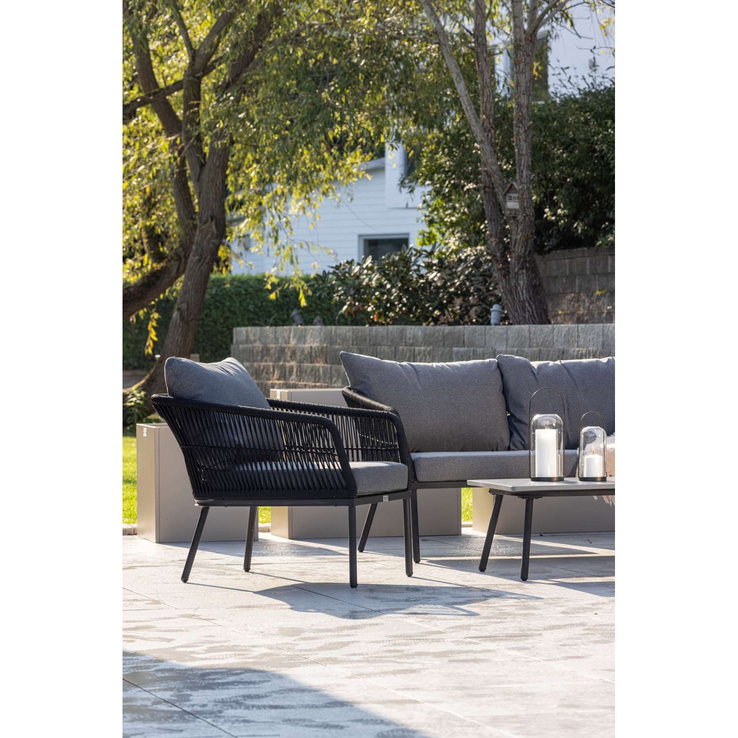 - De set bevat een tweezitsbank en twee fauteuils met een zwart metalen frame, zwarte touwdetails in de rugleuning en zachte, dikke grijze kussens.