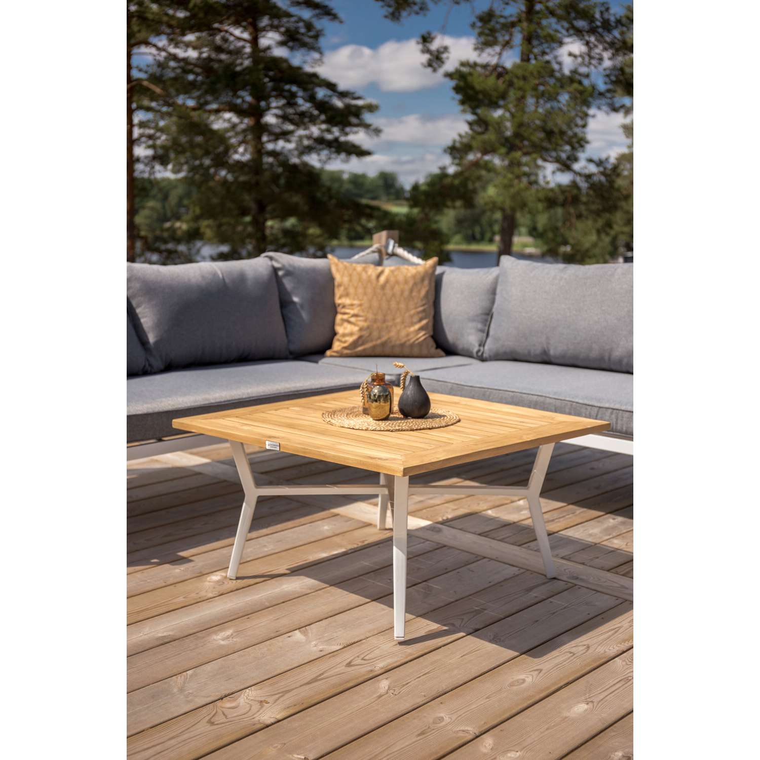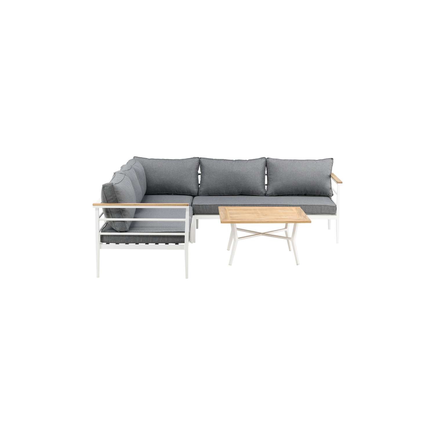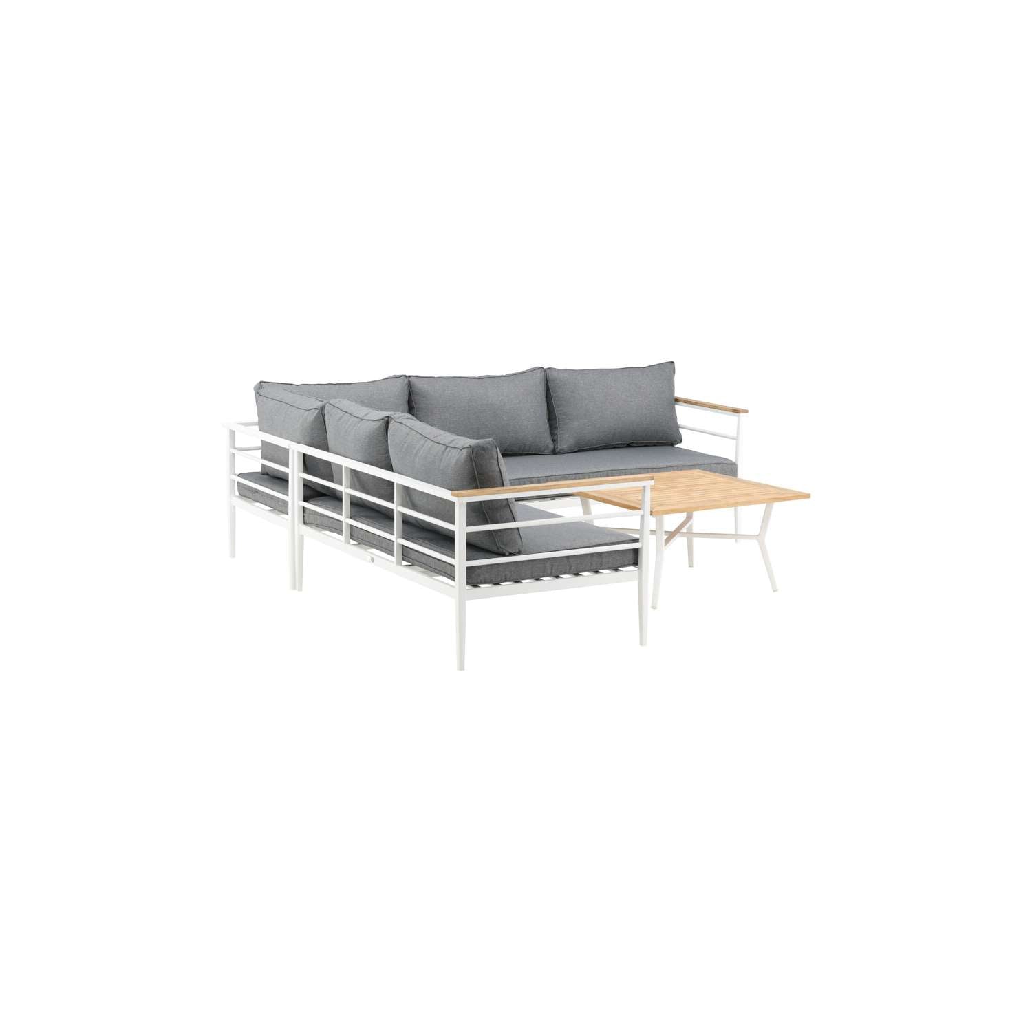 - De hoekbank is gemaakt van een wit gepoedercoat metalen frame en heeft geïntegreerde armleuningen met mooie teakhouten details