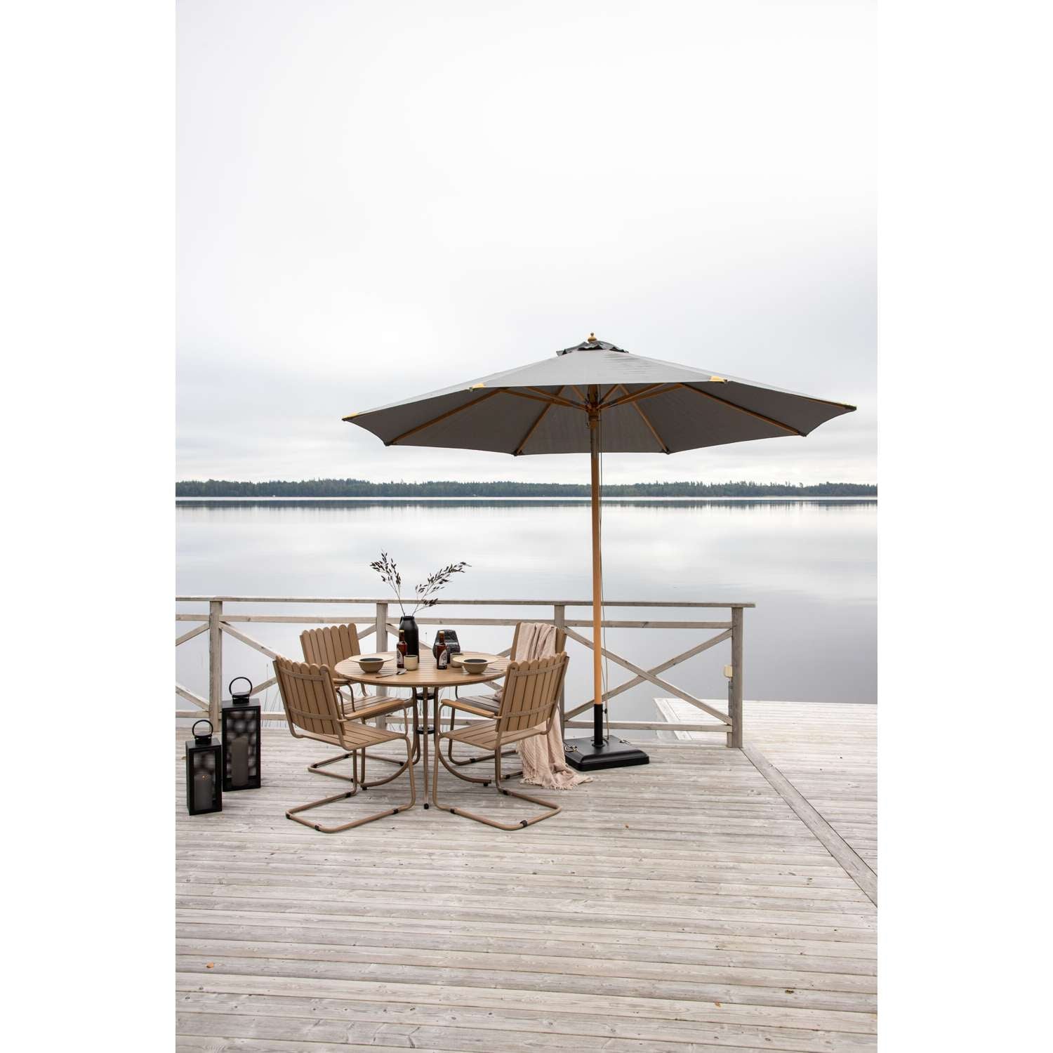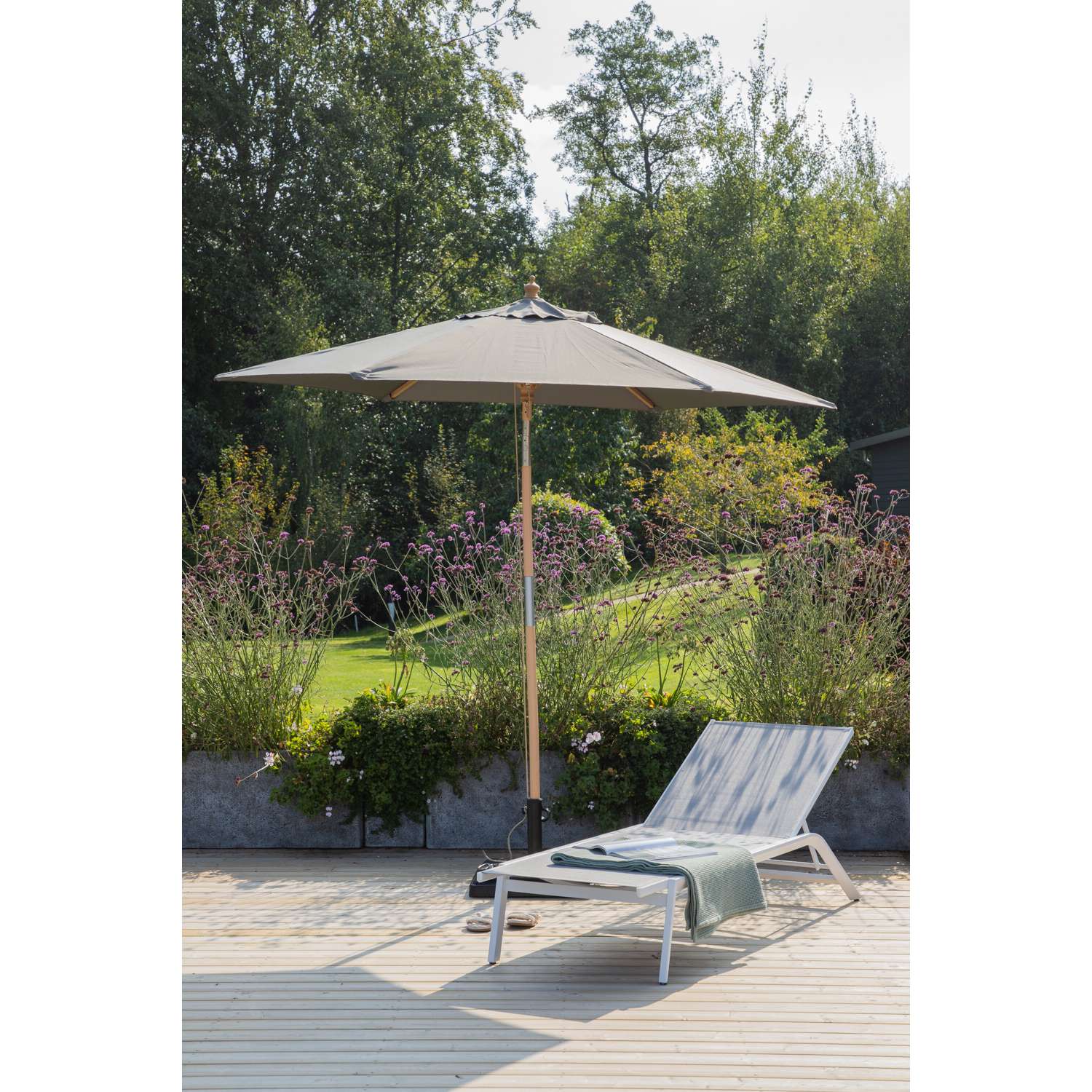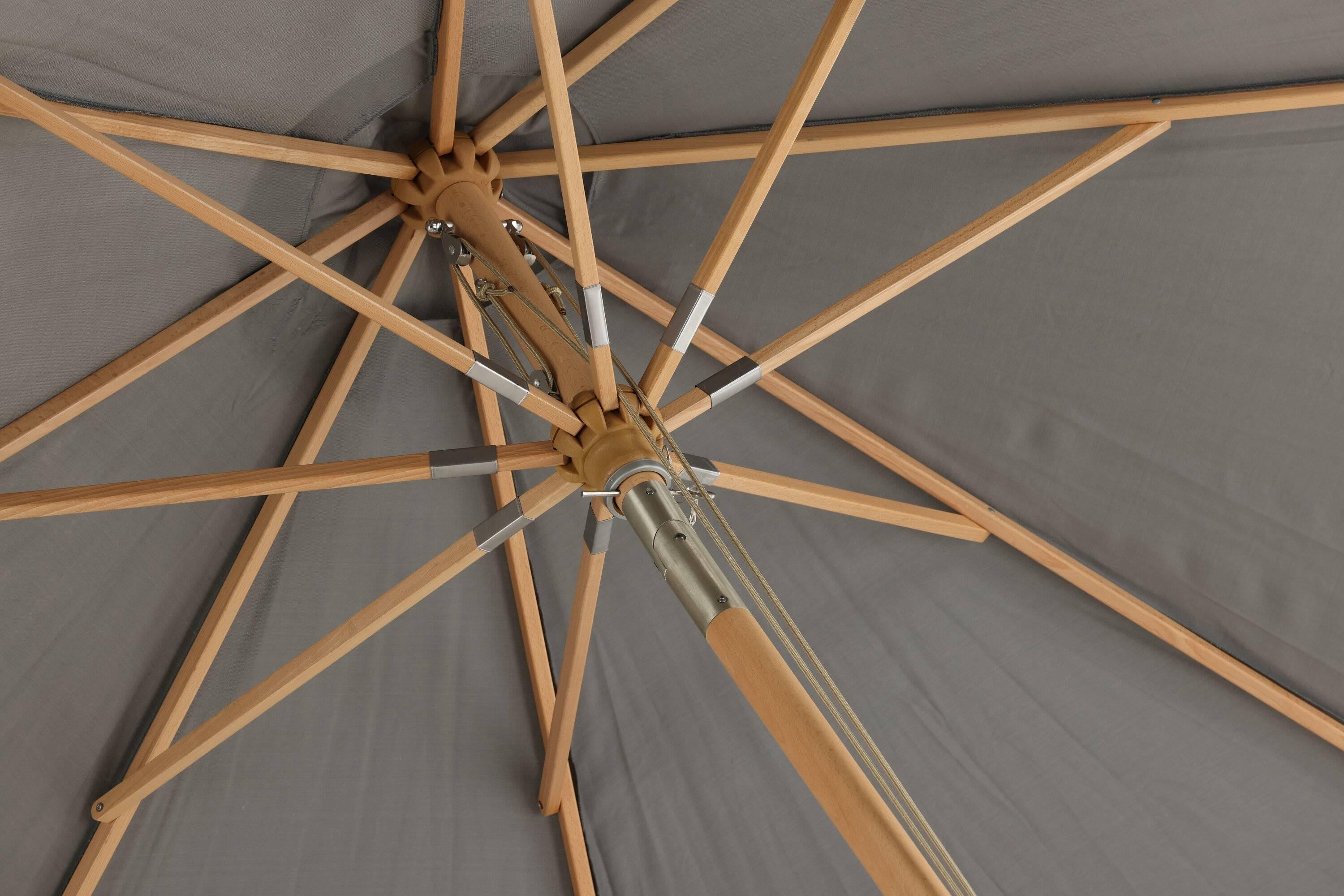 - Deze inklapbare parasol met grijze stof en houten frame heeft een moderne en tijdloze uitstraling die perfect past bij elk huis en iedere tuinstijl.