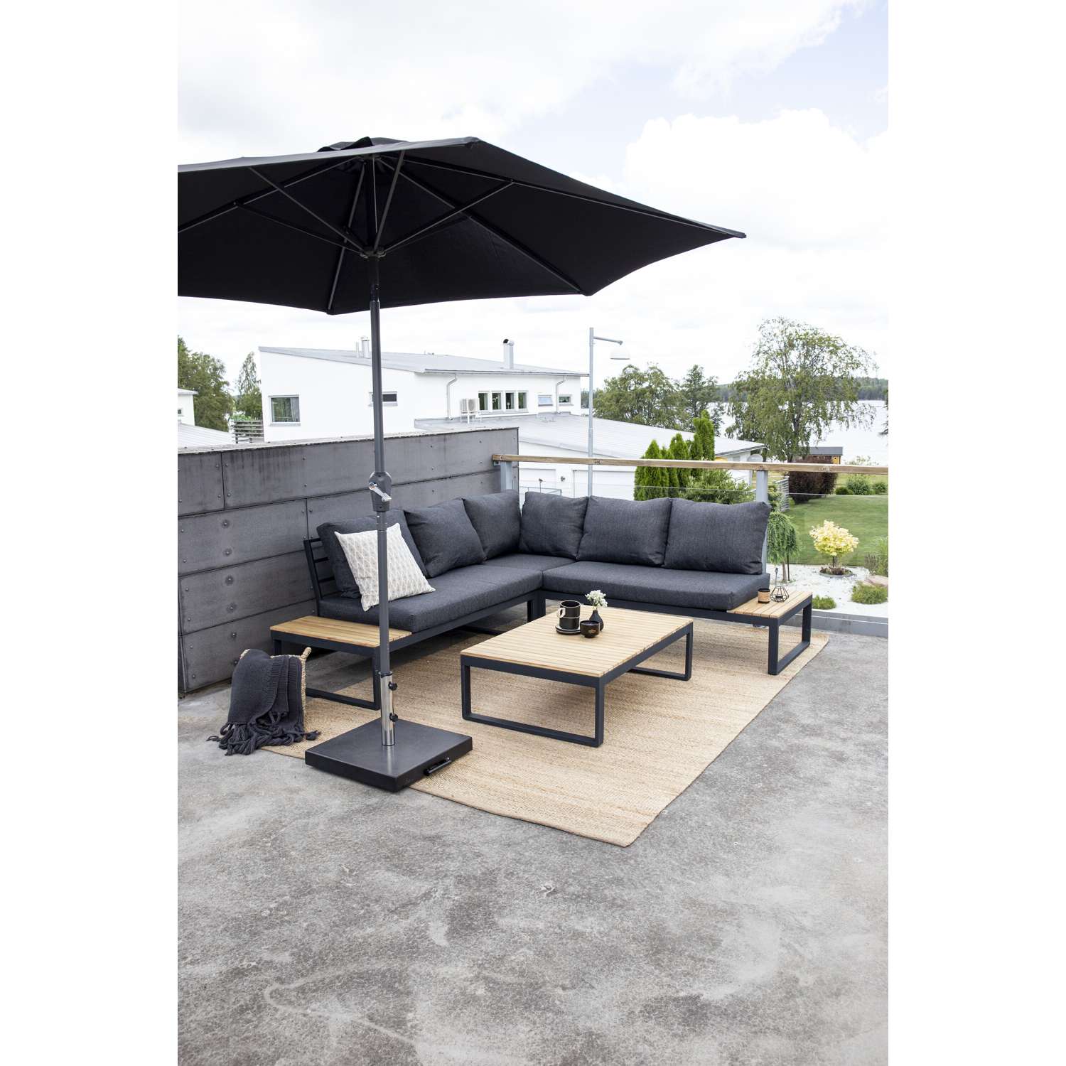 - De bank heeft twee vaste bijzettafels gemaakt van een zwart poedergecoat metalen frame en acaciahouten tafelbladen
