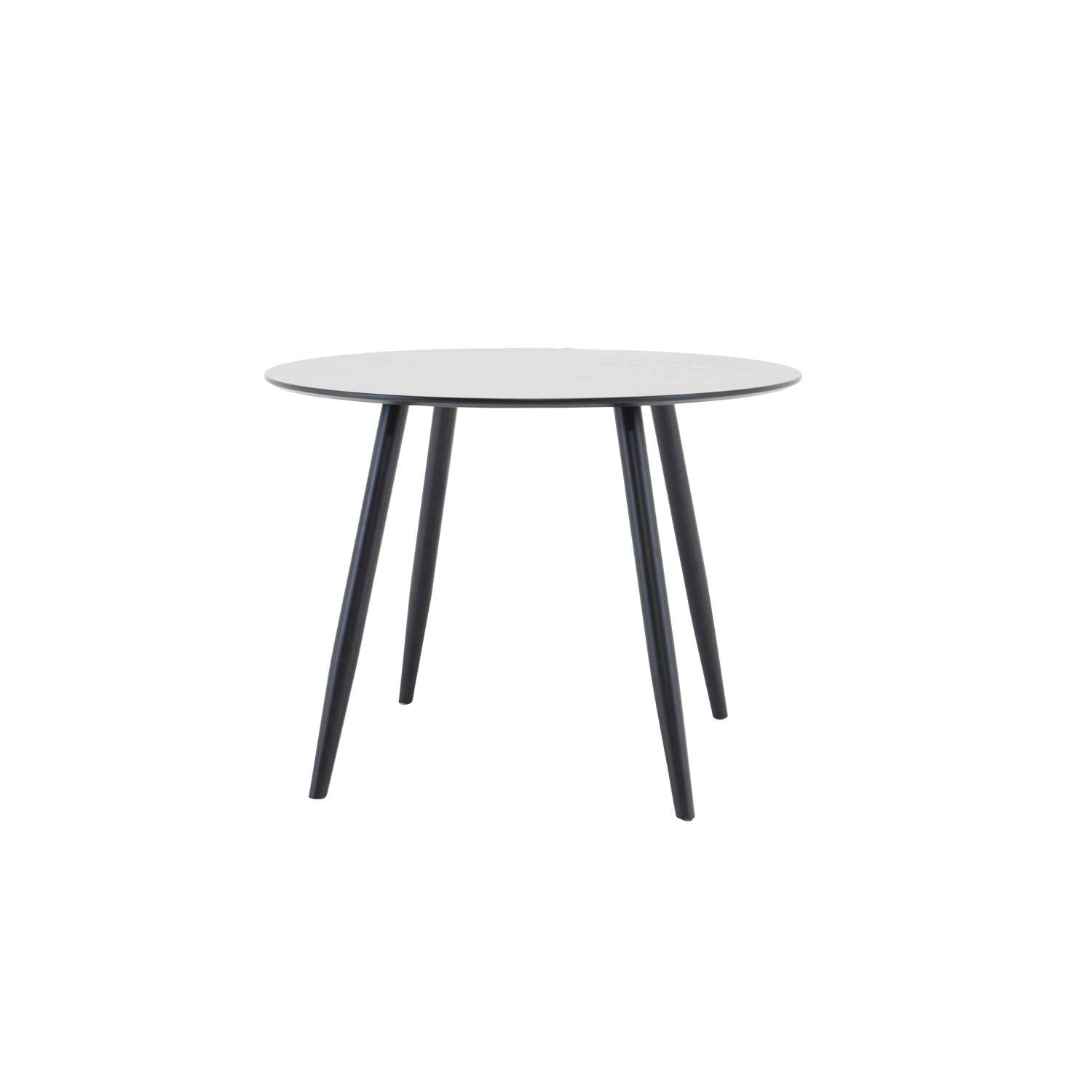 Ronde eettafel met een tafelblad van MDF en metalen tafelpoten, met een decoratieve messing sluiting.